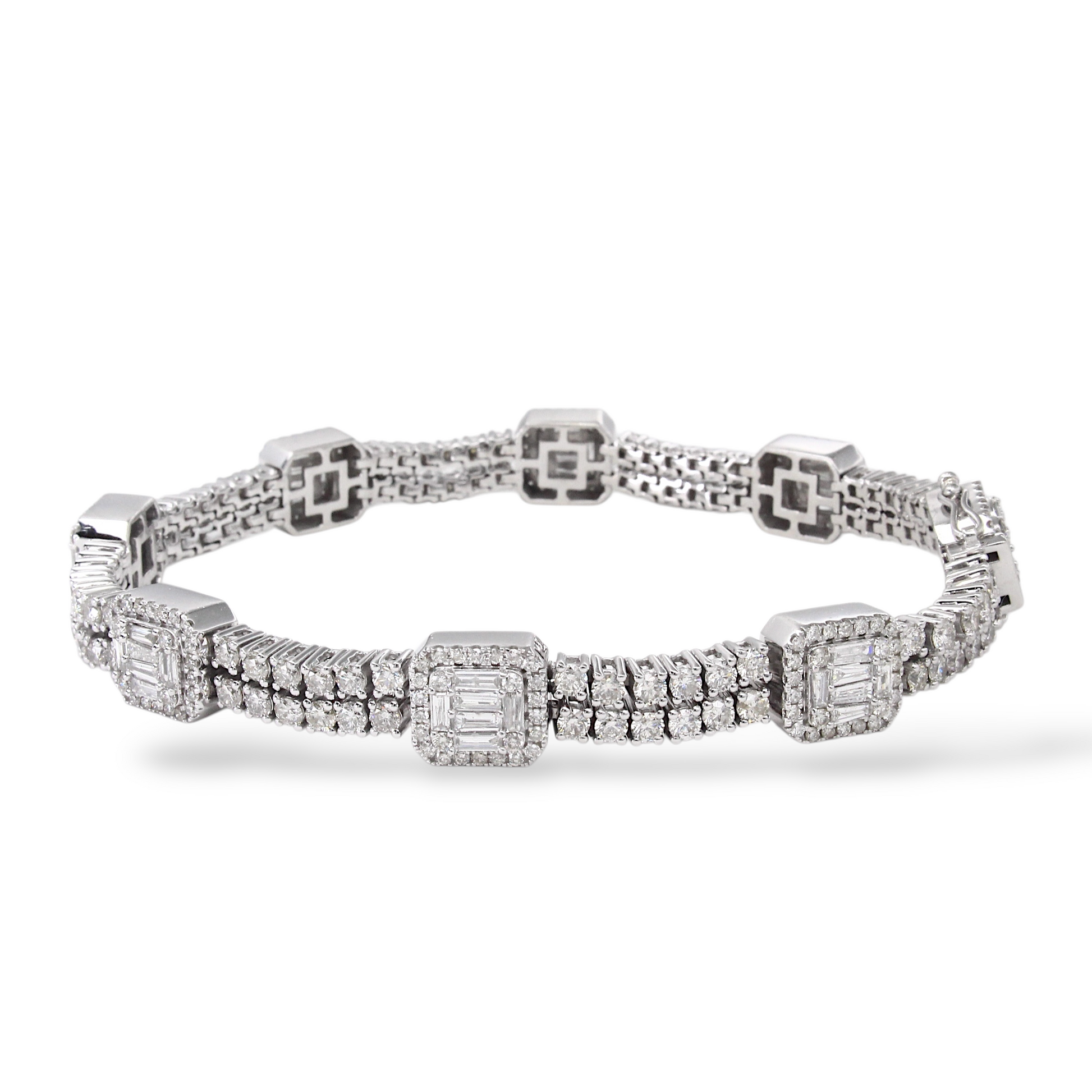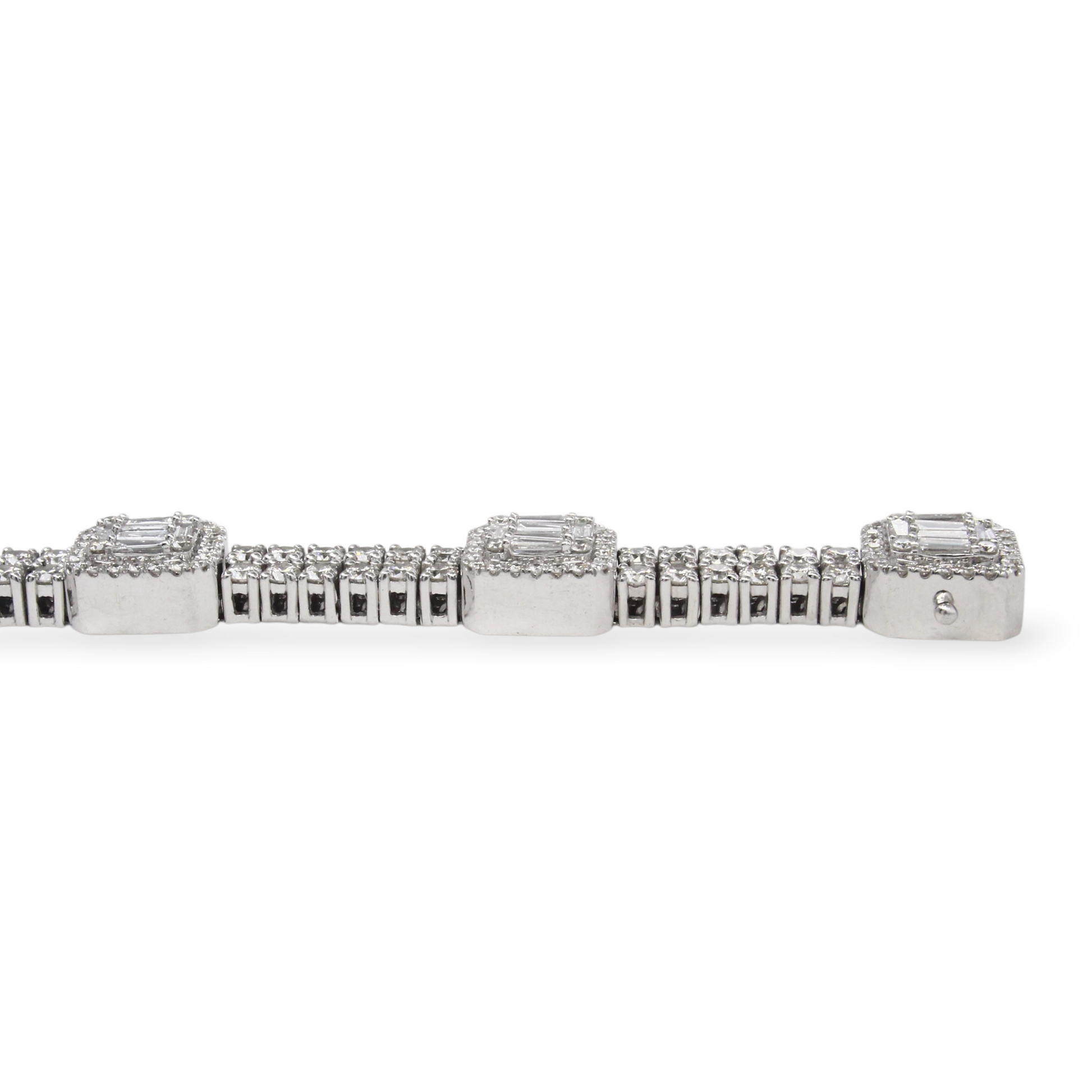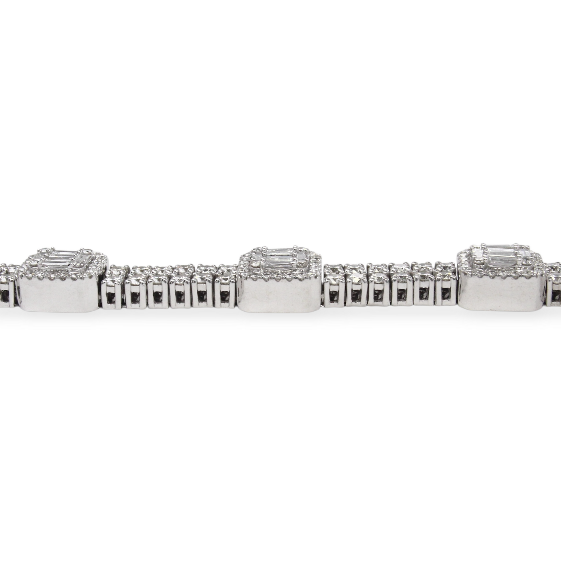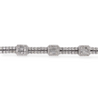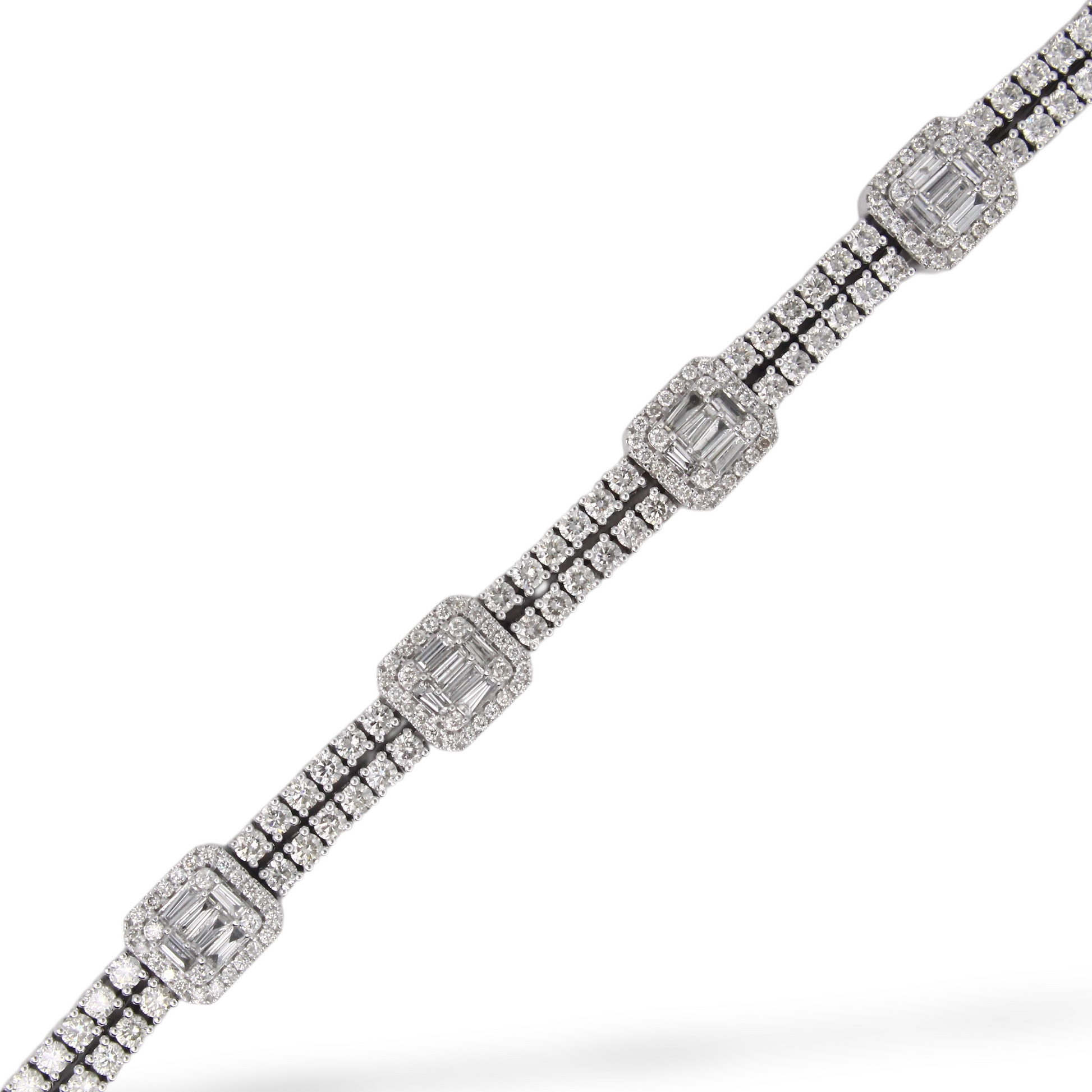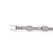A luxurious diamond bracelet crafted in 14K white gold, set with approximately 9–10 carats of natural earth-mined diamonds. The design features alternating square stations of baguette cut diamonds framed by halos, connected by rows of round brilliant cut diamonds for continuous sparkle.