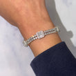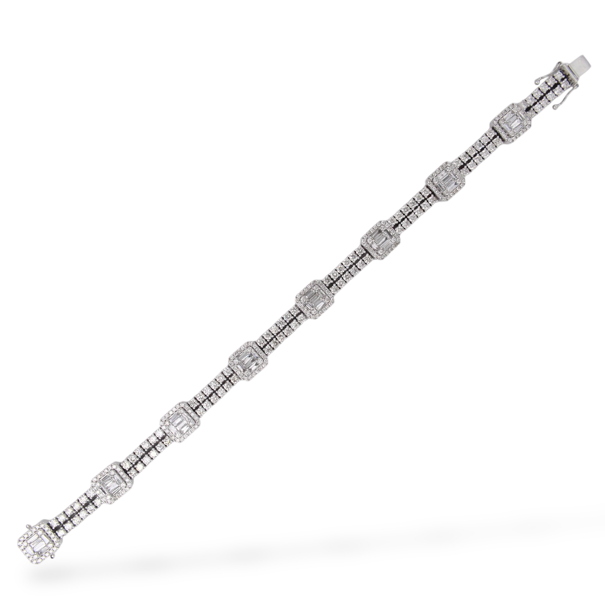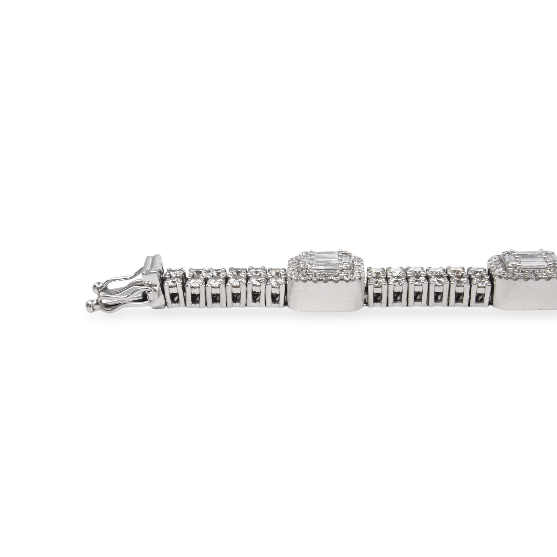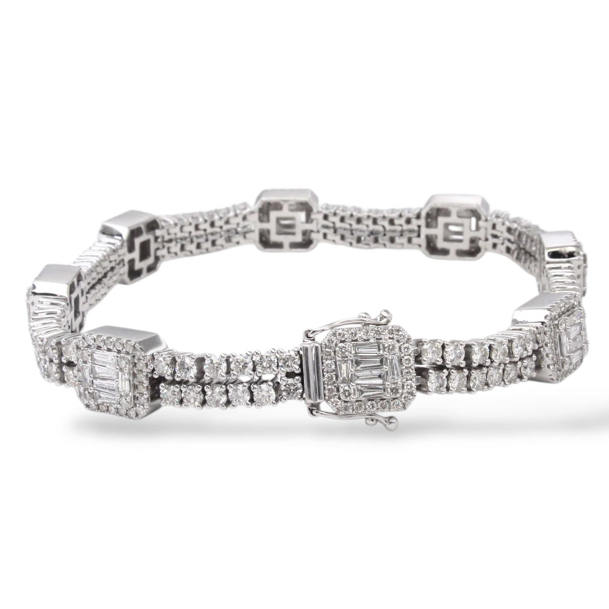 A luxurious diamond bracelet crafted in 14K white gold, set with approximately 9–10 carats of natural earth-mined diamonds. The design features alternating square stations of baguette cut diamonds framed by halos, connected by rows of round brilliant cut diamonds for continuous sparkle.