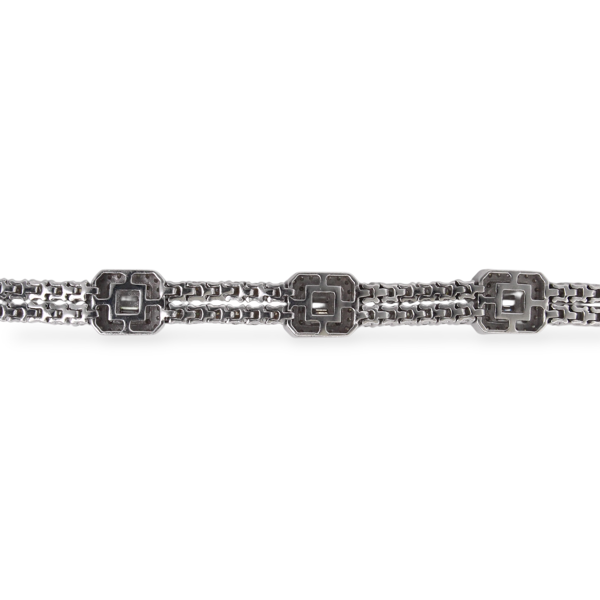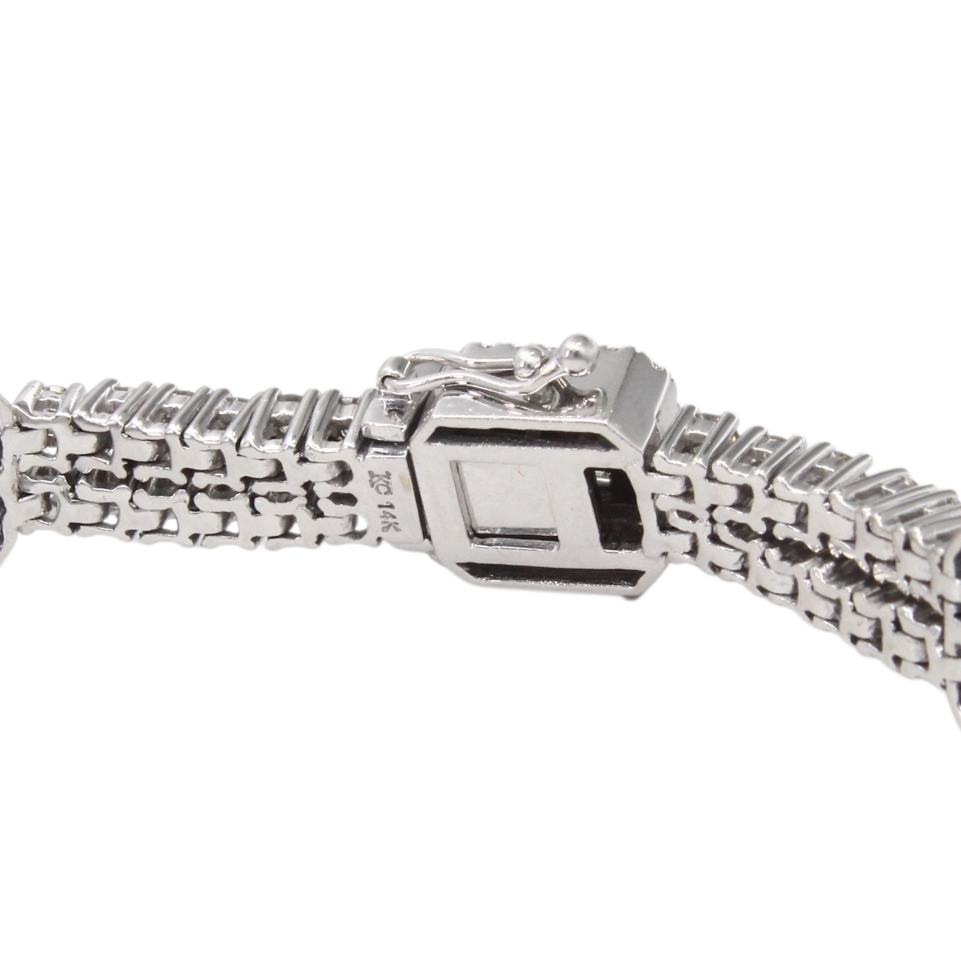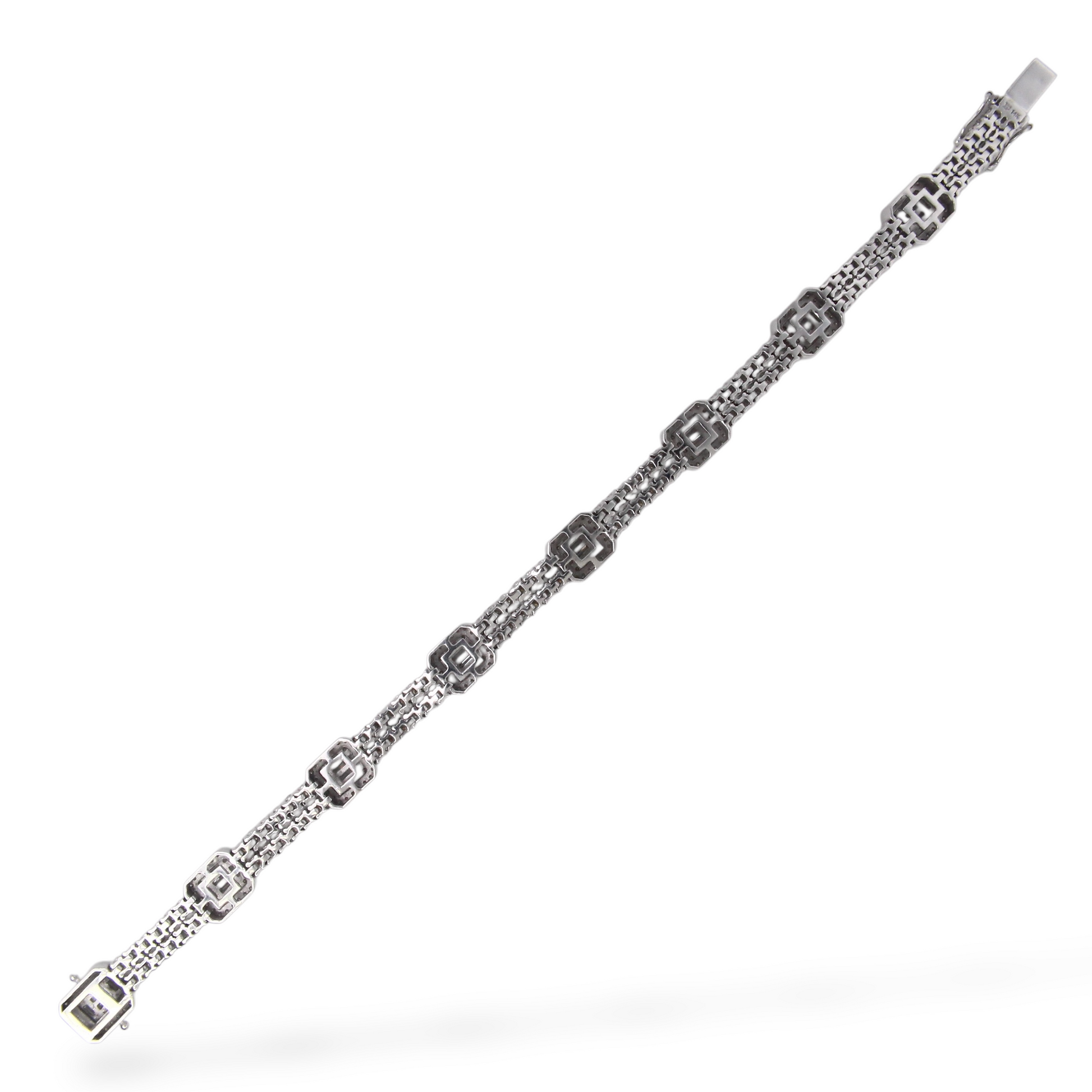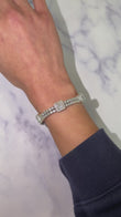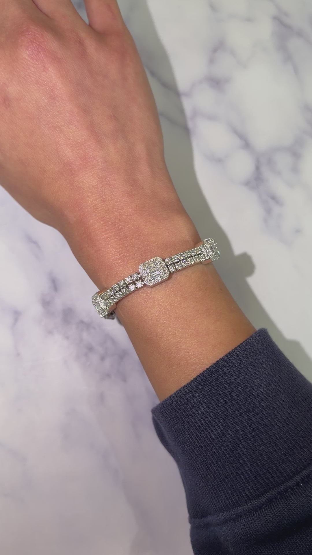 A luxurious diamond bracelet crafted in 14K white gold, set with approximately 9–10 carats of natural earth-mined diamonds. The design features alternating square stations of baguette cut diamonds framed by halos, connected by rows of round brilliant cut diamonds for continuous sparkle.