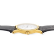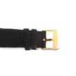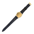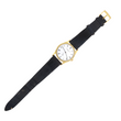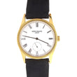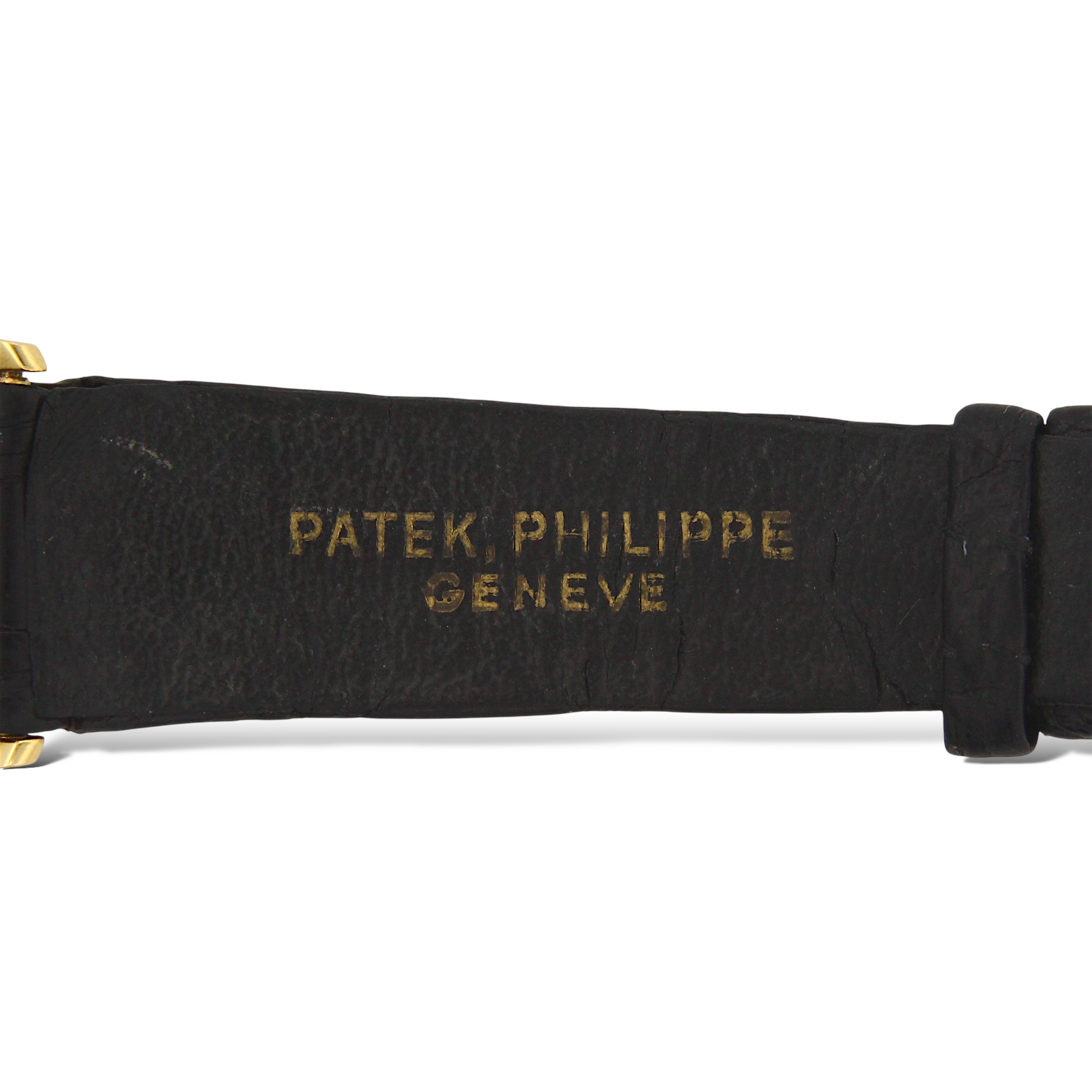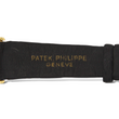 The watch is on a black leather band with the original yellow gold tang buckle, stamped Patek Philippe 18K.