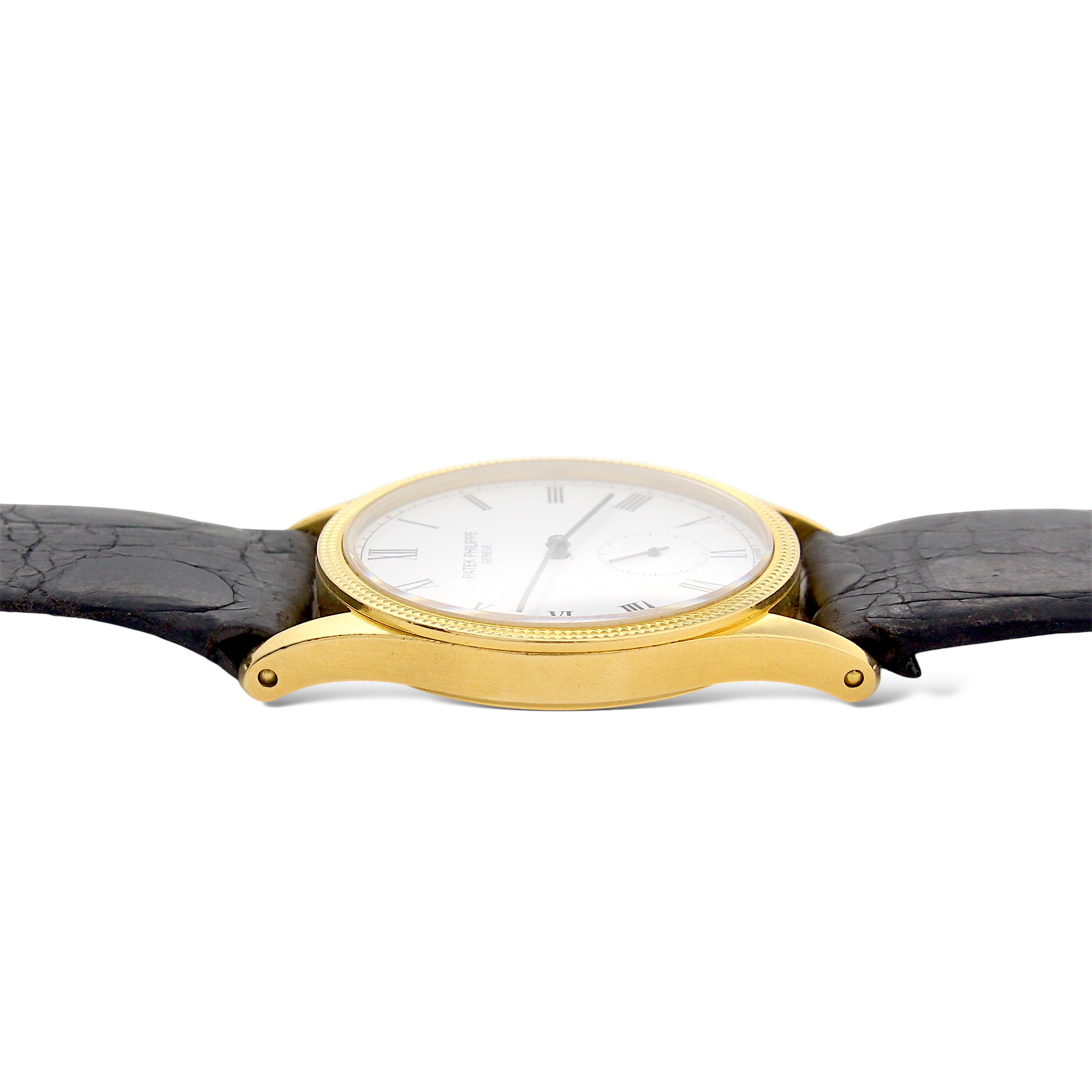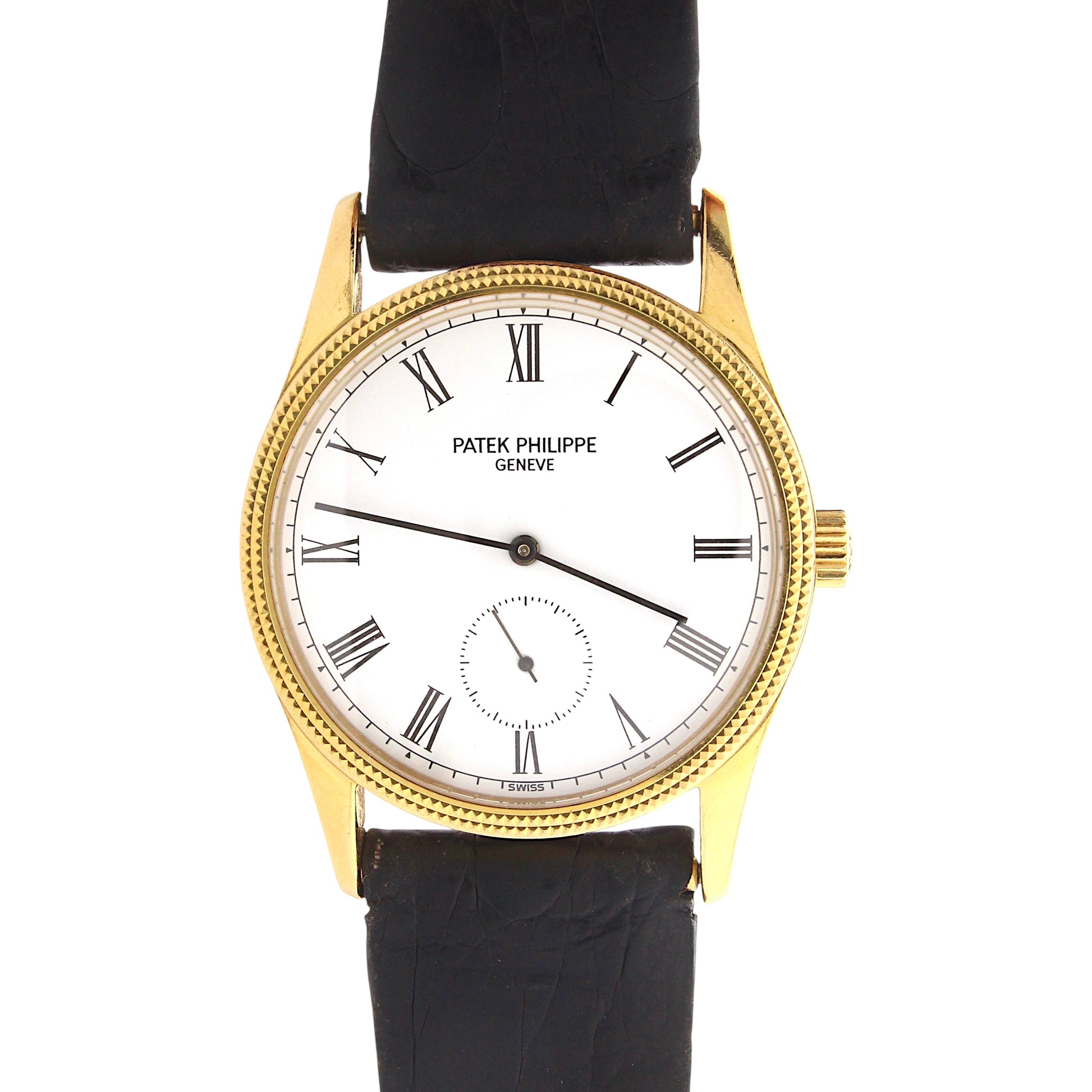 A classy and all original Patek Philippe Calatrava 31mm featuring an 18k yellow gold case with a hobnail bezel, white enamel dial with black roman numerals, a small seconds subsidiary dial next to the 6 o'clock, and original black leather bracelet with an 18K yellow gold tang buckle. The watch has never been polished.