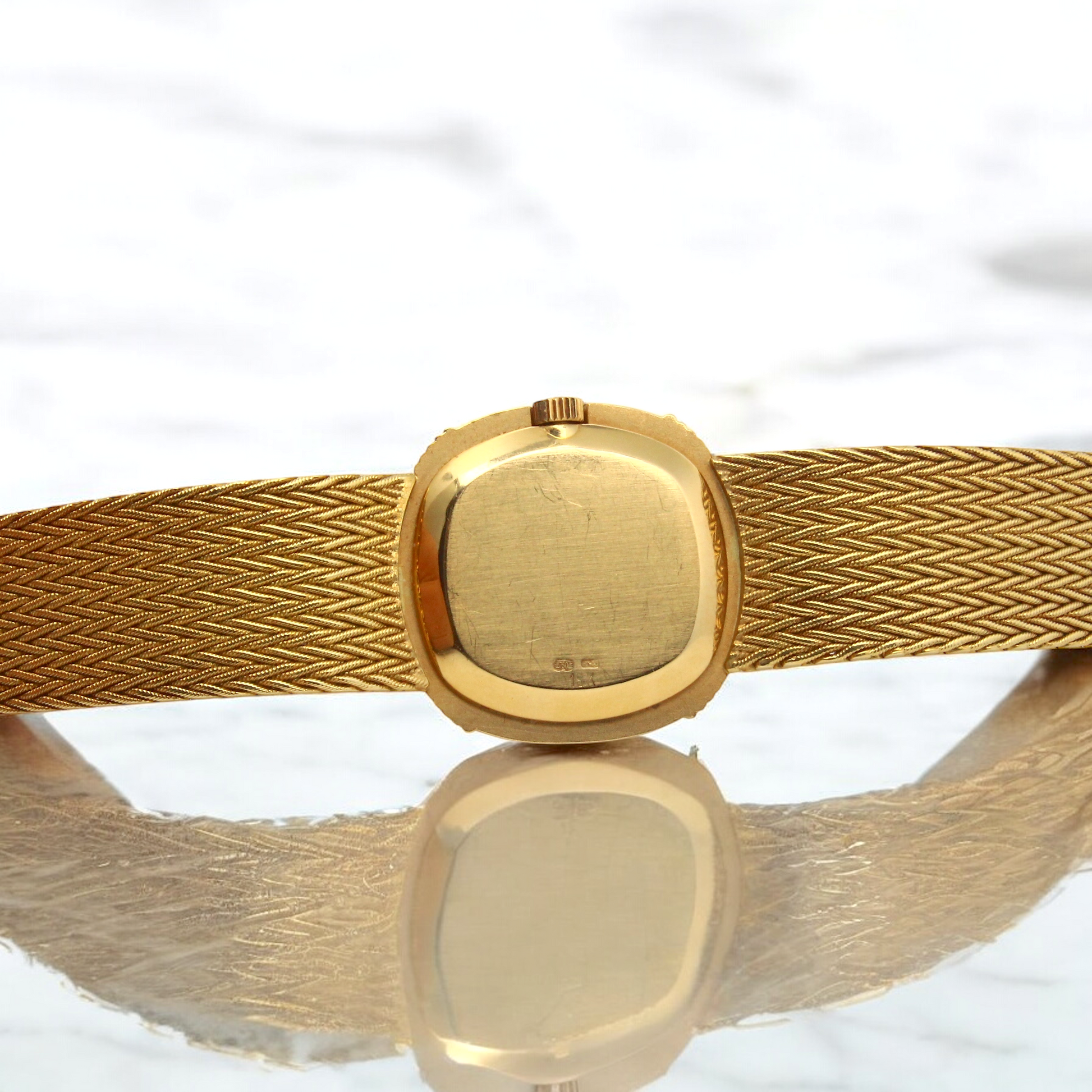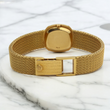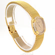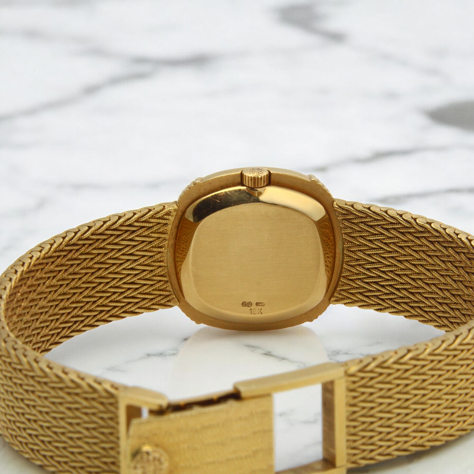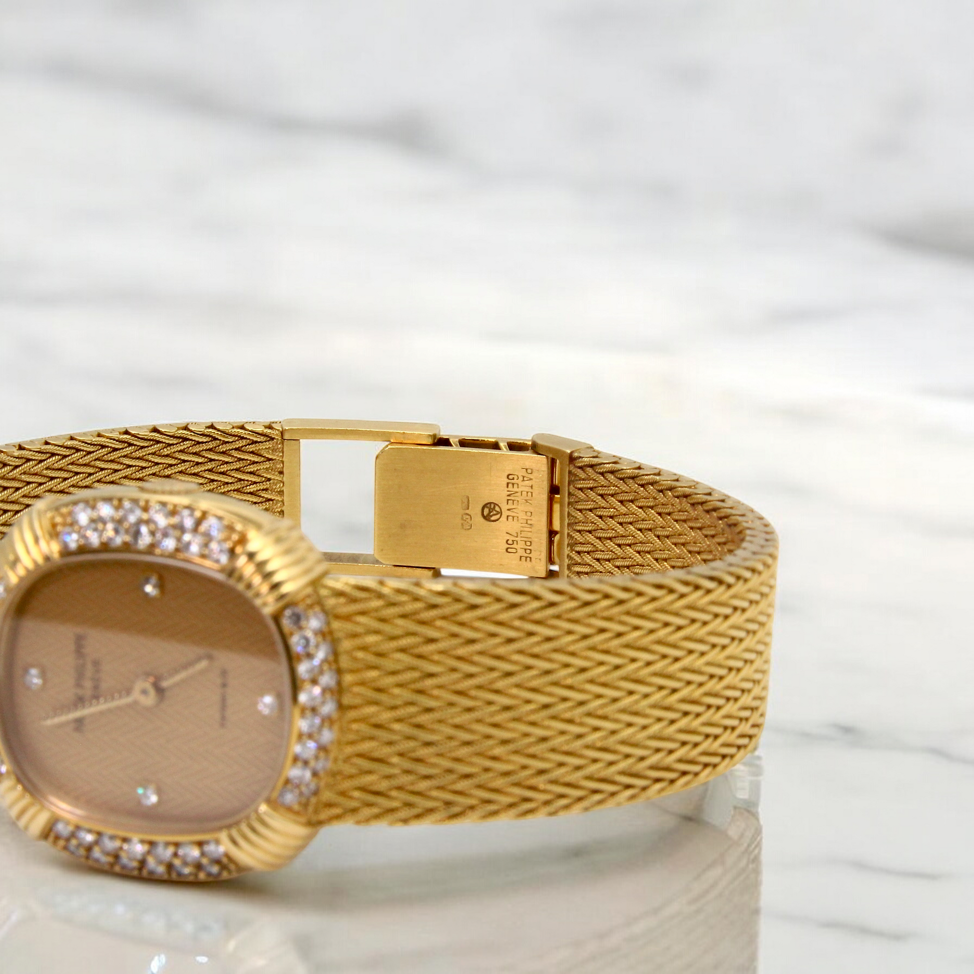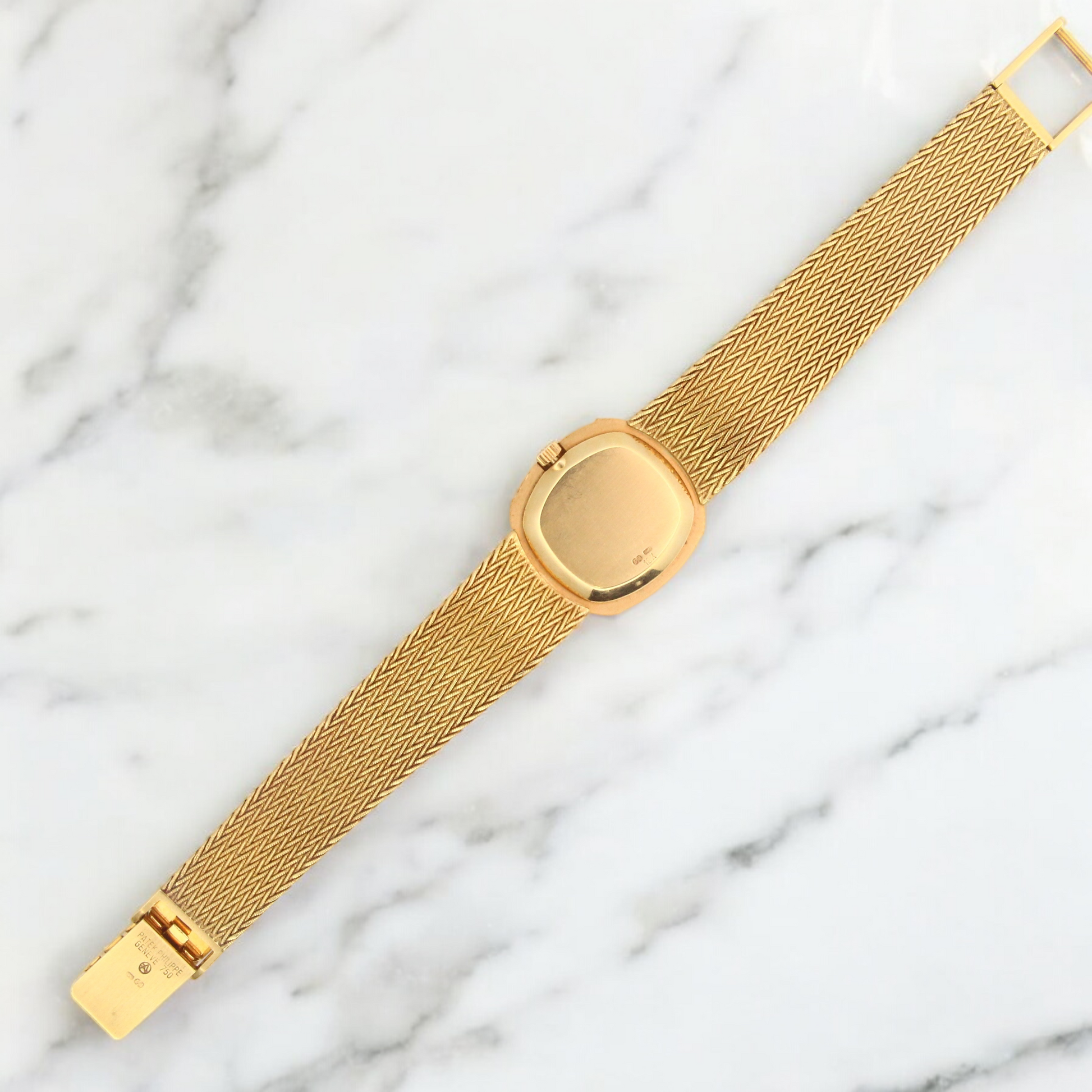 The integrated 18K yellow gold mesh woven bracelet is secured with a Patek Philippe jewelry clasp. The watch will fit up to a 7-inch wrist and can be adjusted to 6.75 inches.