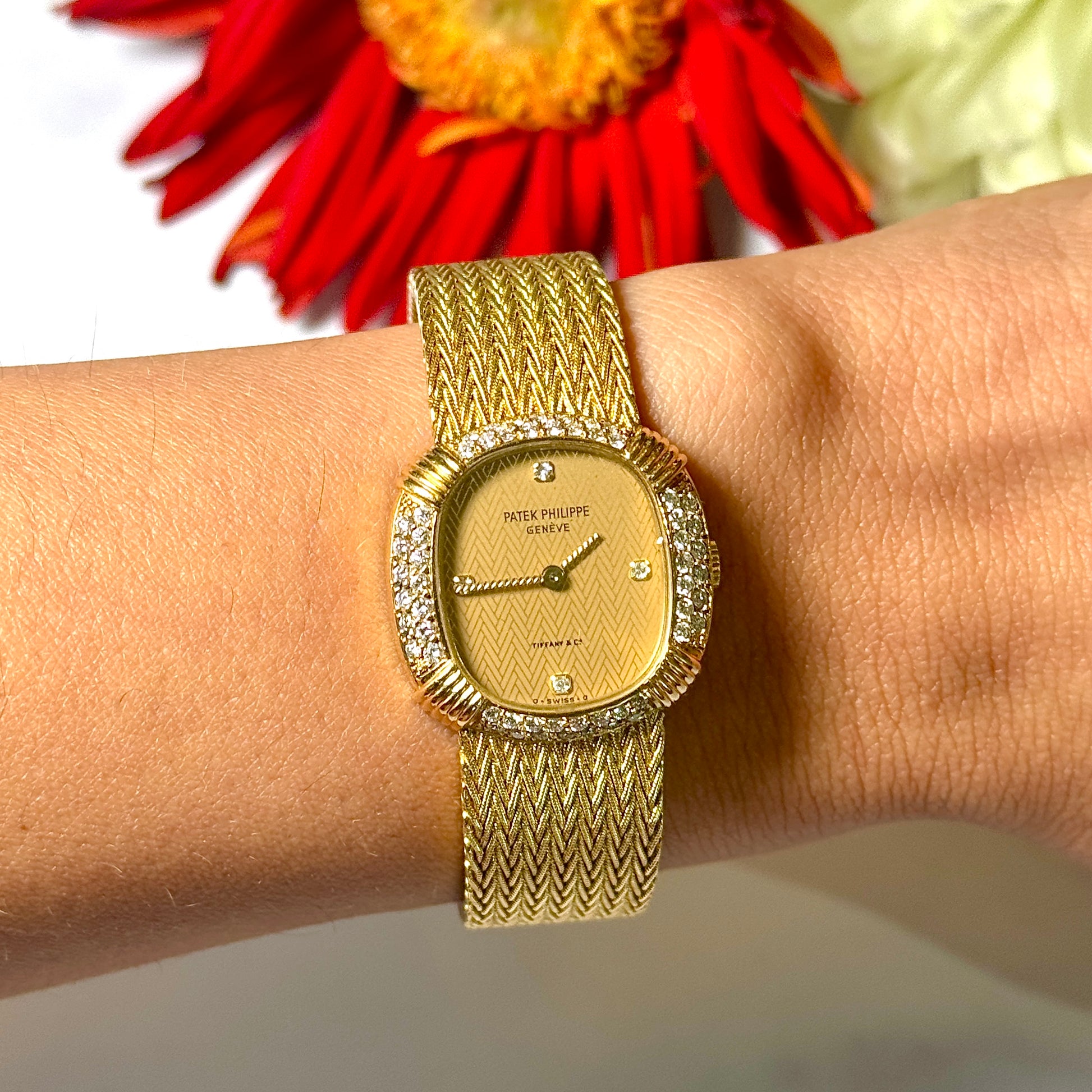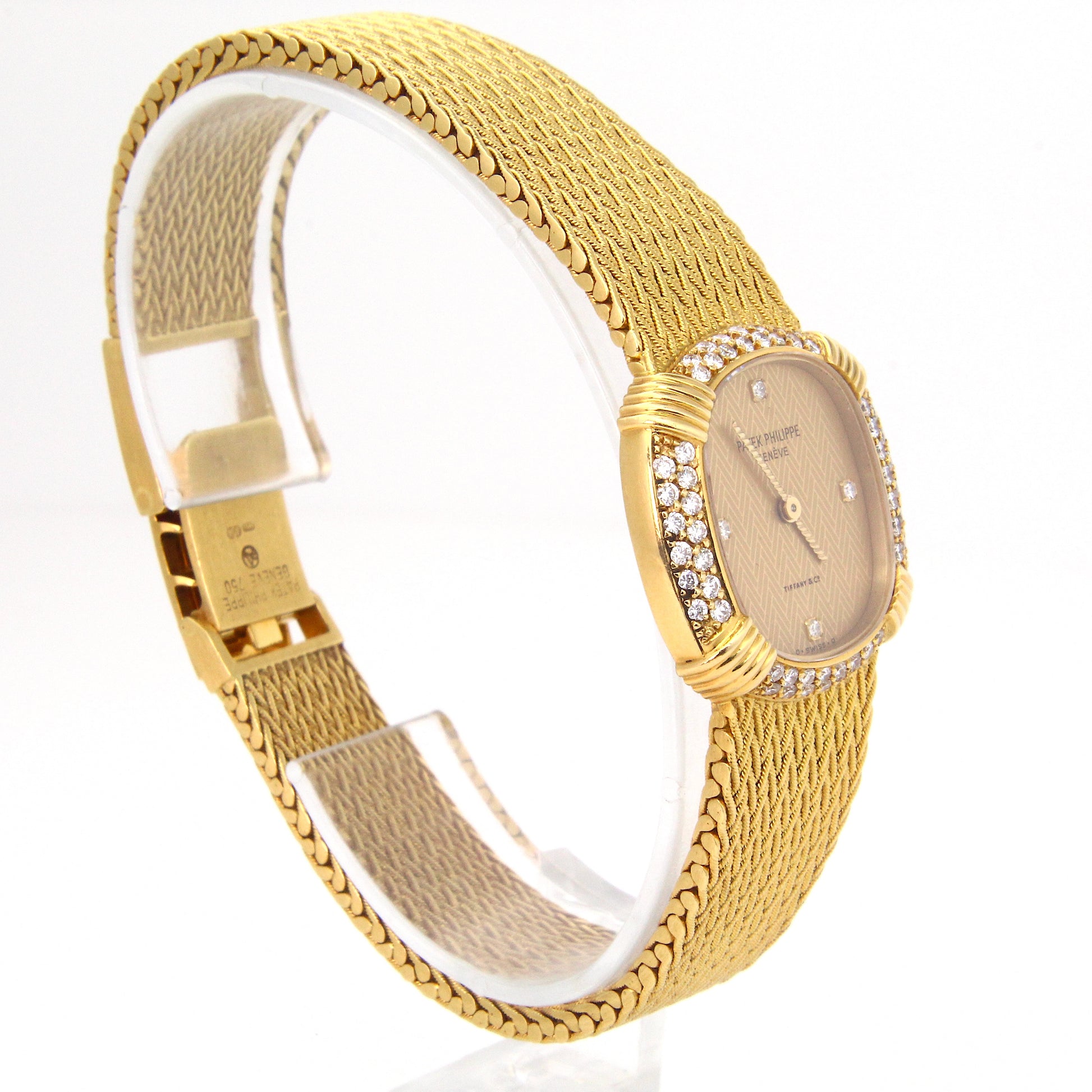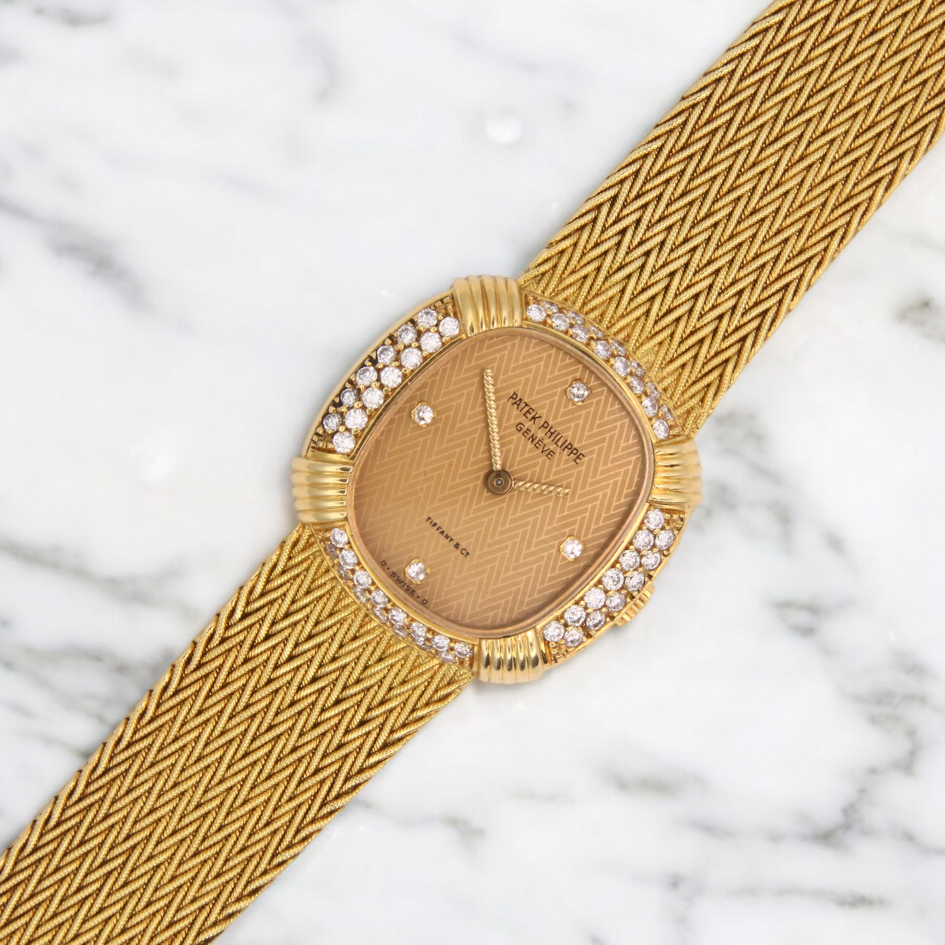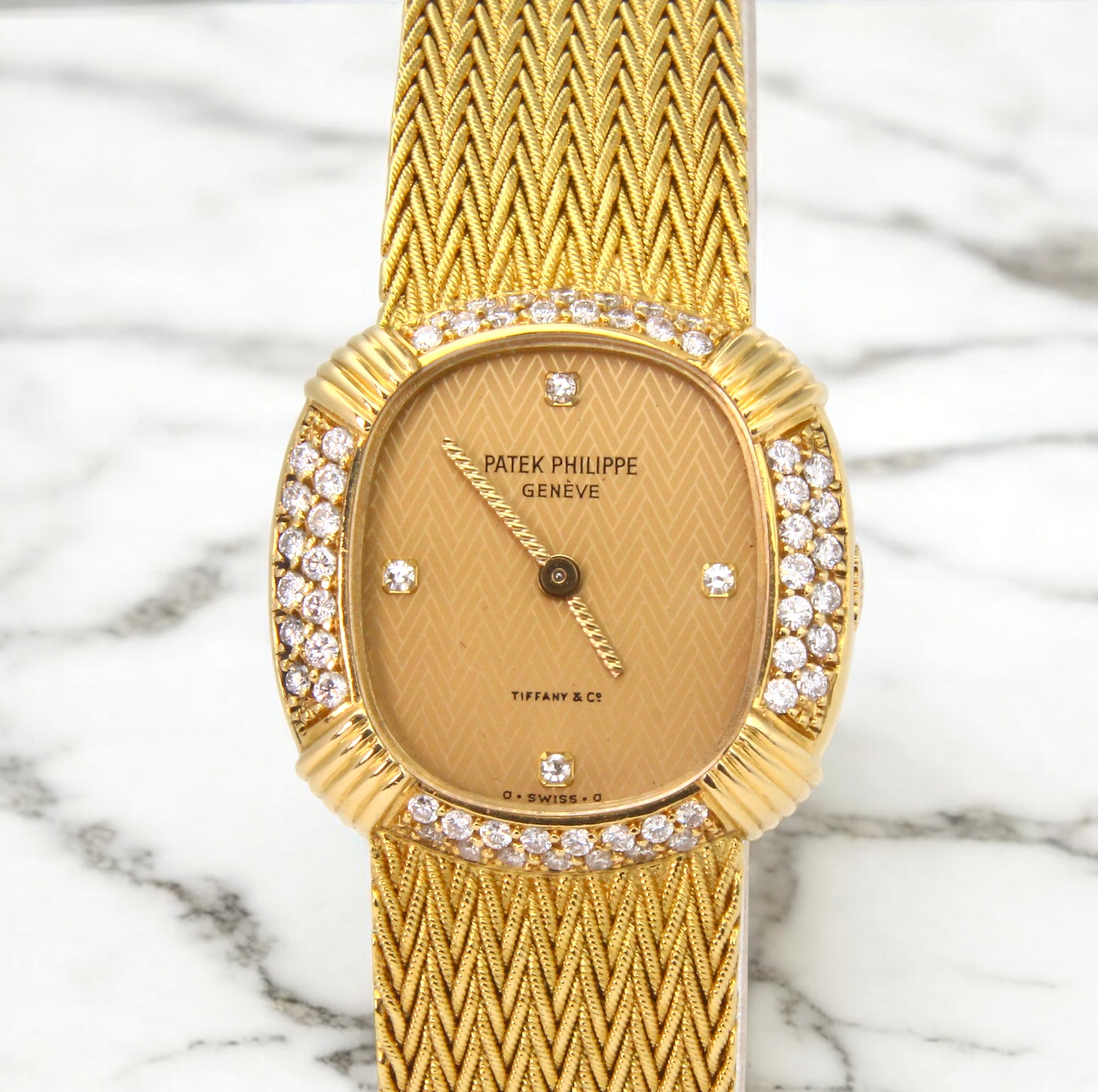 The 18K yellow gold case measures 23 mm x 23 mm, excluding the crown. The champagne dial is signed by both Patek Philippe and Tiffany & Co., featuring a reflective gold chevron pattern throughout. The bezel is factory-set with diamonds. The crystal is sapphire, and the watch is not water resistant.
