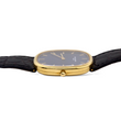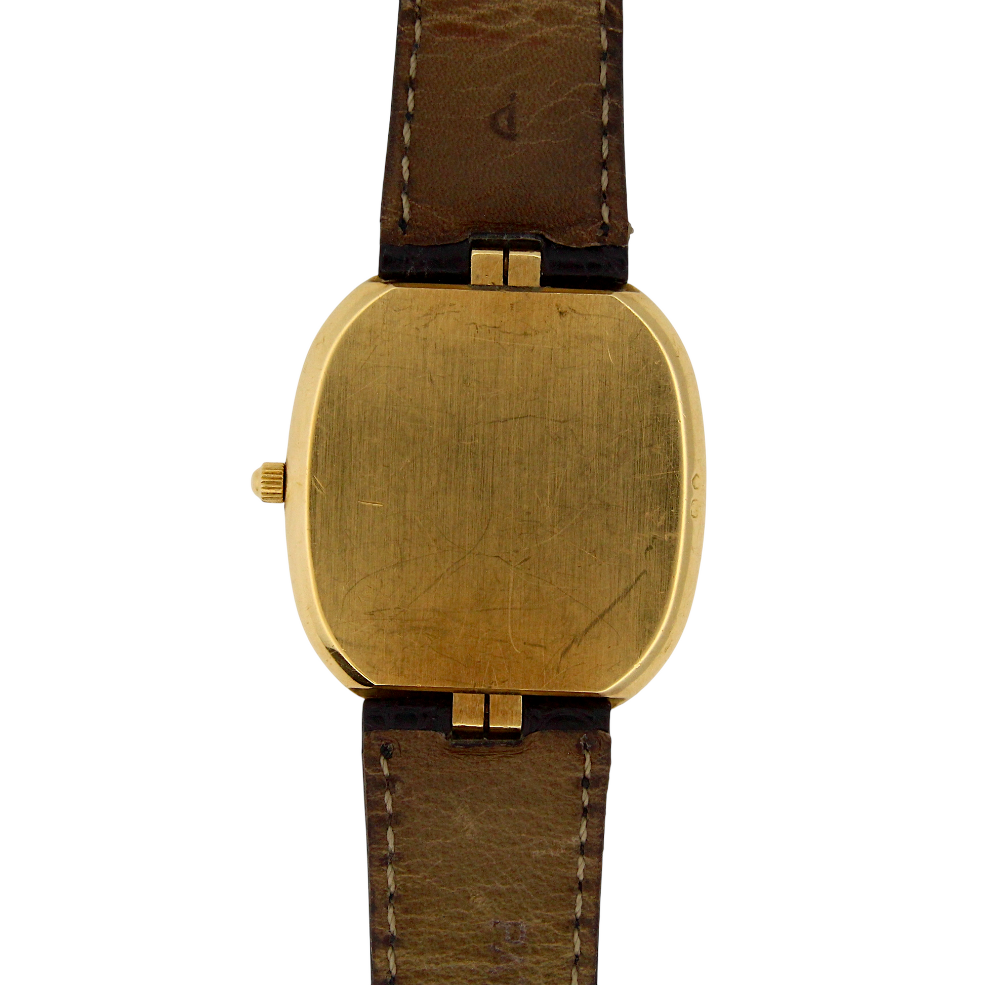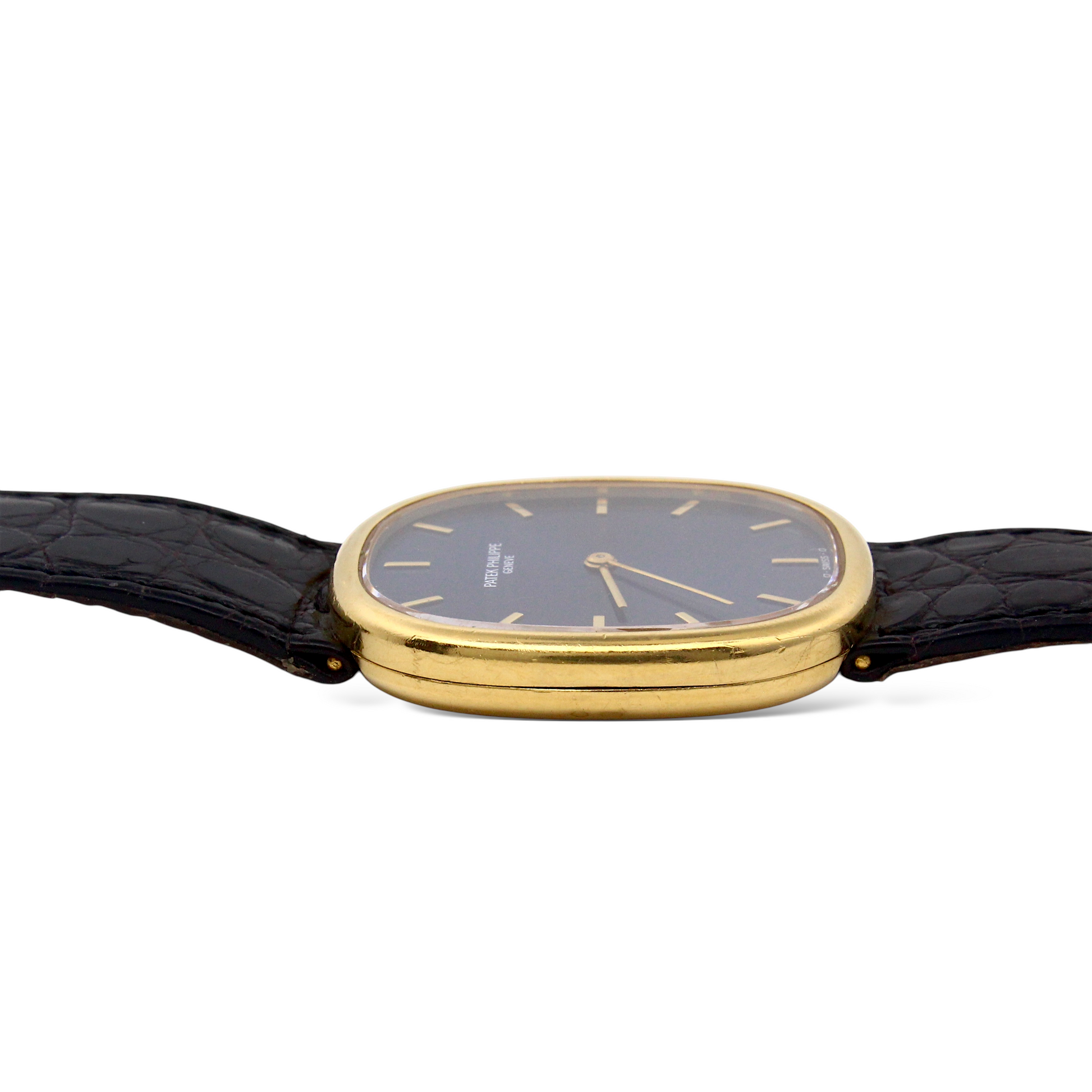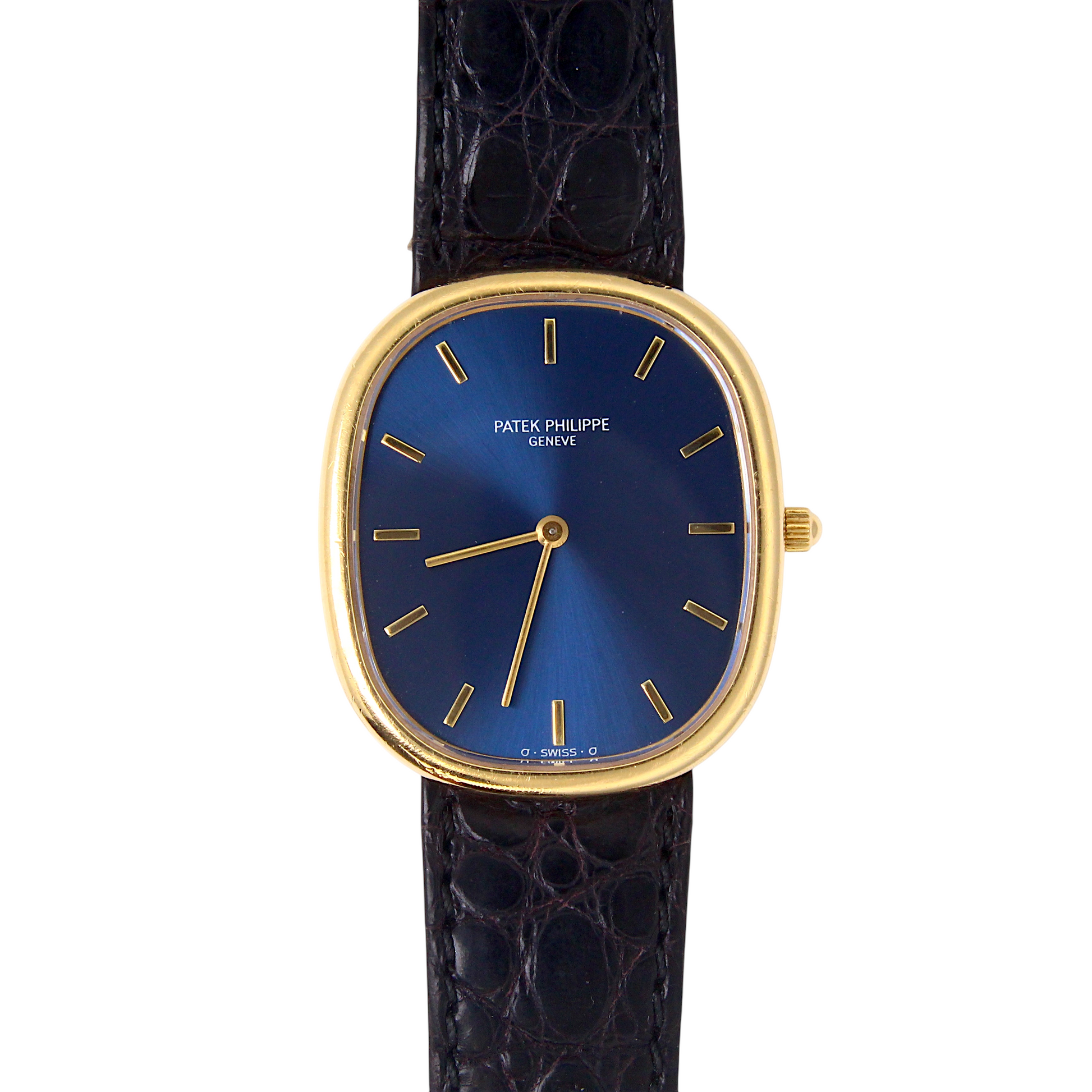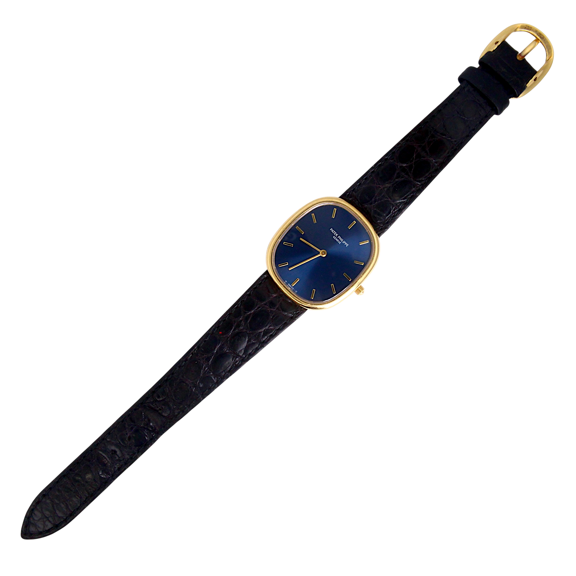 A classy and all original Patek Philippe Ellipse featuring in 18k yellow gold with a metallic blue dial with yellow gold baton index markers on an original black leather bracelet with an 18K yellow gold Ellipse Patek Philippe tang buckle.