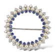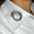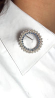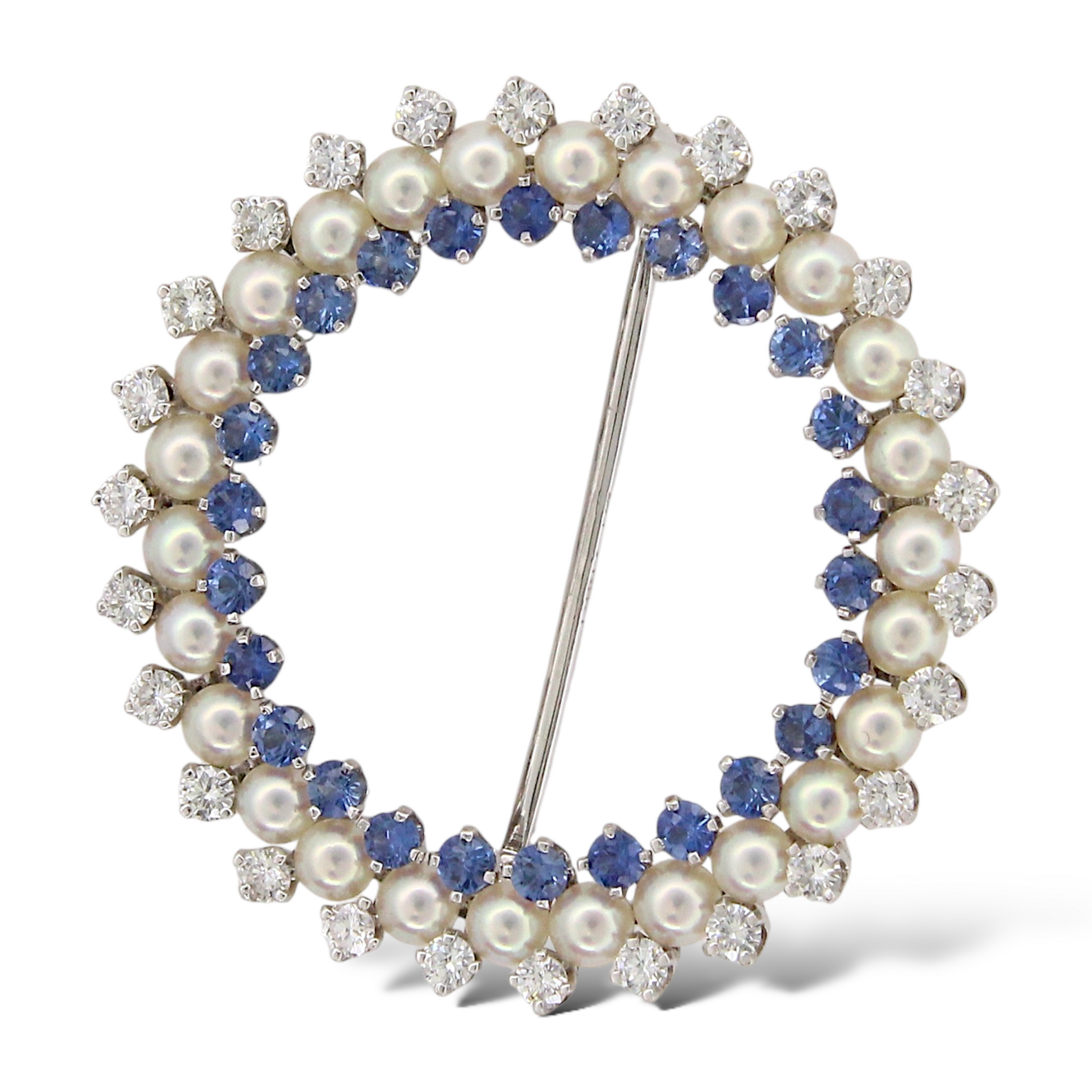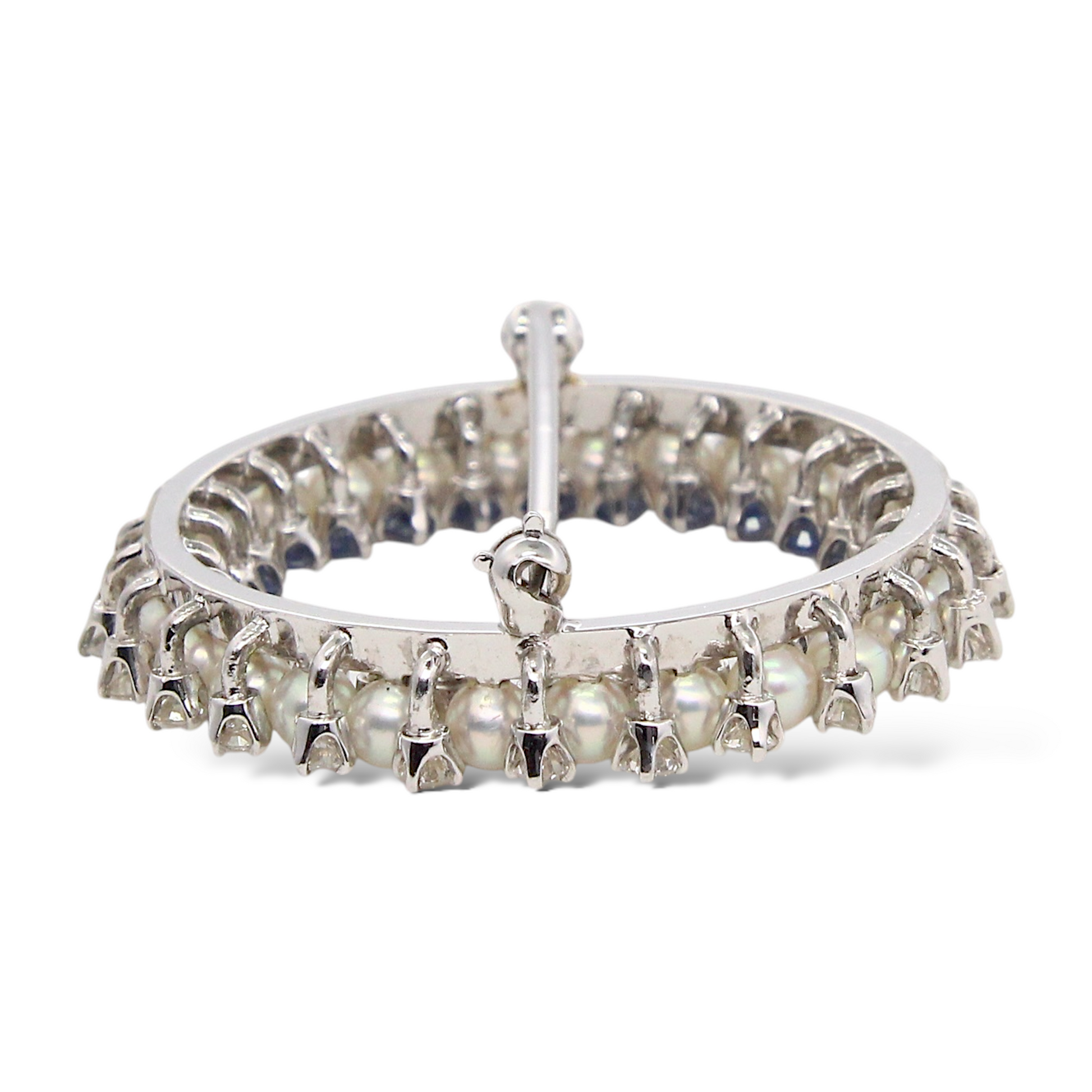 This elegant brooch is crafted in 14K white gold and features a graceful circular design accented with a refined combination of gemstones. The piece is set with natural earth-mined round brilliant cut diamonds totaling approximately 0.60 CT, displaying G–H color and VS clarity. Alternating throughout are round brilliant cut blue sapphires totaling approximately 0.60 CT, complemented by luminous round pearls that add softness and contrast to the design. This brooch offers a timeless, sophisticated aesthetic suitable for both day and evening wear.