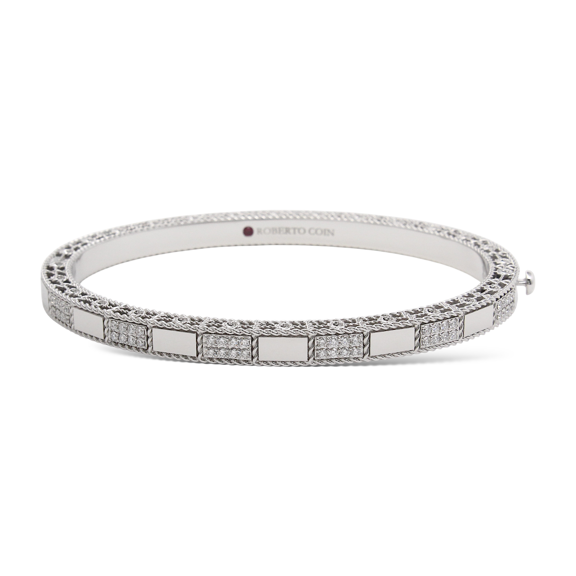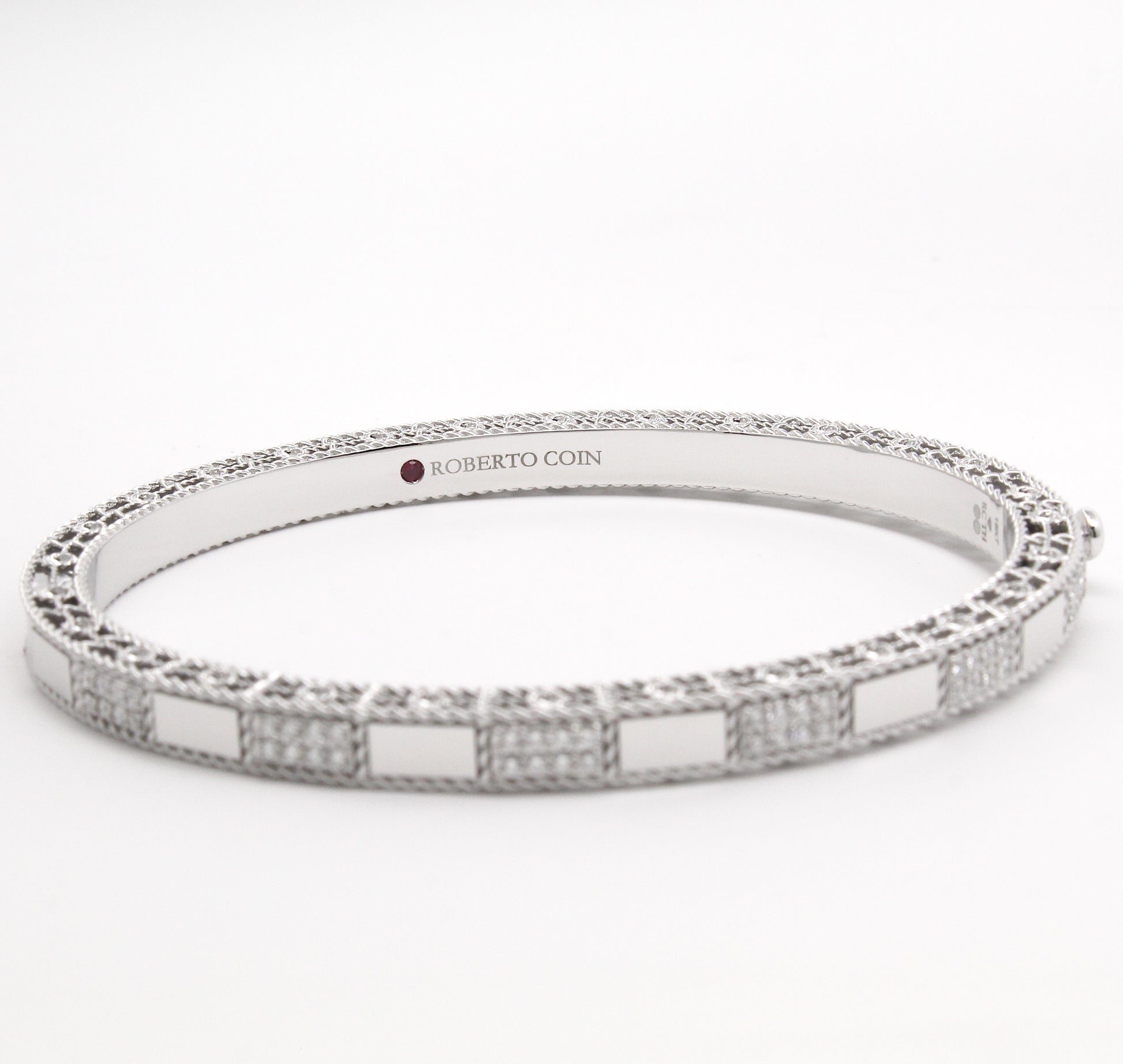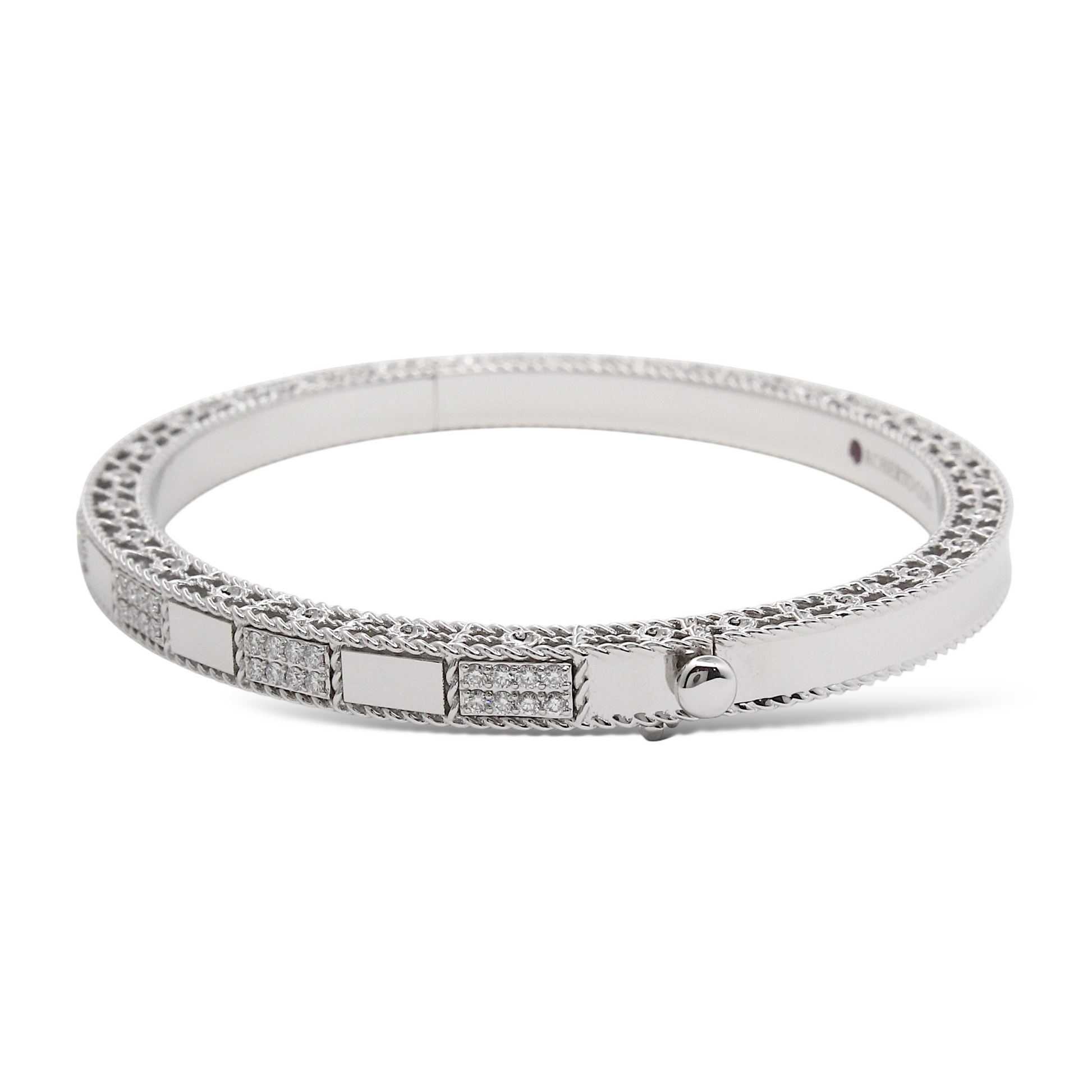 This Roberto Coin bangle from the Art Deco collection is crafted in 18K white gold and features alternating polished and pavé diamond-set rectangular panels. The pavé sections are meticulously set with approximately 0.40 carats of natural earth-mined diamonds, delivering brilliant sparkle across the wrist. The bracelet’s geometric design pays homage to Art Deco elegance while showcasing Roberto Coin’s signature craftsmanship, including the hidden ruby on the interior. The bangle comes with the original box.