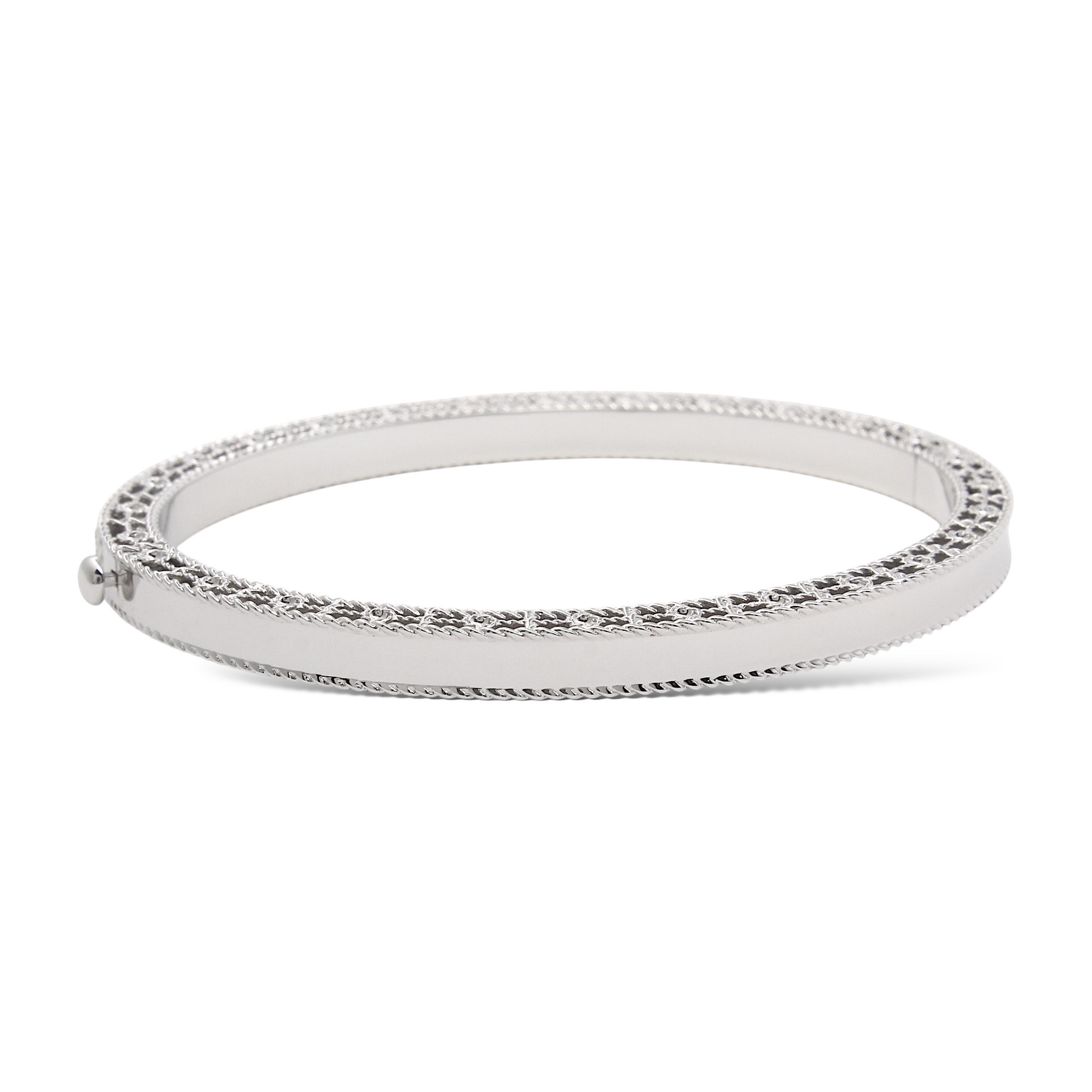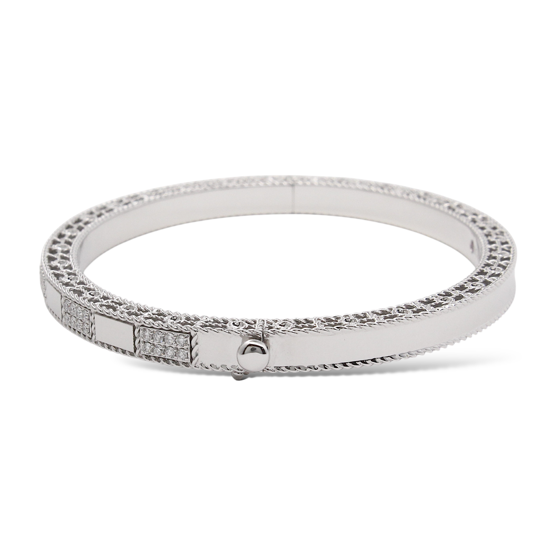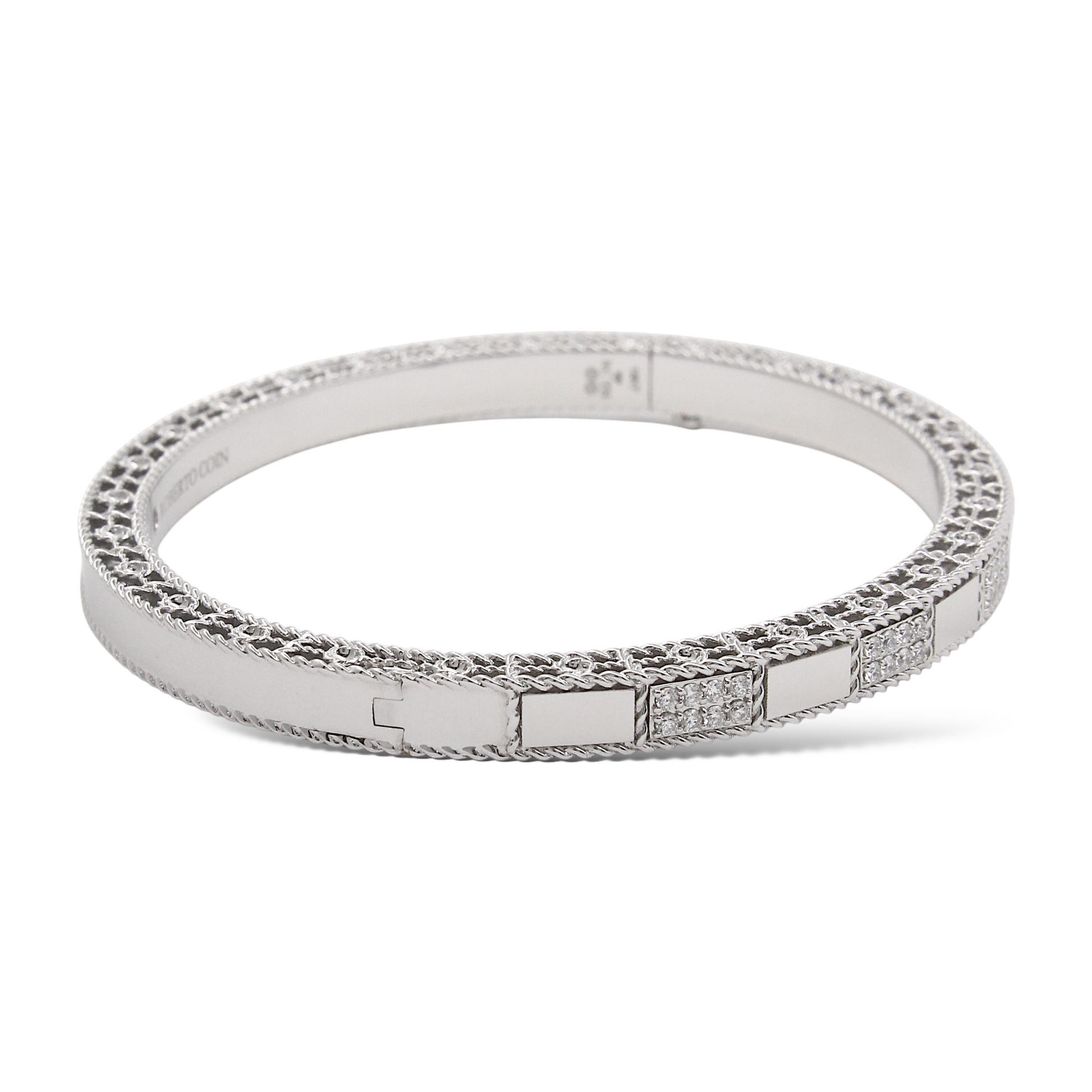 This Roberto Coin bangle from the Art Deco collection is crafted in 18K white gold and features alternating polished and pavé diamond-set rectangular panels. The pavé sections are meticulously set with approximately 0.40 carats of natural earth-mined diamonds, delivering brilliant sparkle across the wrist. The bracelet’s geometric design pays homage to Art Deco elegance while showcasing Roberto Coin’s signature craftsmanship, including the hidden ruby on the interior. The bangle comes with the original box.