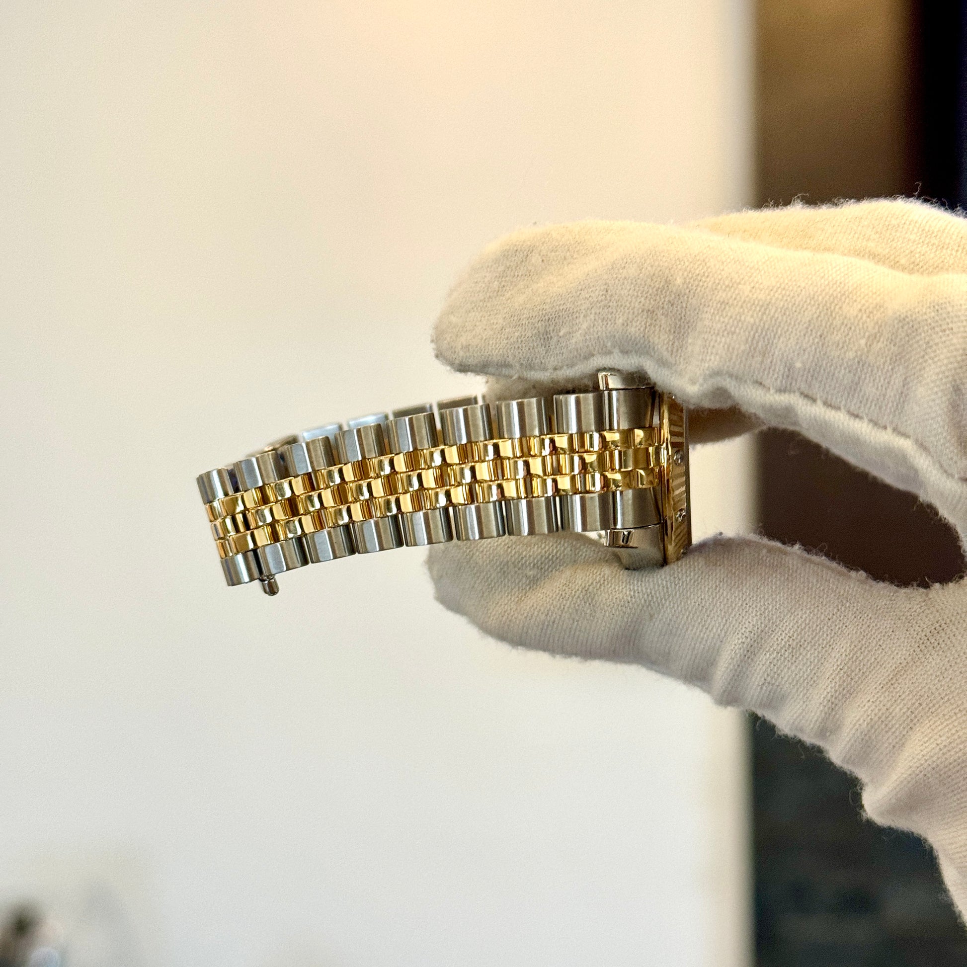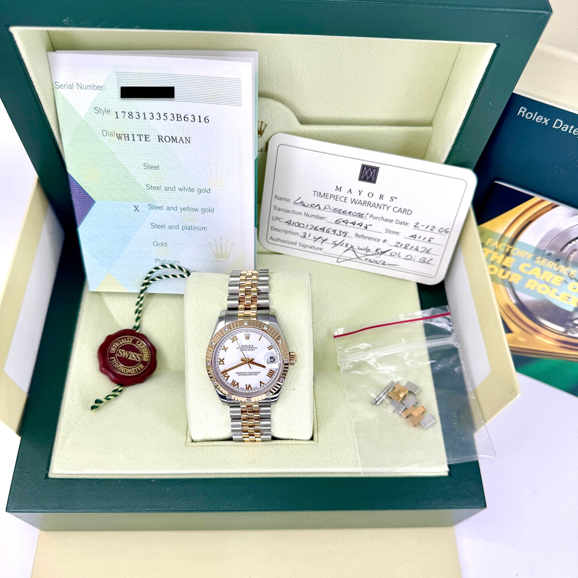 An elegant and feminine two-tone stainless steel and 18K yellow gold Rolex Datejust in 31mm. This wristwatch has a yellow gold fluted bezel set with factory original diamonds and a glossy white dial with original gold Roman numeral index markers. This watch is all original Rolex. The watch is accompanied by its original outer box, box, warranty paperwork, booklets, booklet holder, red Swiss tag, and handkerchief. This watch has model number 178313 and was produced in 2005.