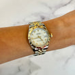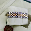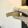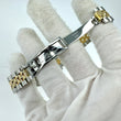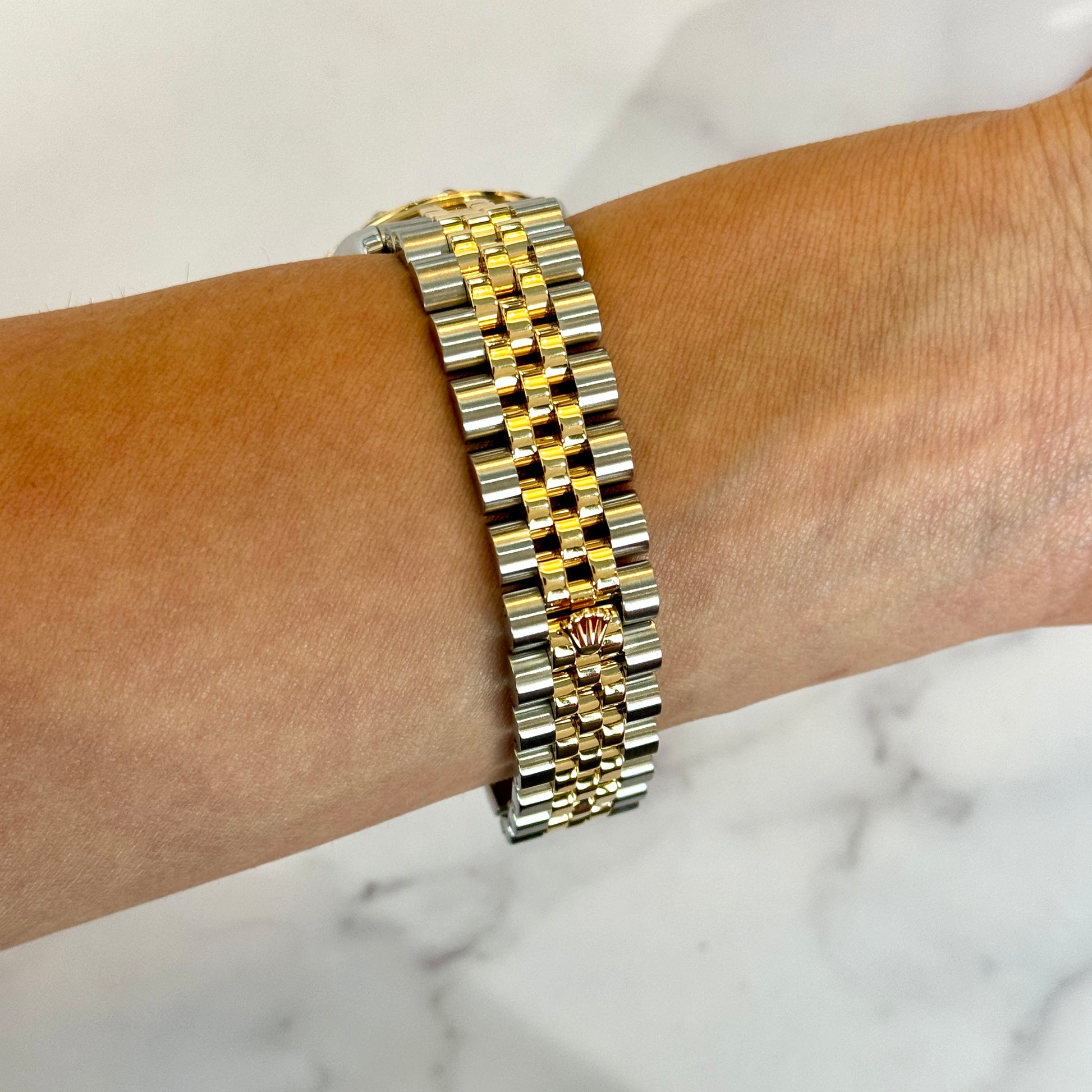 The watch is on a solid stainless steel and yellow gold jubilee bracelet affixed to a two-tone hidden crown clasp.