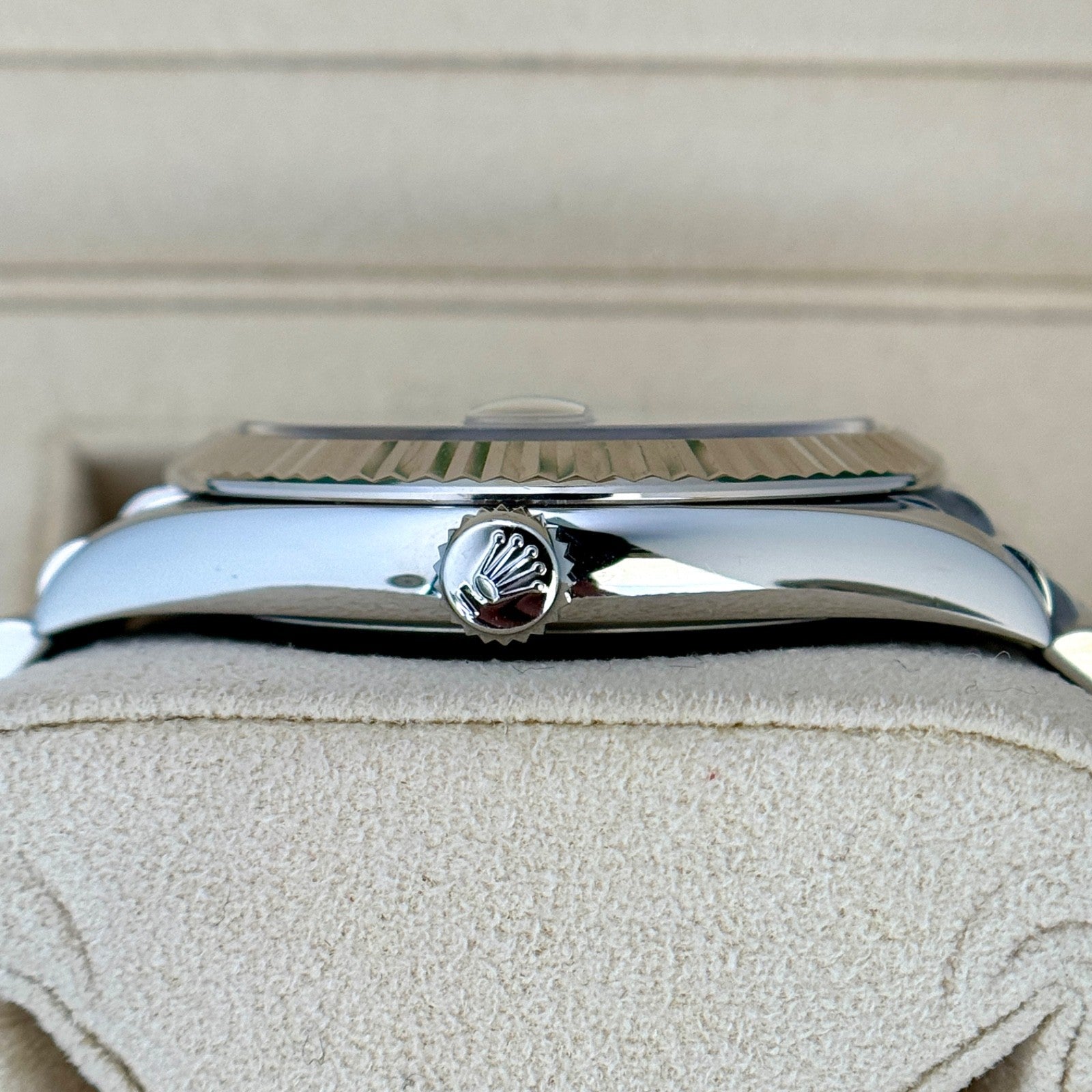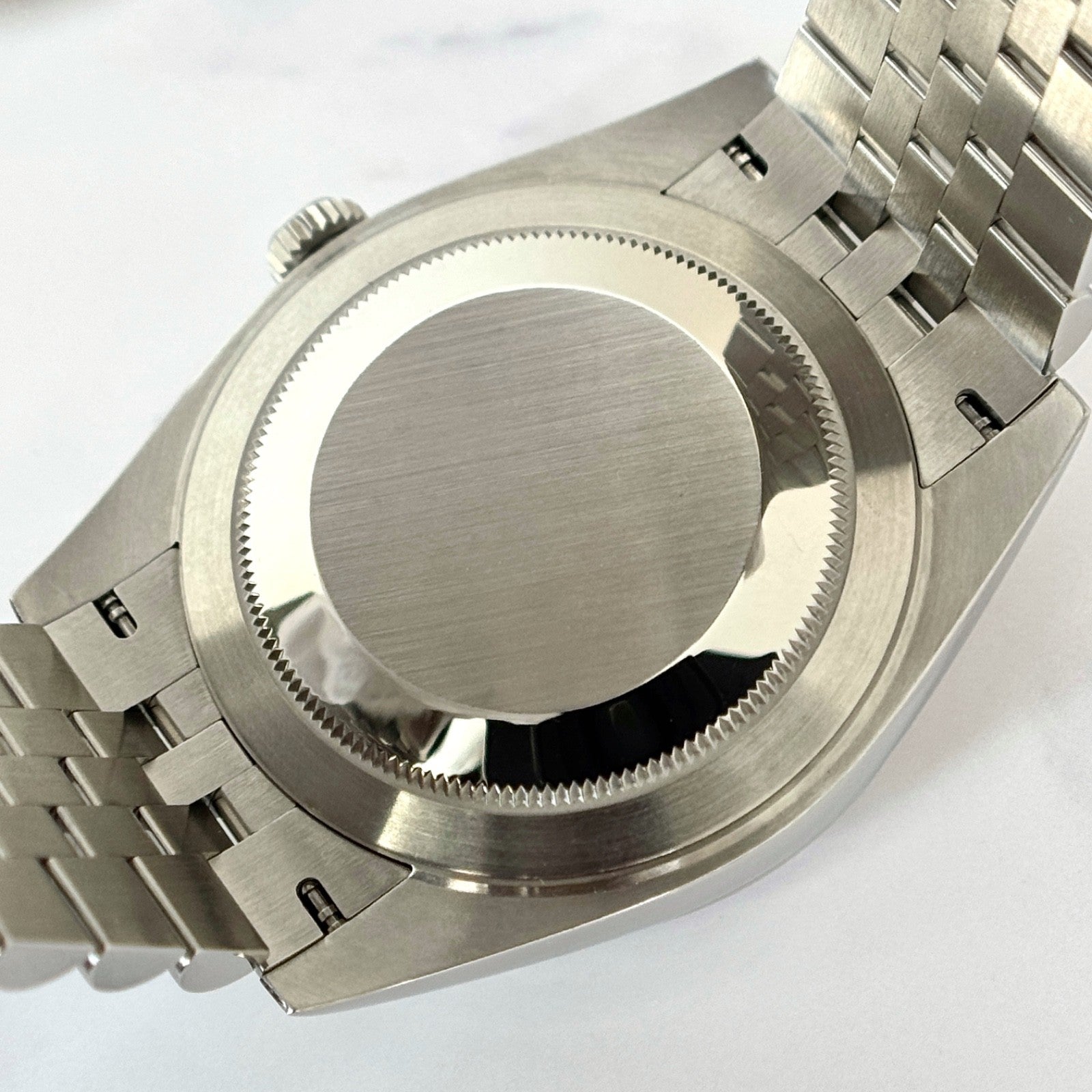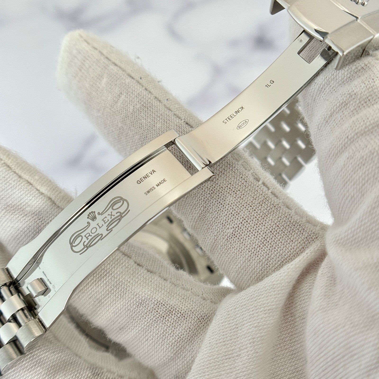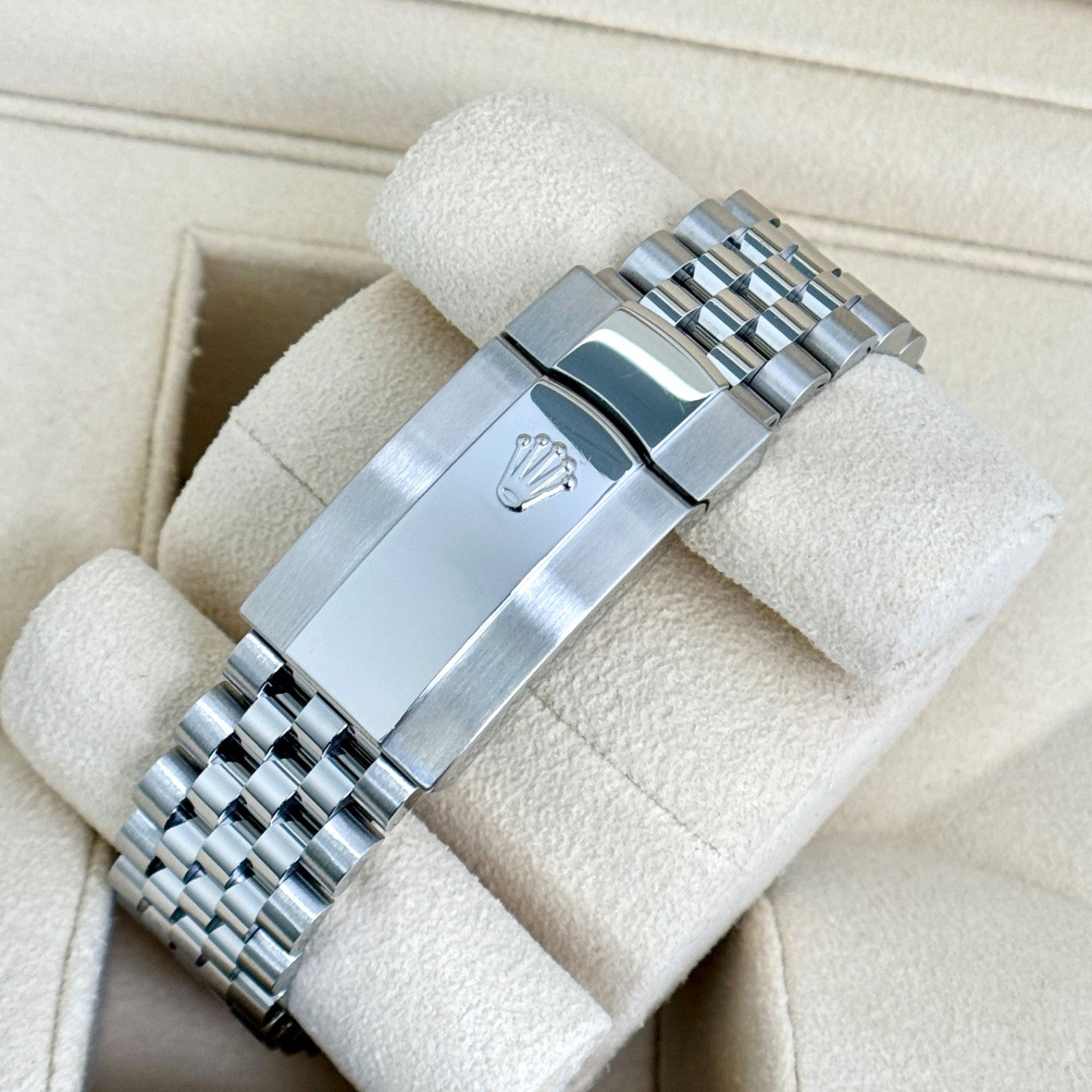 The watch is fitted with the original Jubilee bracelet in stainless steel. It is secured with a folding Oysterclasp, offering comfort and security on the wrist. The bracelet shows no sag and has additional links.