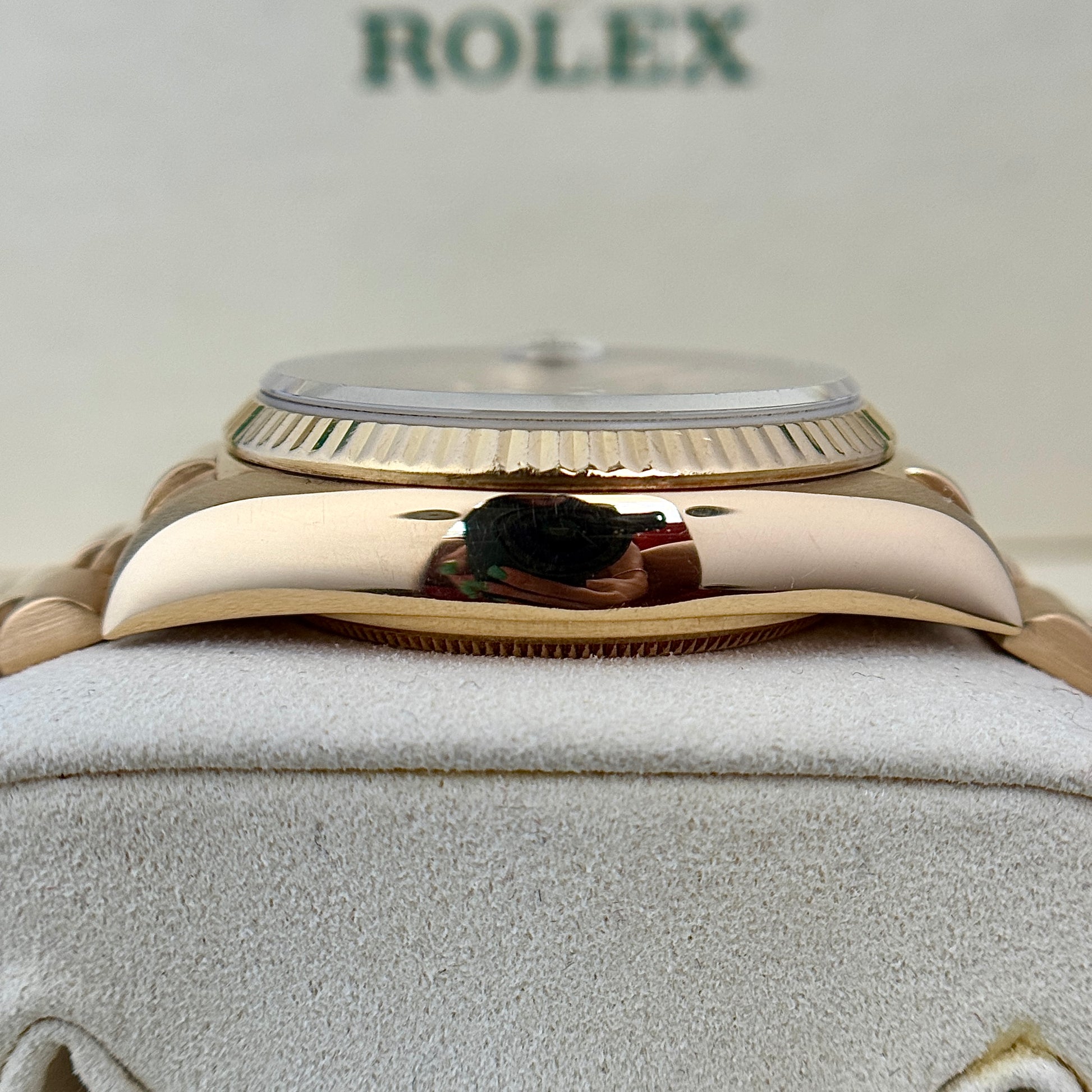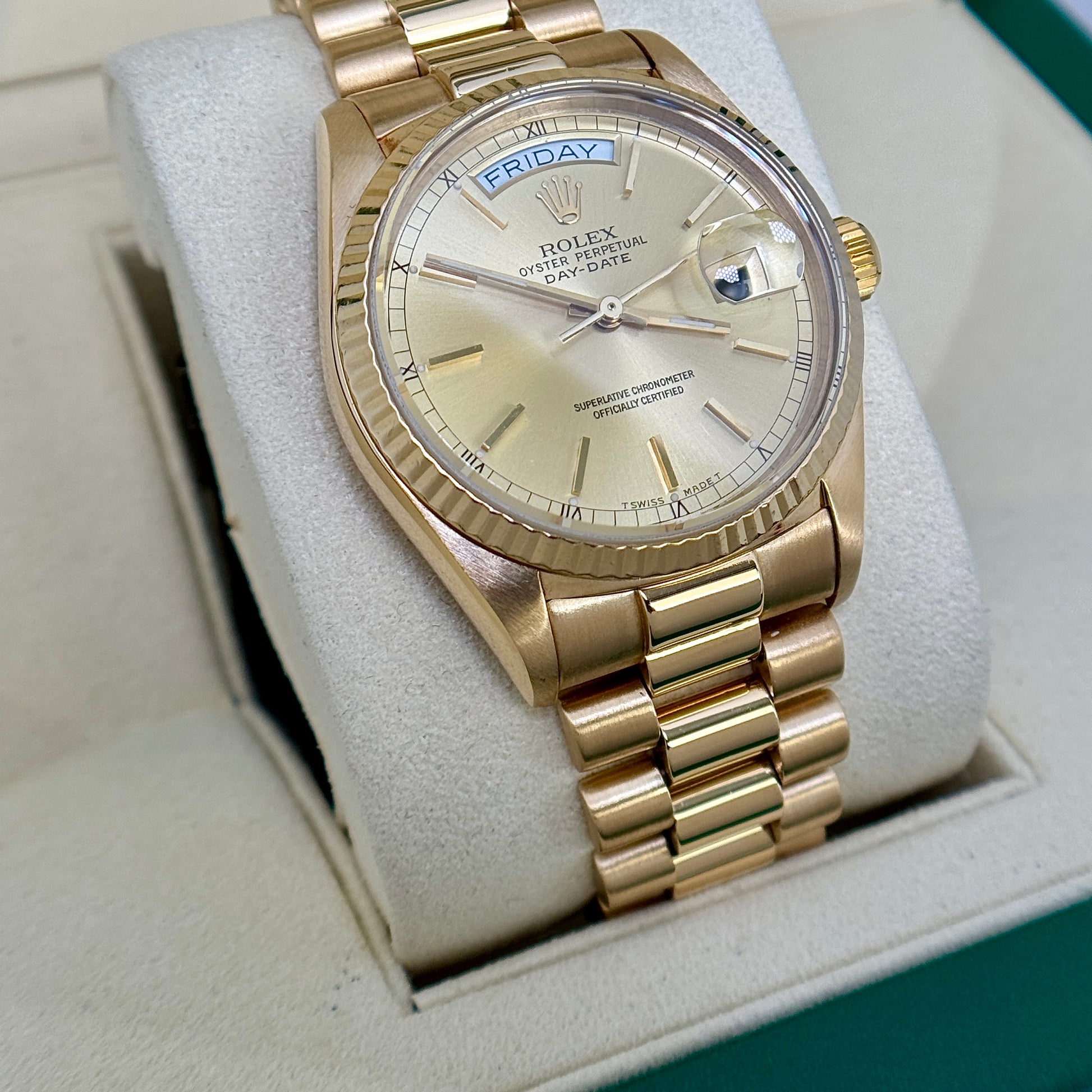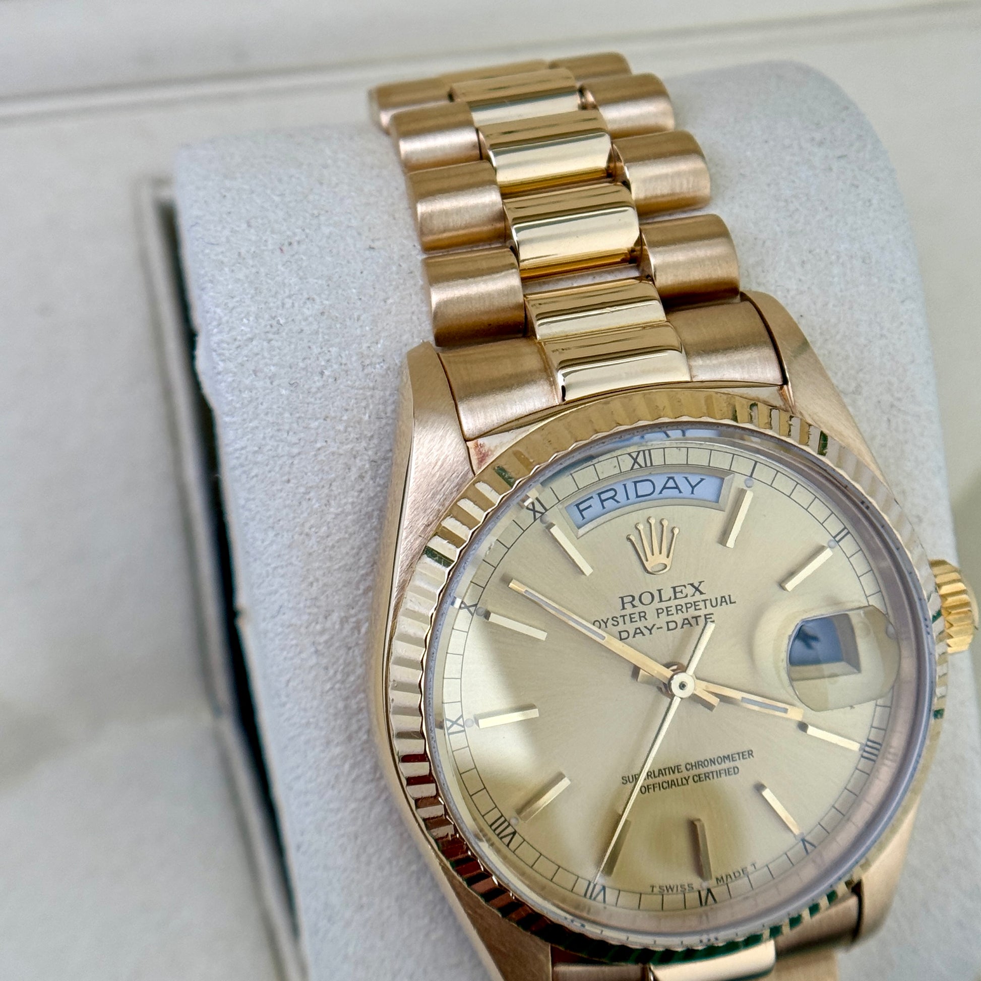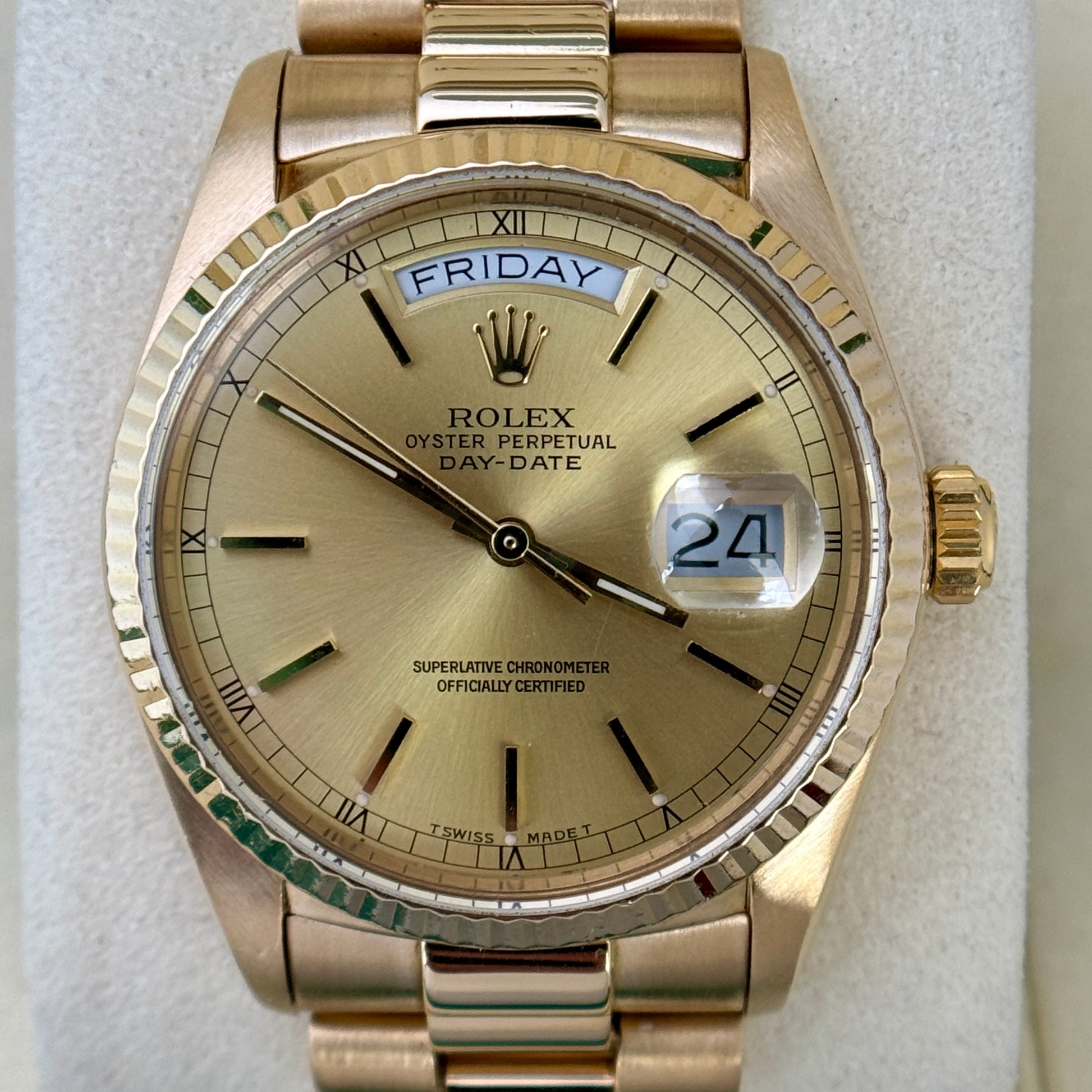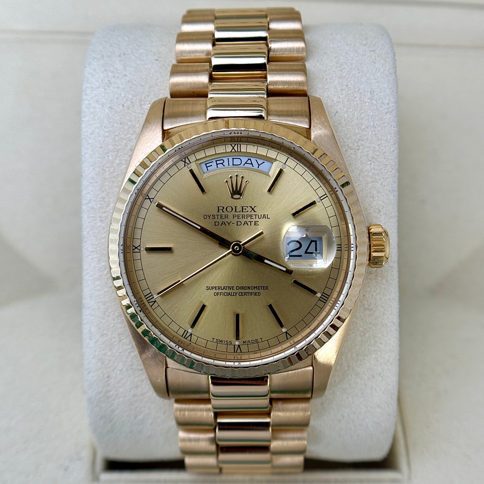 Rolex Day-Date 36 36mm President Champagne Dial 18K Gold Fluted Bezel Quickset