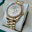 A distinguished and classic Rolex Day-Date 36 reference 18038, crafted in solid 18K yellow gold. This example from approximately 1986 features a champagne sunburst dial with Roman numeral outer track, matching yellow gold hands and baton hour markers. Fitted on a matching 18K yellow gold President bracelet with concealed clasp, this Day-Date offers timeless elegance and daily wear reliability. Powered by the Rolex caliber 3055, this watch features both day and date complications.