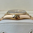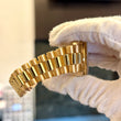 The case is made entirely of 18K yellow gold and measures 36mm in diameter. It features a fluted bezel and screw-down crown, with a sapphire crystal and Cyclops magnifier over the date at 3 o’clock. The champagne dial displays a clean and well-preserved sunburst finish with matching hands and indices. The day of the week is displayed at 12 o'clock in English.