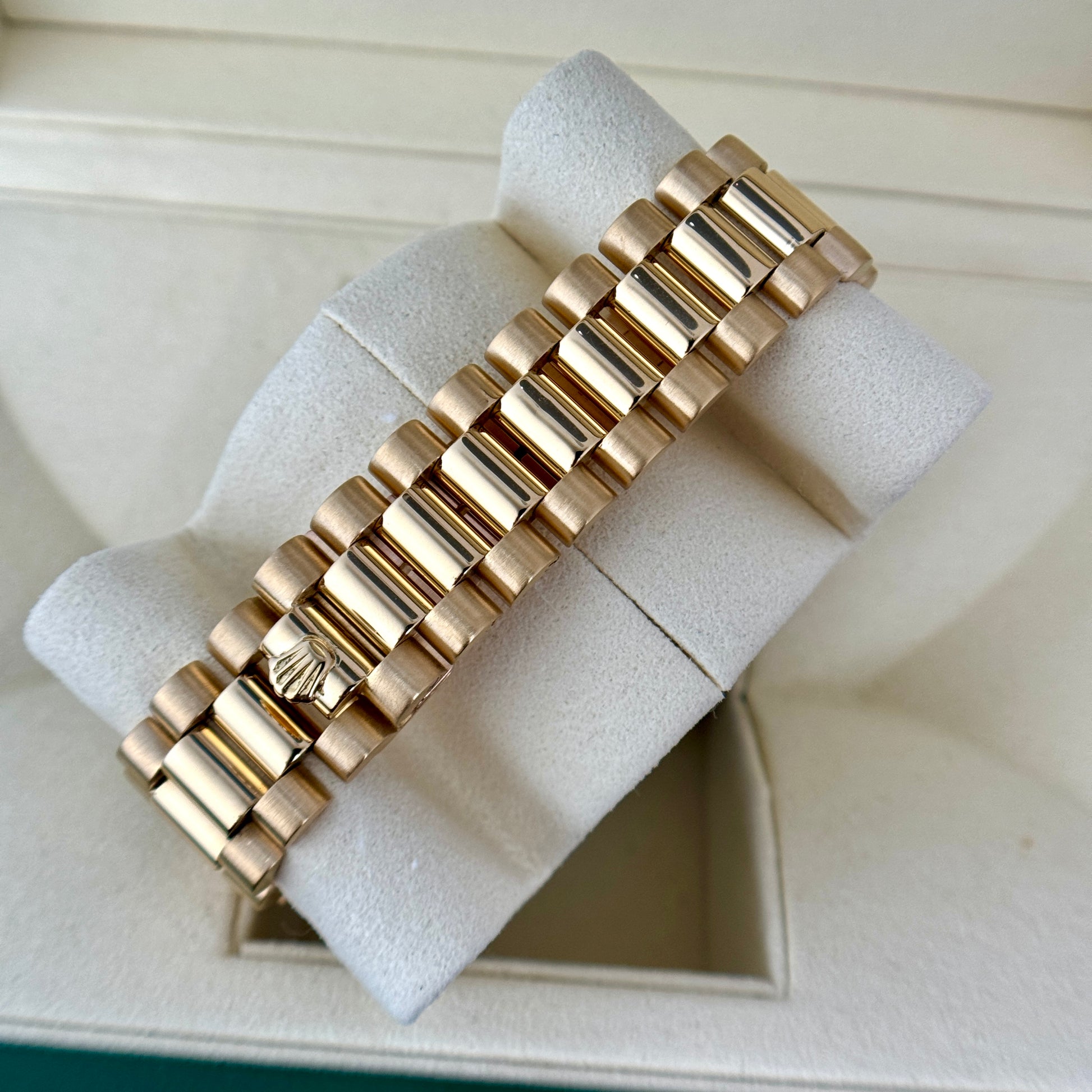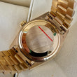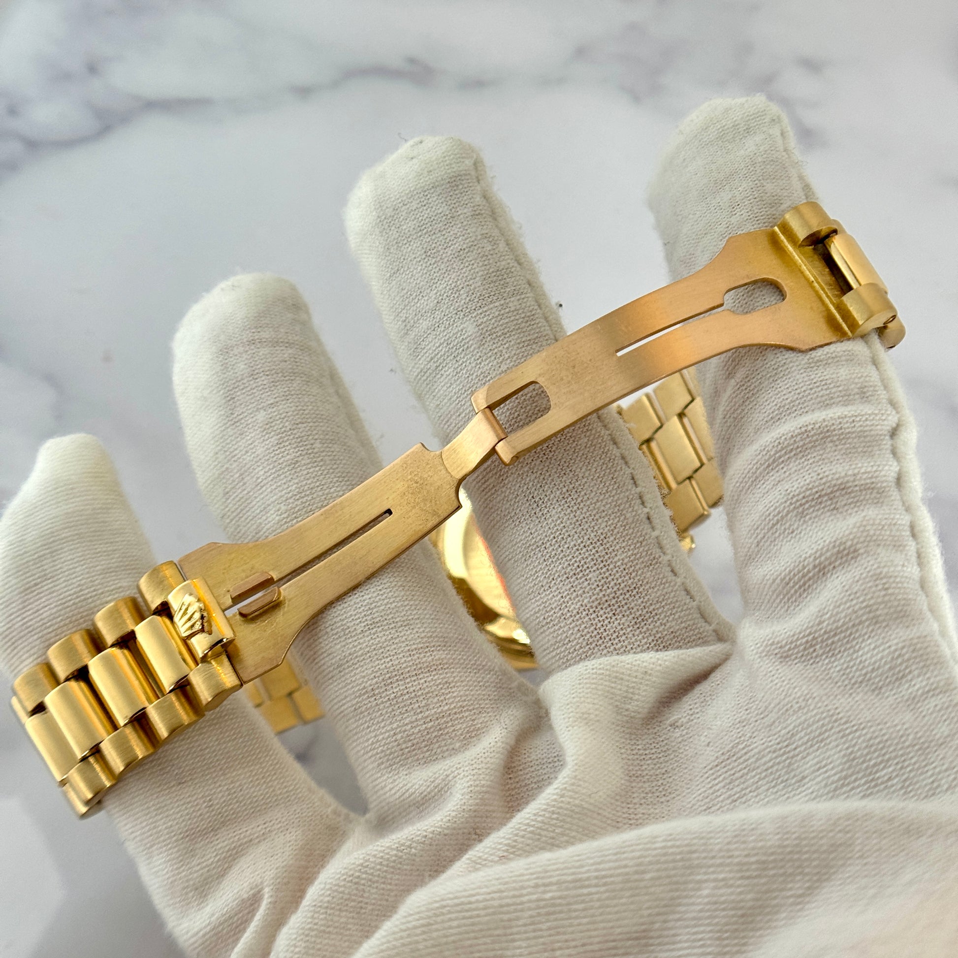 The watch is fitted on a solid 18K yellow gold President bracelet with a hidden fold clasp. The bracelet is in excellent condition with only minor stretch and retains strong structure and luster. It will comfortably fit up to a 7 1/2 -inch wrist.
