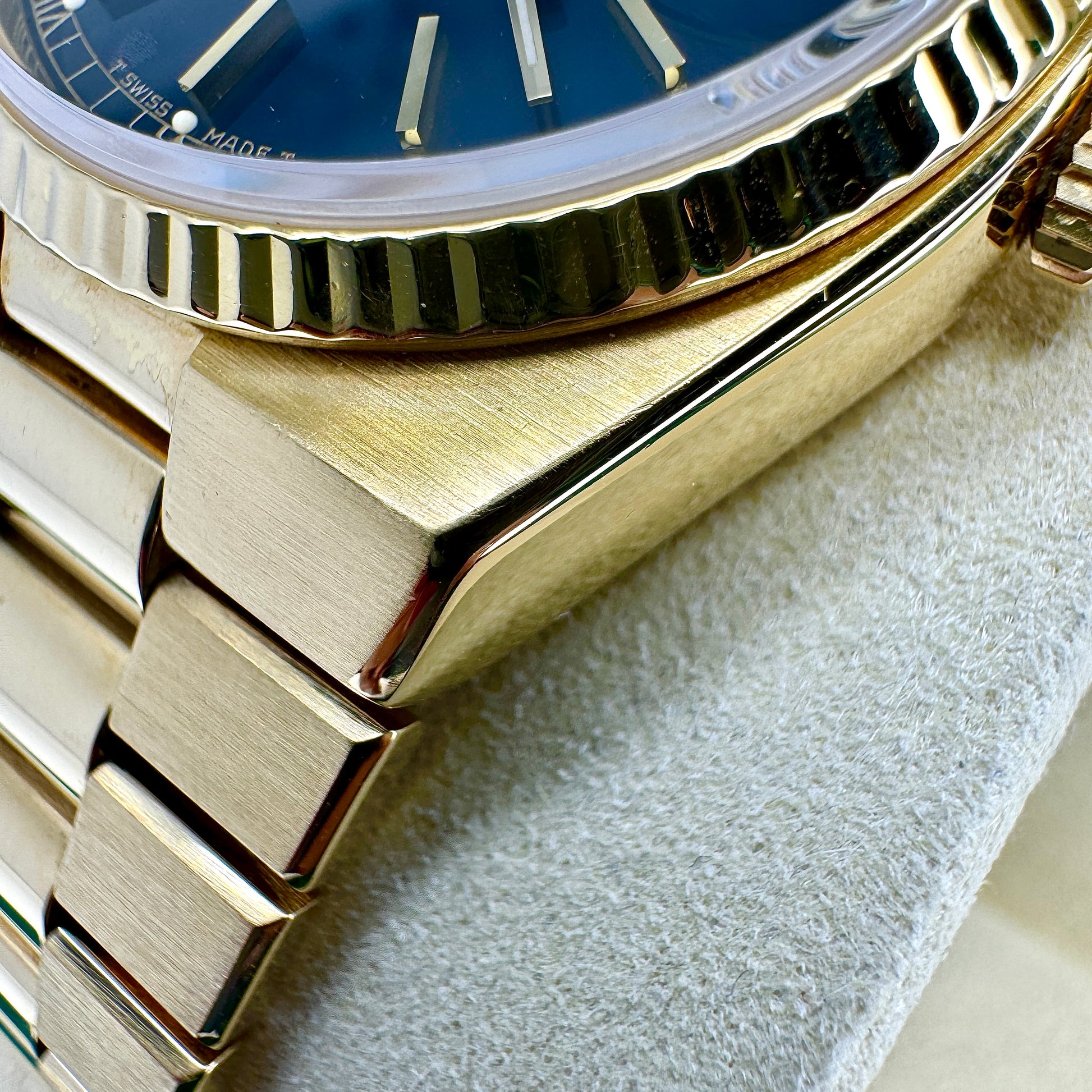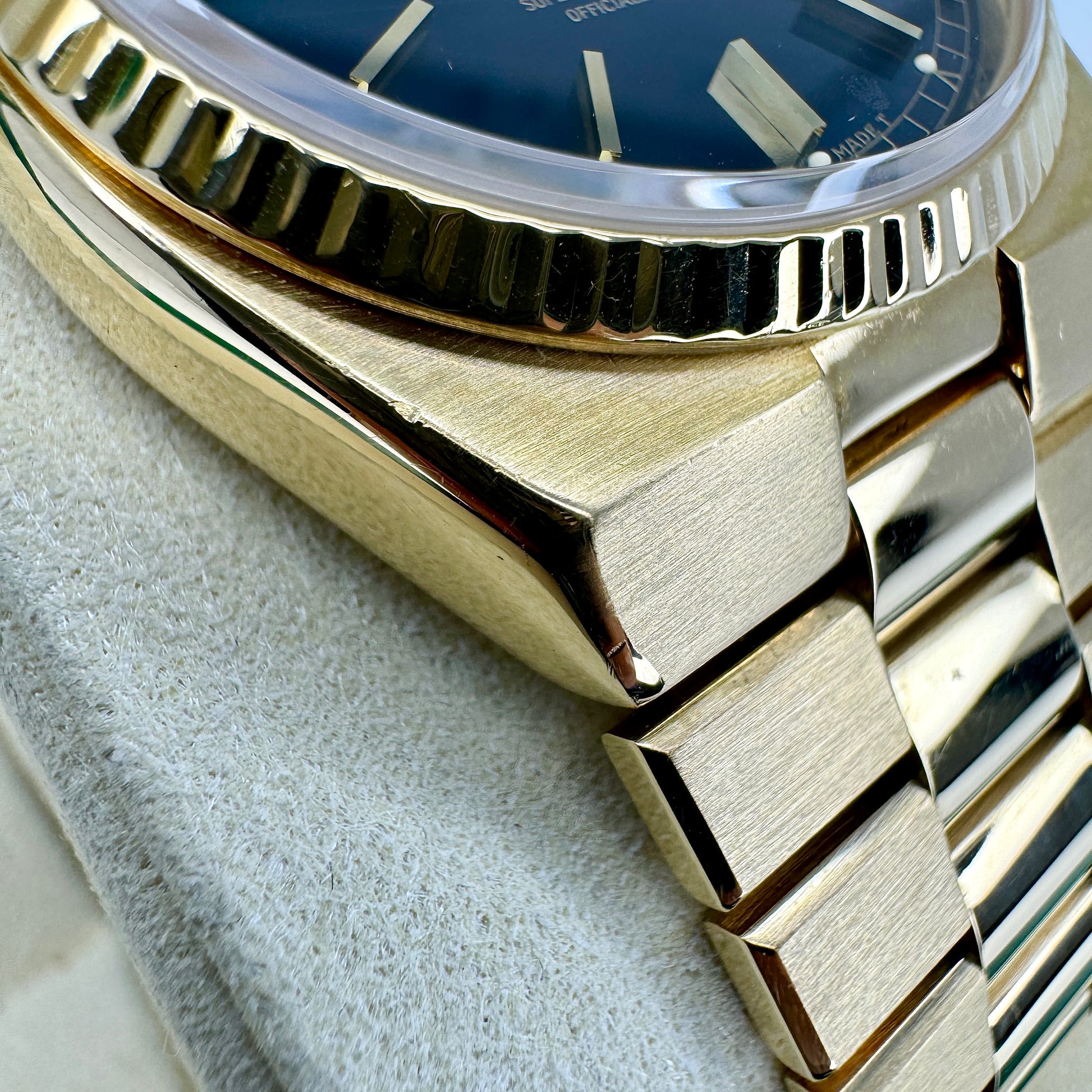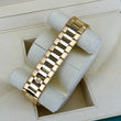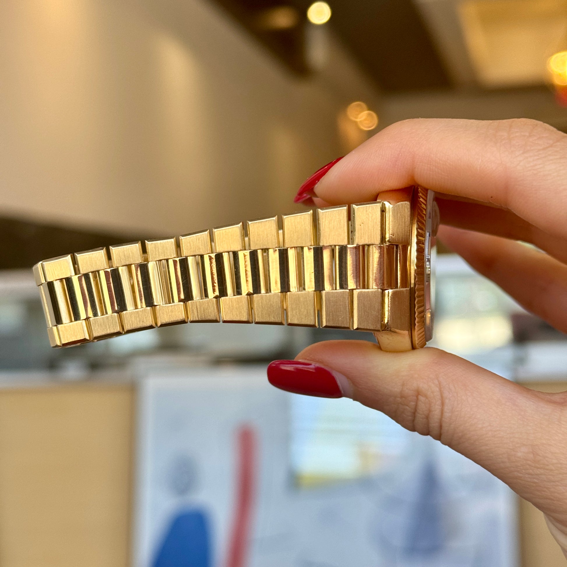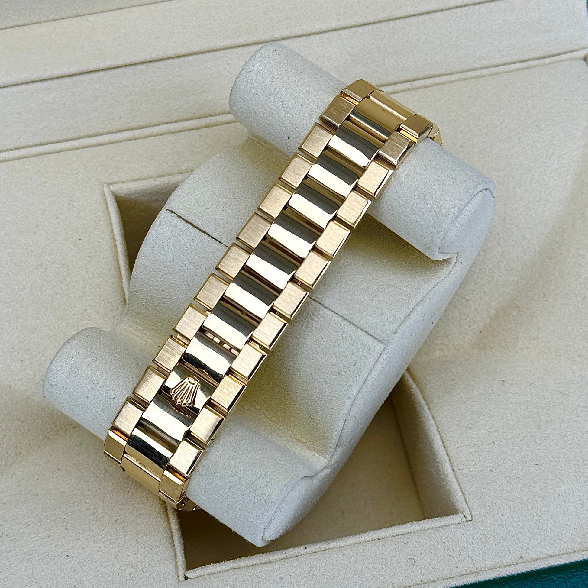 The watch is fitted with an 18K yellow gold Oysterquartz-style presidential bracelet, secured with a hidden fold clasp. The bracelet accommodates wrists up to 7.25 inches.