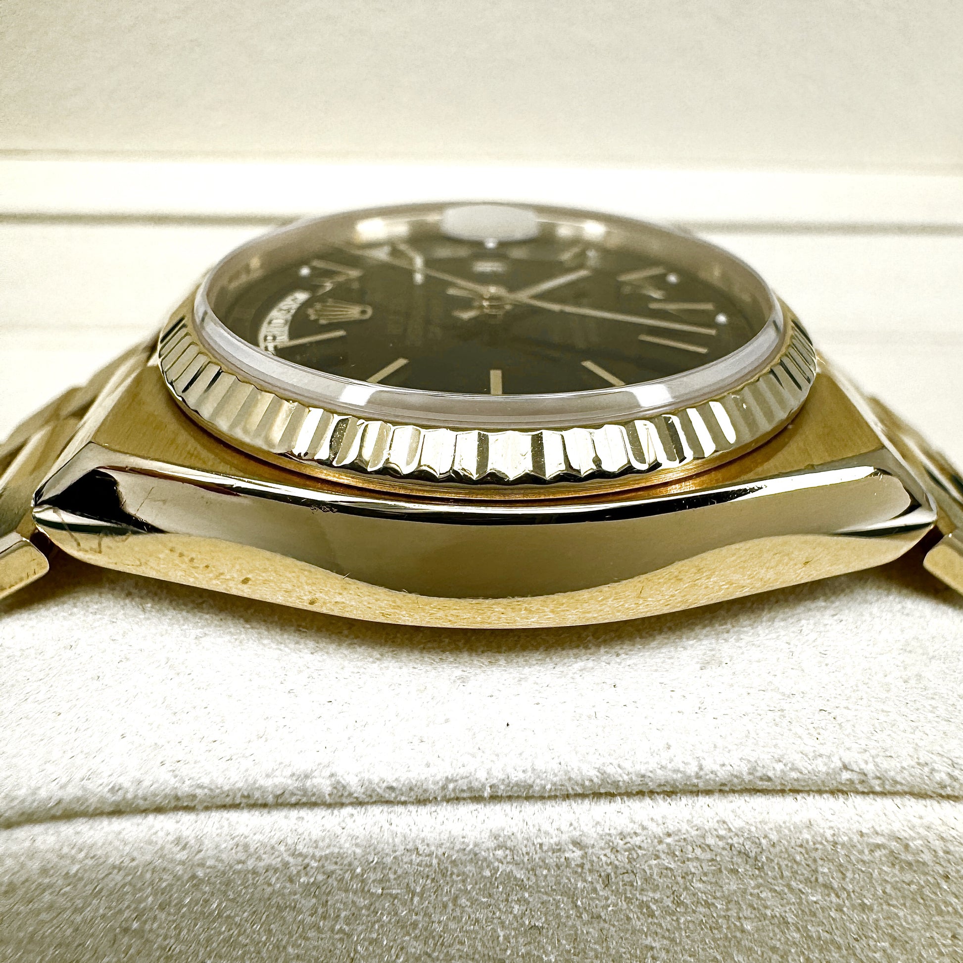 A sporty and vintage 18K yellow gold Rolex Oysterquartz Day-Date in 36mm. This wristwatch features a fluted bezel and a striking matte black dial. Produced in 1979, model reference 19018, it is all original Rolex and comes accompanied by a Bucherer travel pouch.