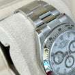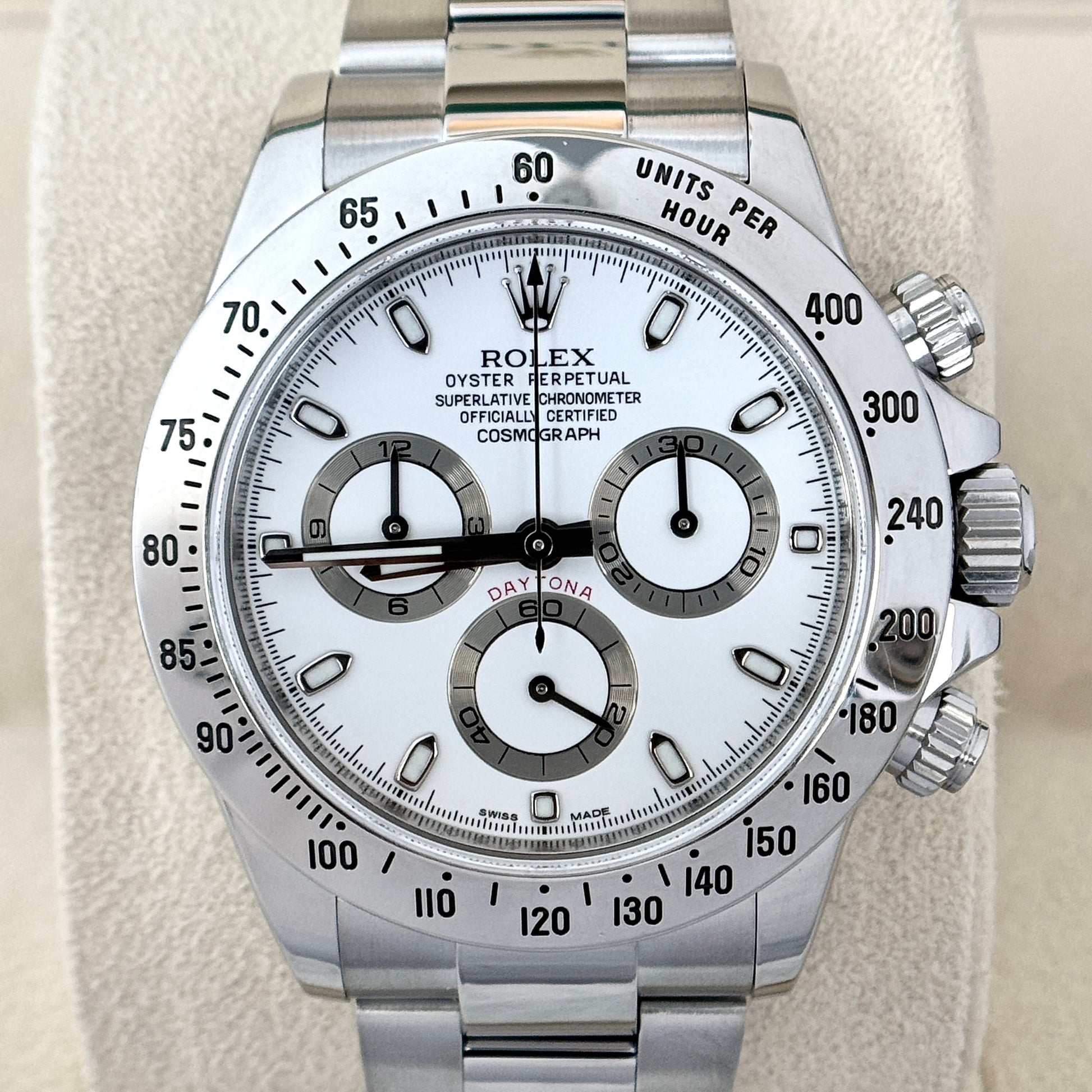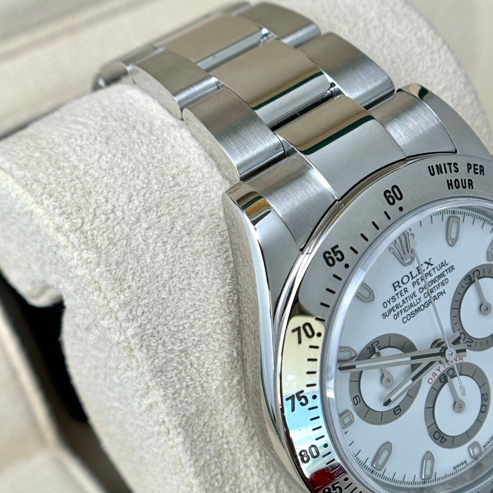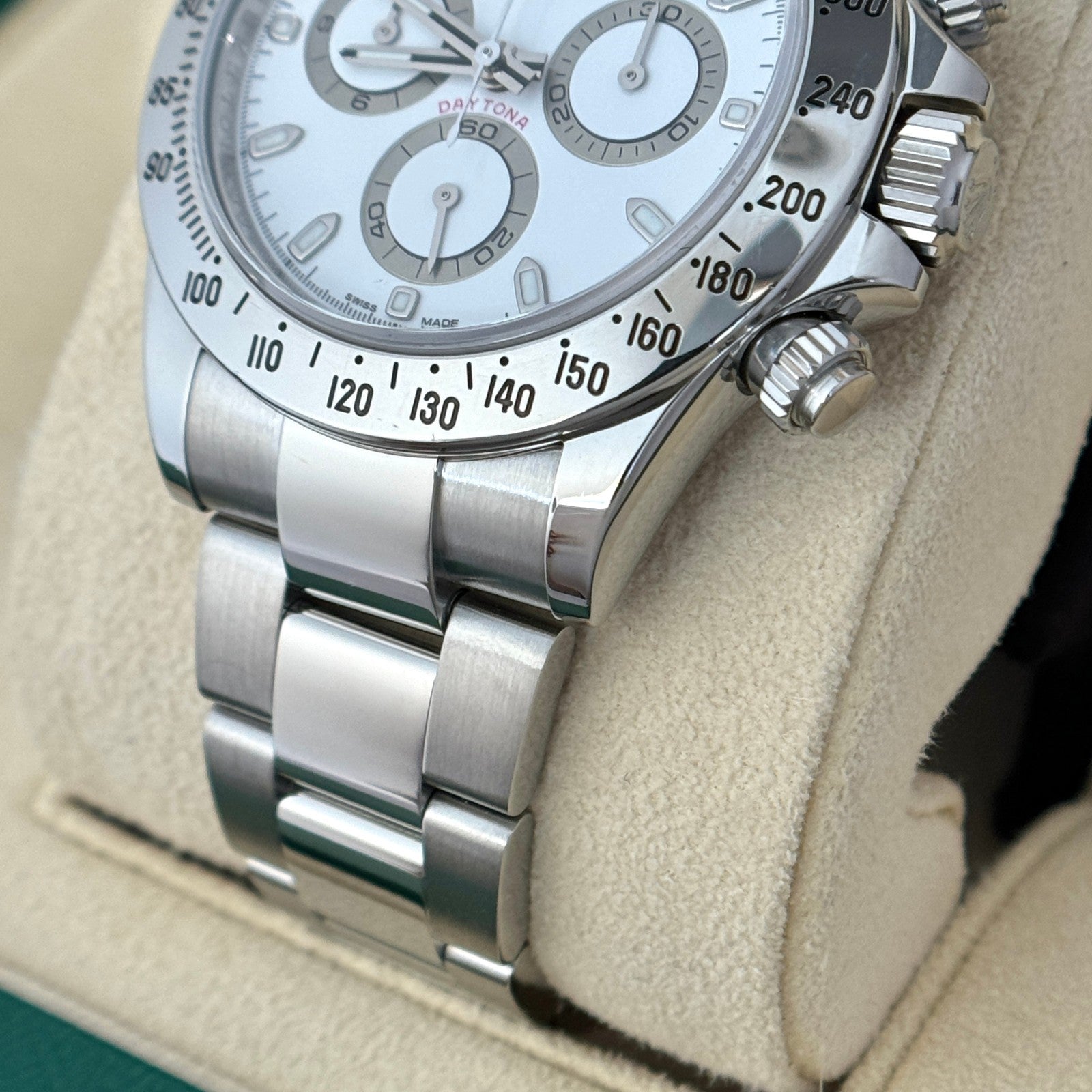 The 40mm case is crafted in 904L stainless steel with a polished finish on the lugs and sides. The white glossy dial is known as an APH dial due to the unique spacing in the word Cosmograph, a distinguishing feature sought after by collectors. The tachymeter bezel is engraved with units per hour for calculating average speed over distance. The case back is solid steel and secured by a screw-down mechanism.