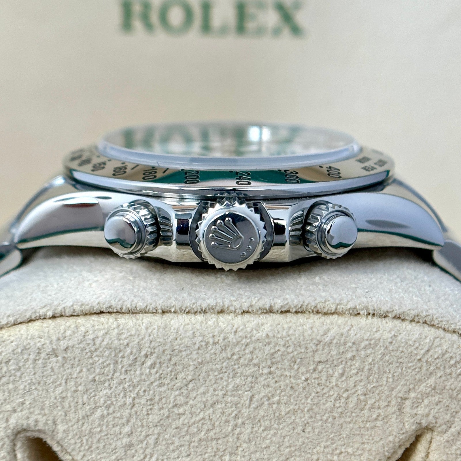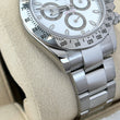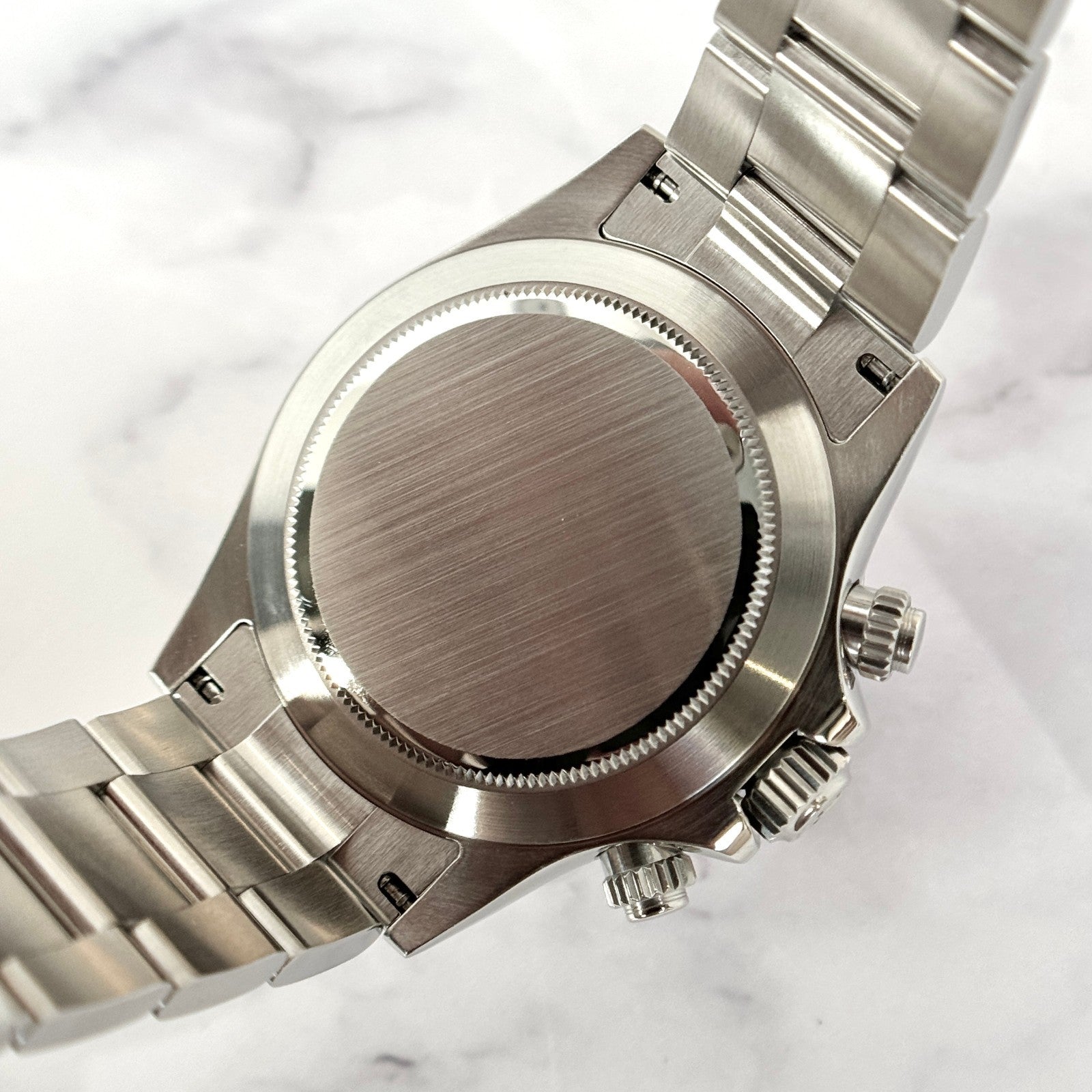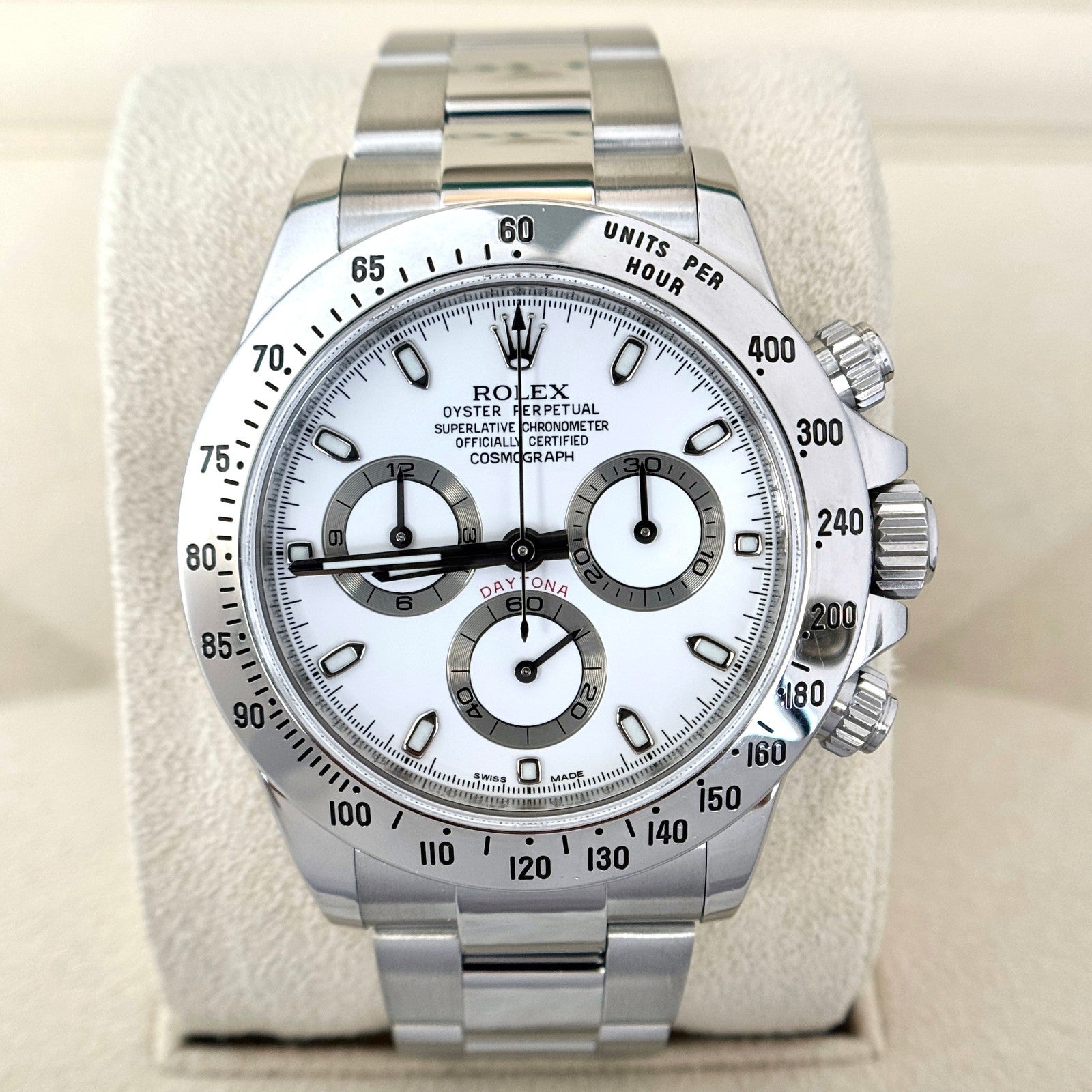 The 40mm case is crafted in 904L stainless steel with a polished finish on the lugs and sides. The white glossy dial is known as an APH dial due to the unique spacing in the word Cosmograph, a distinguishing feature sought after by collectors. The tachymeter bezel is engraved with units per hour for calculating average speed over distance. The case back is solid steel and secured by a screw-down mechanism.