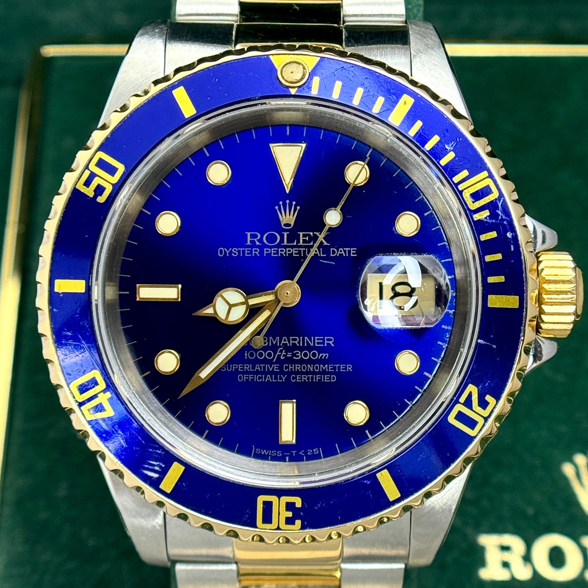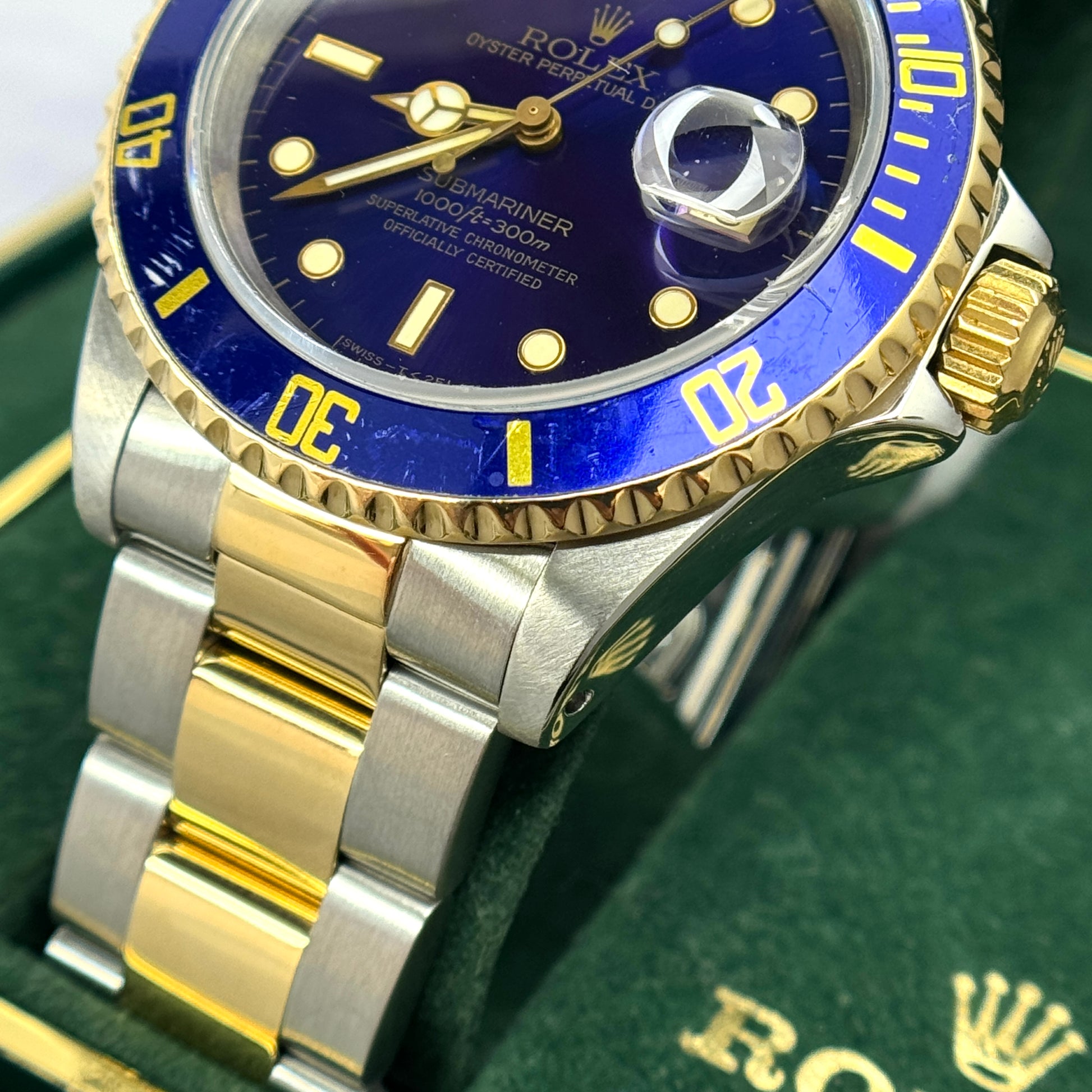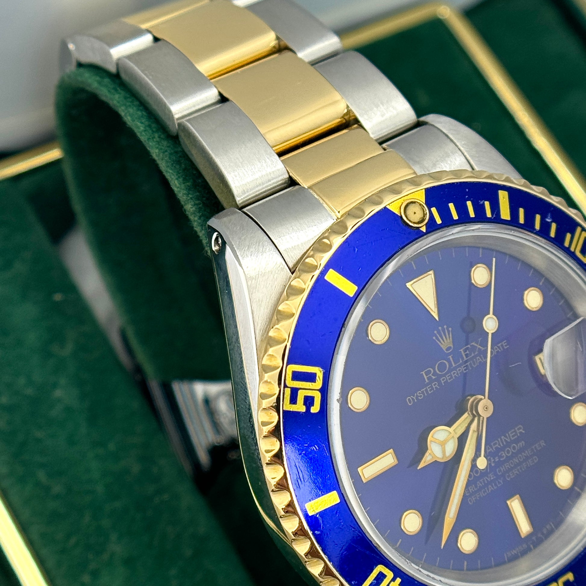 An iconic and timeless vintage two tone Rolex Submariner featuring a blue dial and matching blue bezel. The stainless steel and 18k yellow gold Submariner has model number 16613 and has an E serial number dating the production of the watch to 1990. The watch has its original Rolex box. The watch is all original.