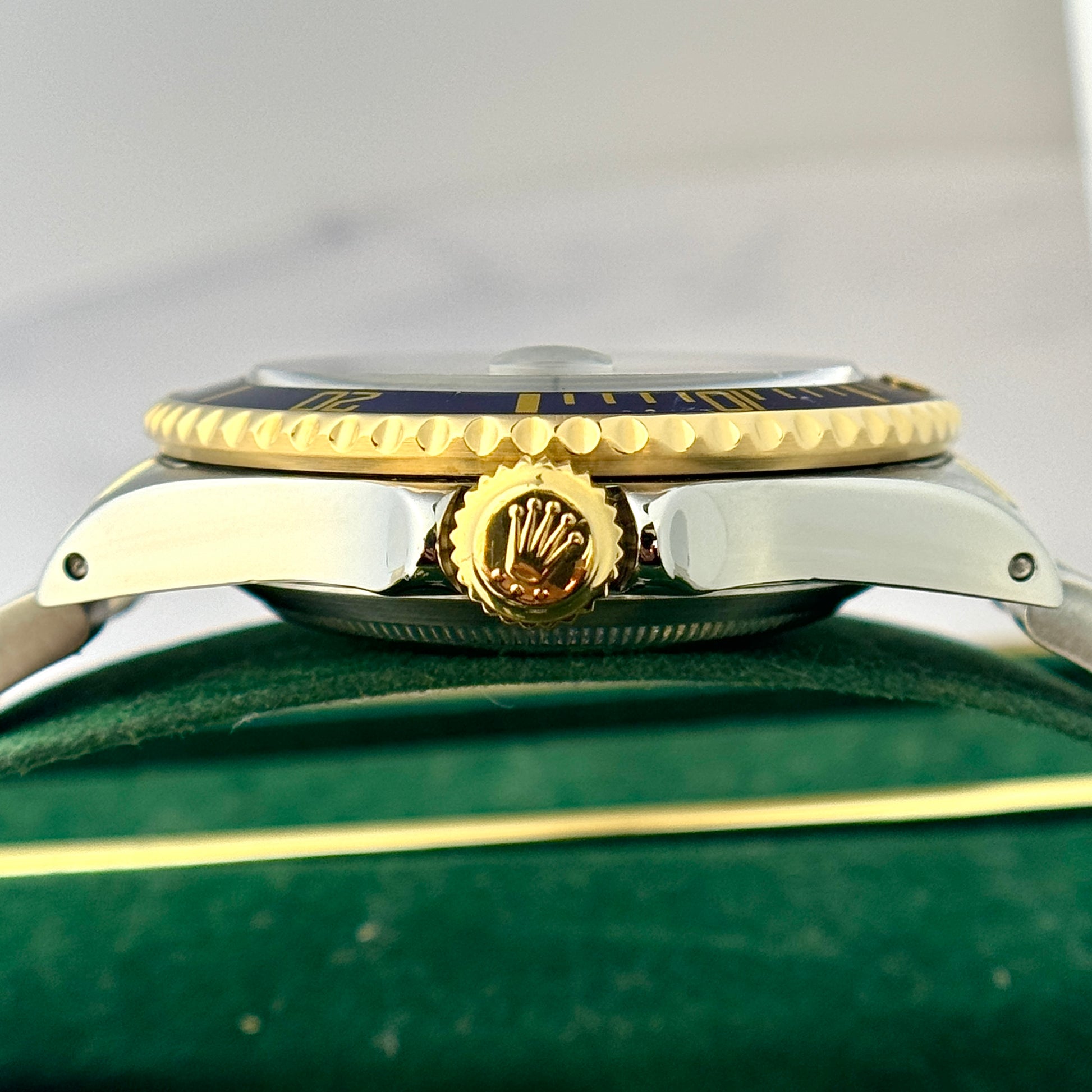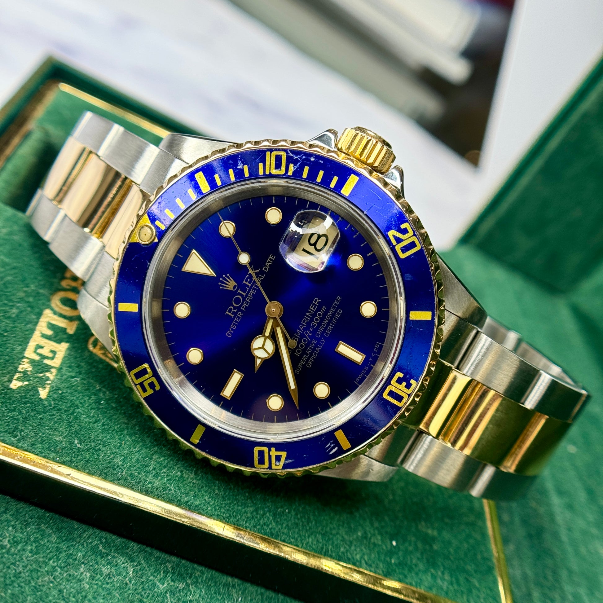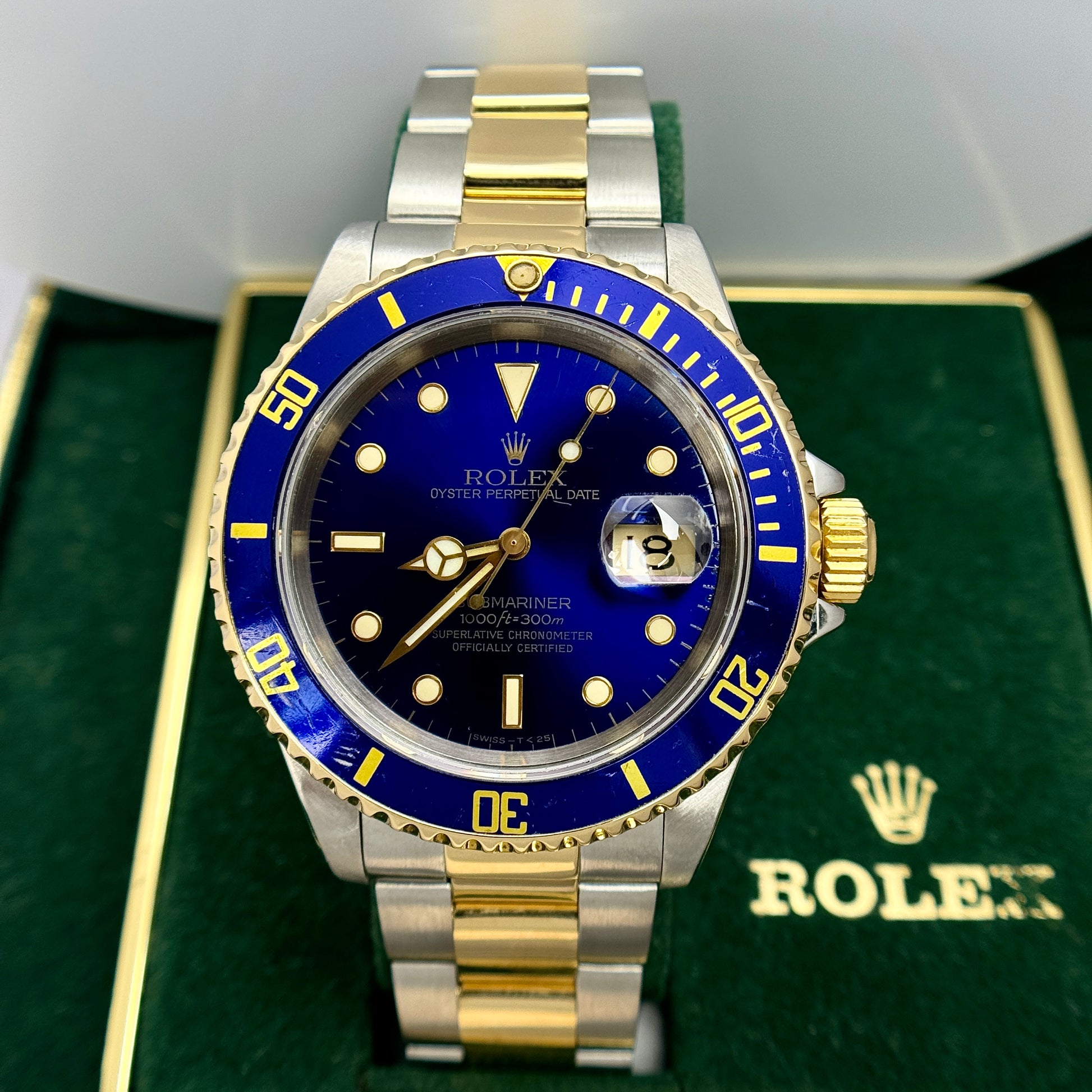 An iconic and timeless vintage two tone Rolex Submariner featuring a blue dial and matching blue bezel. The stainless steel and 18k yellow gold Submariner has model number 16613 and has an E serial number dating the production of the watch to 1990. The watch has its original Rolex box. The watch is all original.