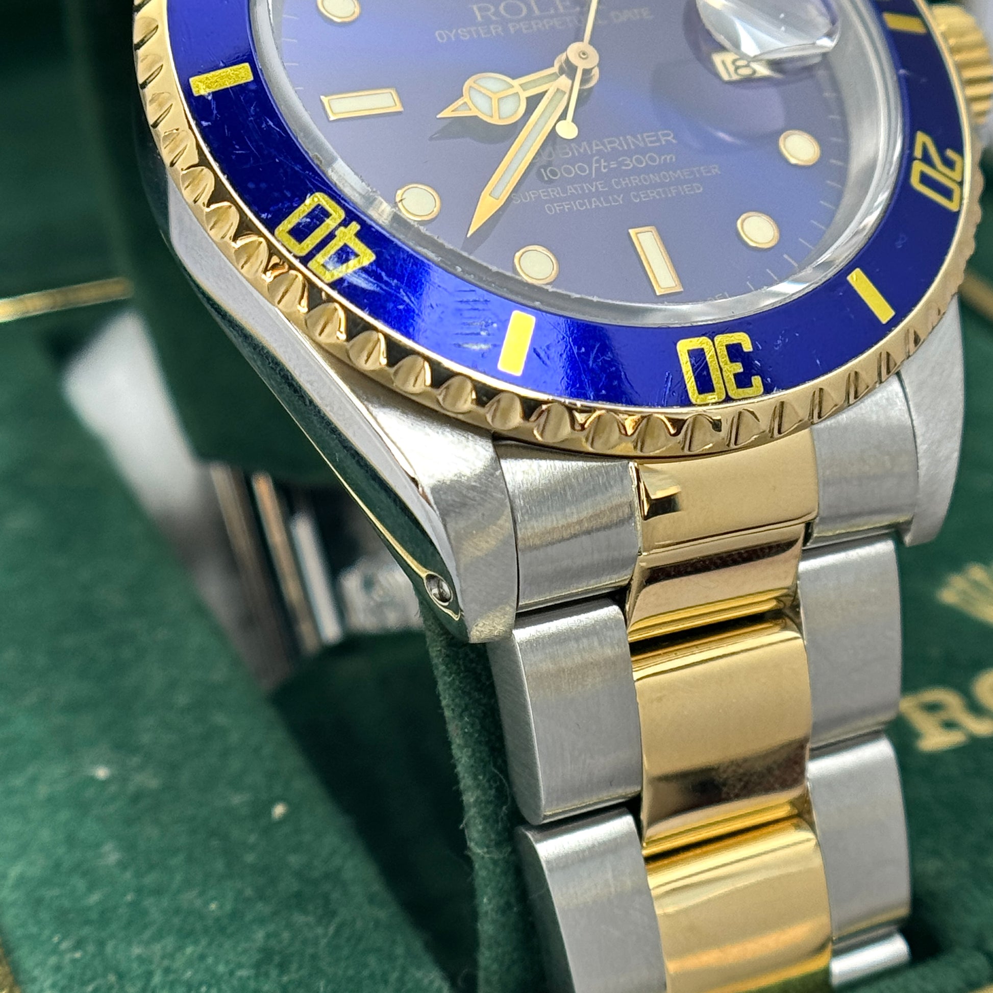 The watch is in excellent condition with noteable signs of wear on the blue bezel insert. The insert can be replaced for a $150 charge. The replacement insert is original Rolex. The case is in excellent condition with no dents or dings. The watch has been tested by machine for accuracy and water resistance passing to Rolex standards.