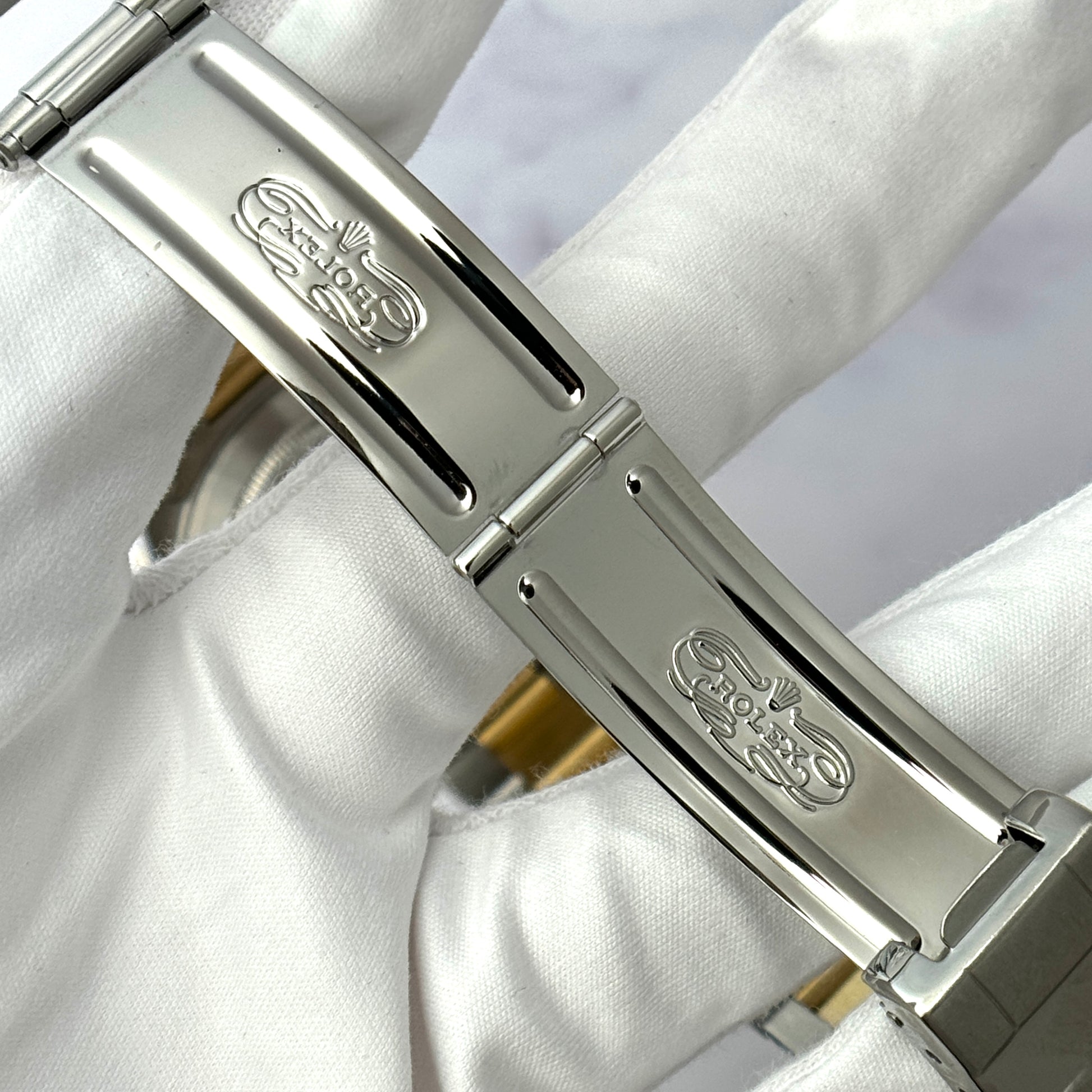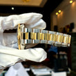The bracelet is two tone stainless steel and yellow gold. The bracelet is oyster style with a stainless steel deployant buckle. The buckle has the divers extension link to fit over a wet suit. The watch has 12 links and 2 end links and will fit up to a 7.75 inch wrist with ease. The bracelet has very little sag.