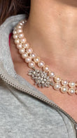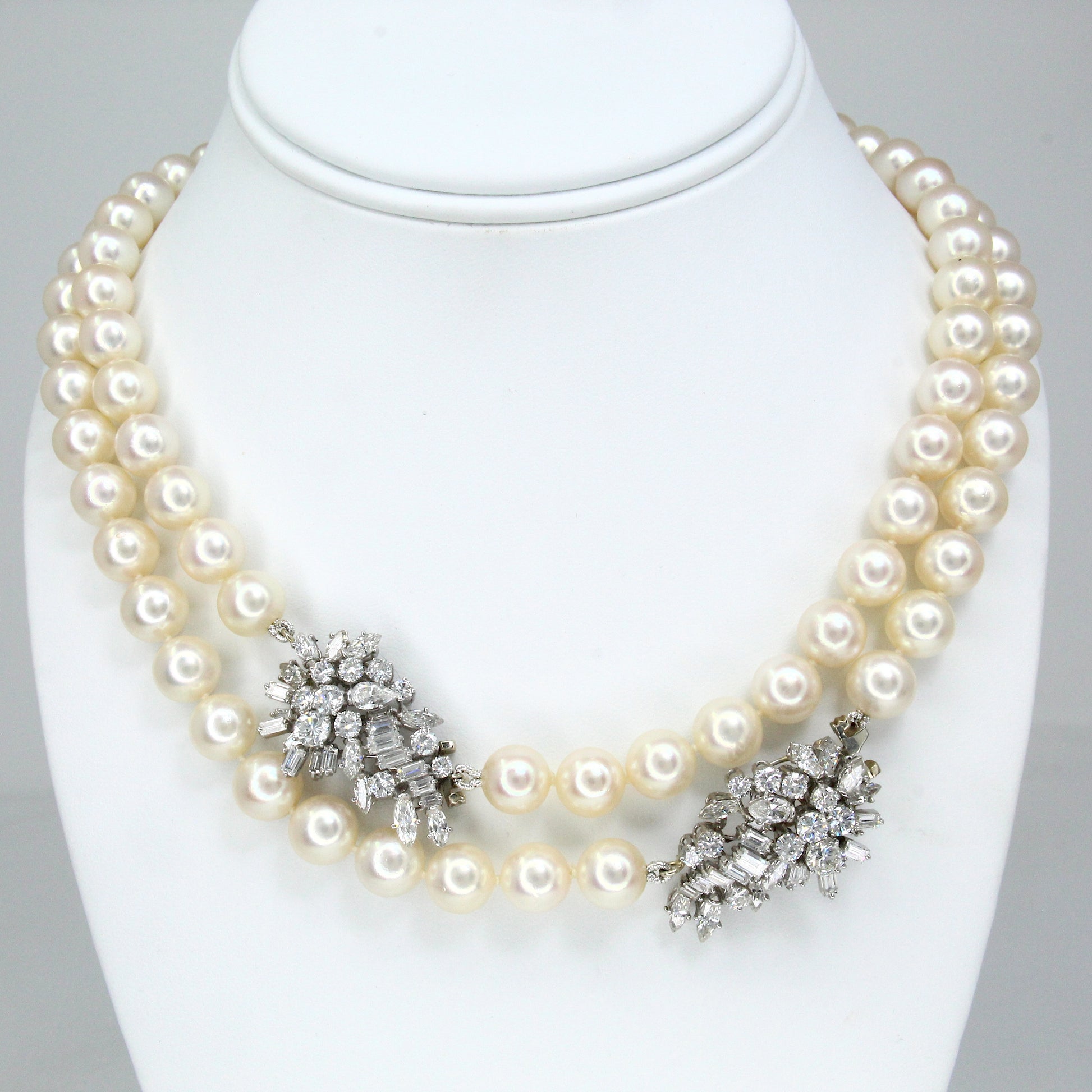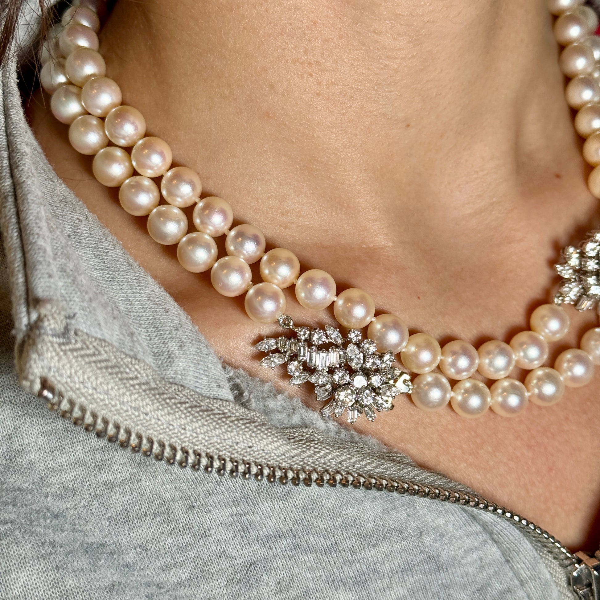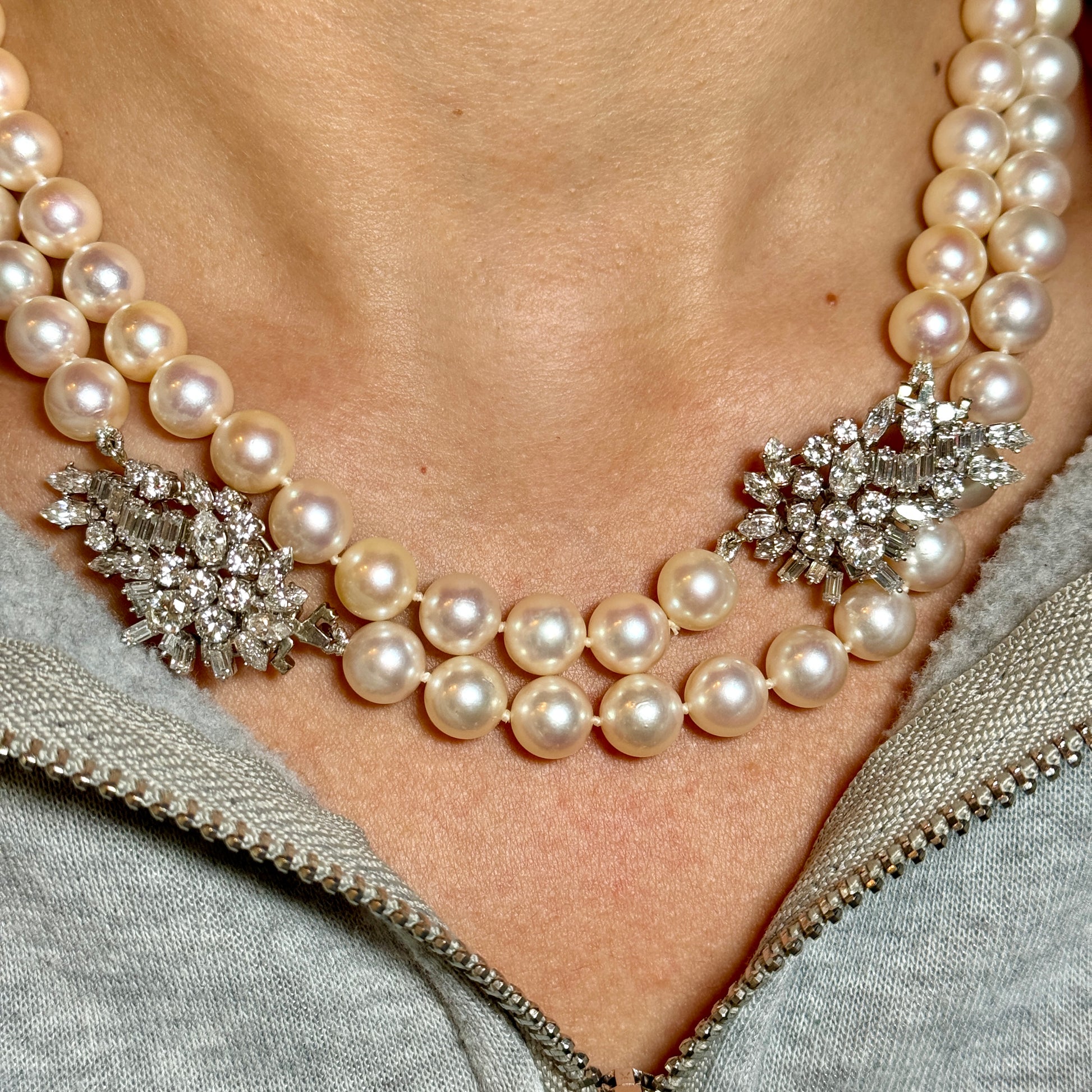 Each strand is individually knotted and finished with a refined platinum clasp, accented with natural earth-mined round brilliant cut white diamonds weighing approximately 5 1/2 carats for both necklaces. The diamond clasps add a discreet touch of brilliance, completing a timeless and sophisticated pearl suite suitable for formal wear or fine jewelry collections.