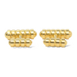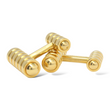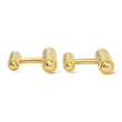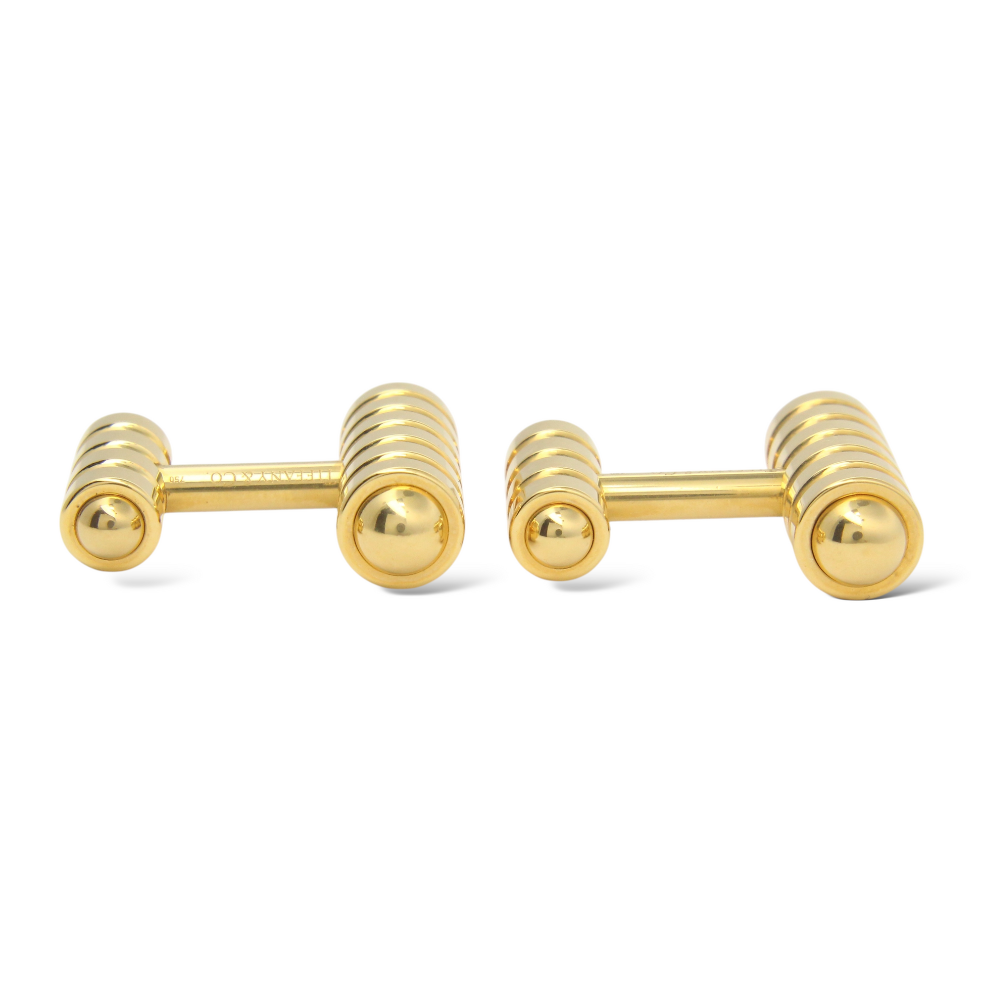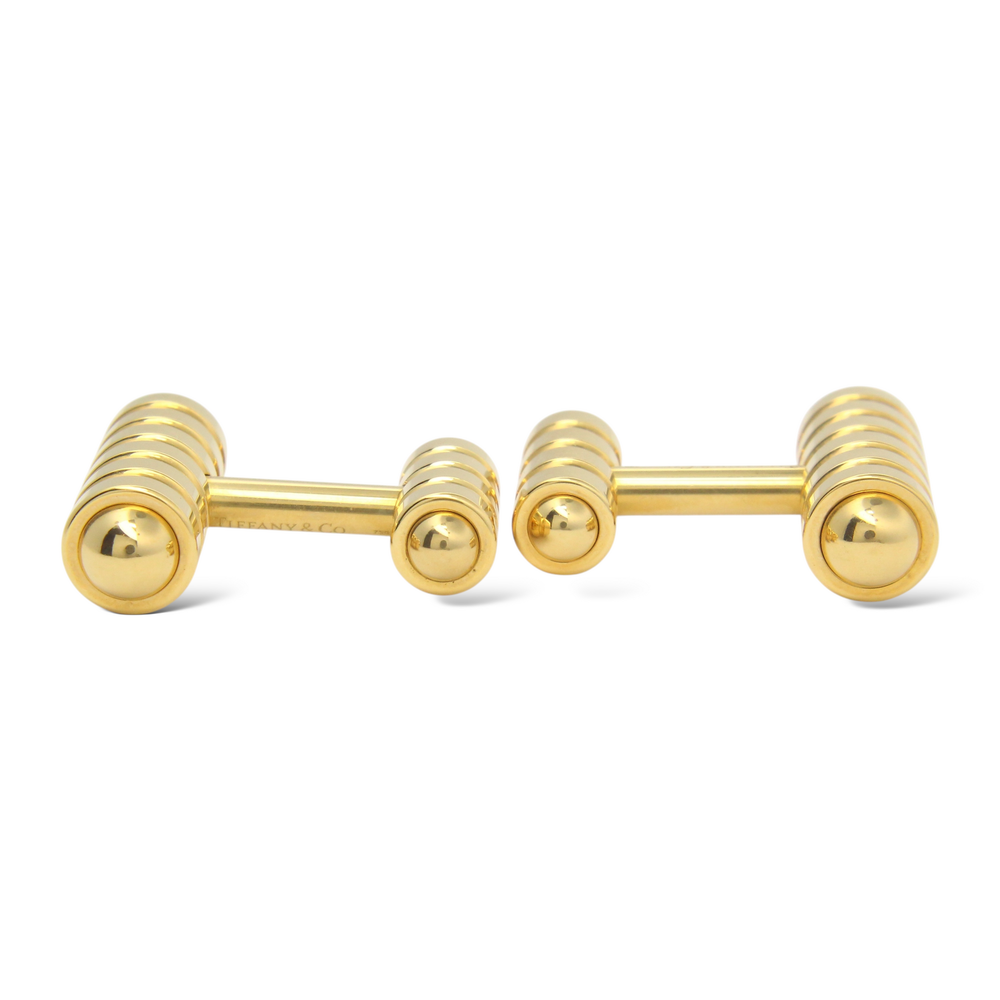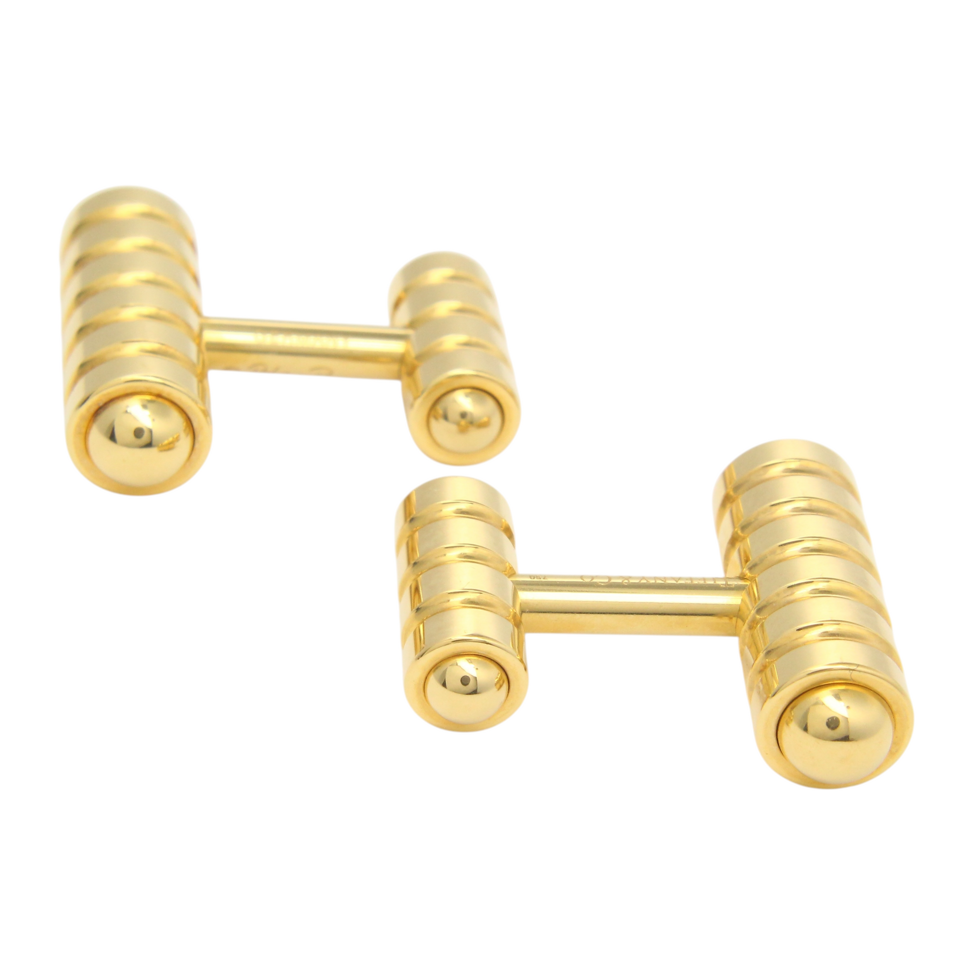 This authentic pair of Tiffany & Co. cufflinks, designed by Paloma Picasso, is crafted in solid 18K yellow gold and showcases a refined, sculptural barbell design. Each cufflink features ribbed cylindrical ends accented by polished dome caps, creating a striking interplay of texture and smooth surfaces. The substantial weight and clean, minimalist form reflect Tiffany & Co.’s signature balance of timeless elegance and modern sophistication. These cufflinks are original and genuine Tiffany & Co. pieces and include the original Tiffany & Co. box and outer box, adding collectible value and presentation appeal.
