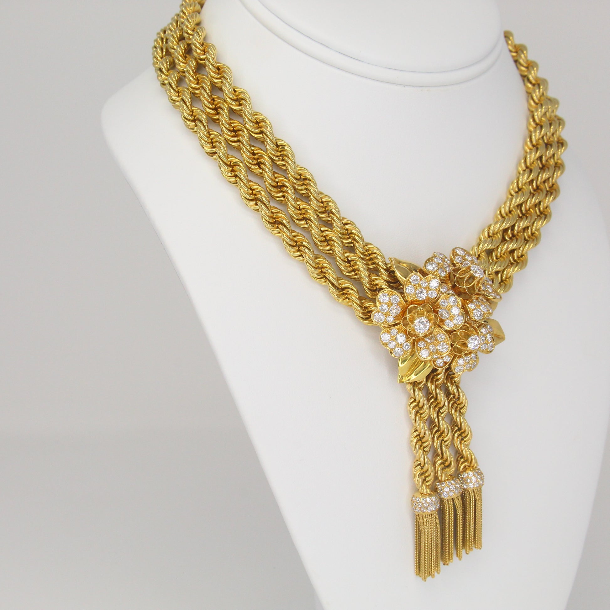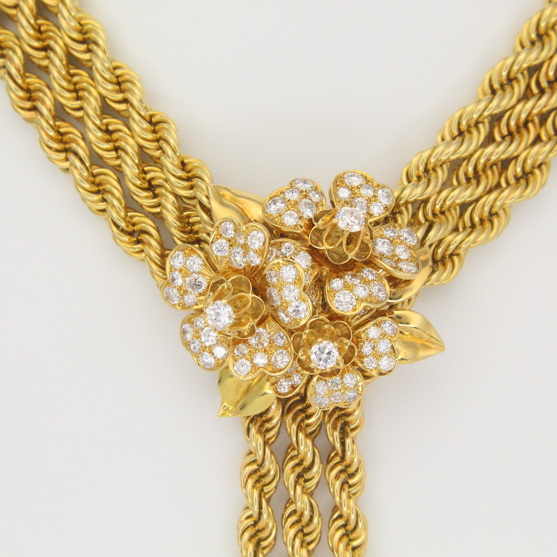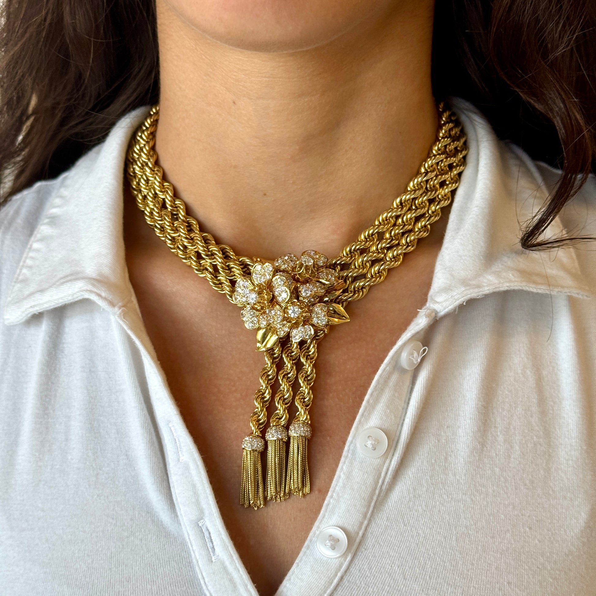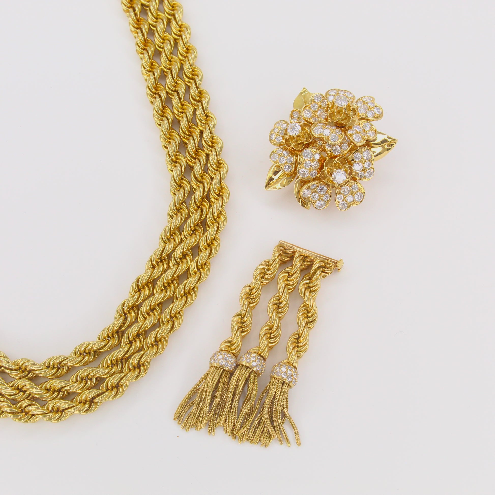 A remarkable creation from Van Cleef & Arpels The Collection, this necklace features three strands of twisted rope gold joined at the center by a floral diamond-set brooch with cascading tassels. The brooch is detachable and can be worn separately, while the necklace can be converted into three individual bracelets and one extender segment. Each component is numbered.