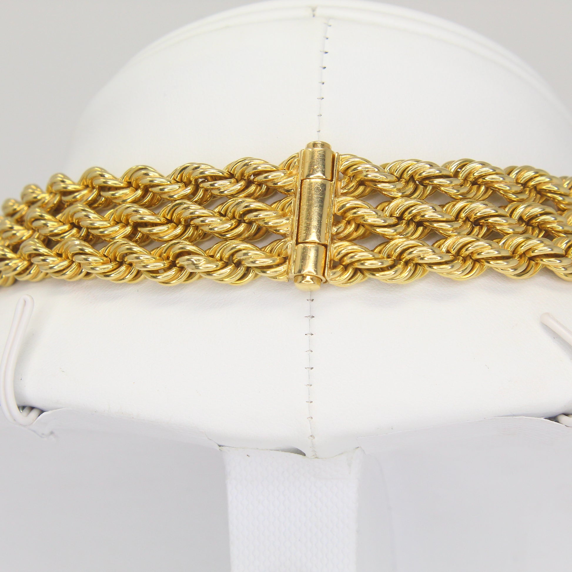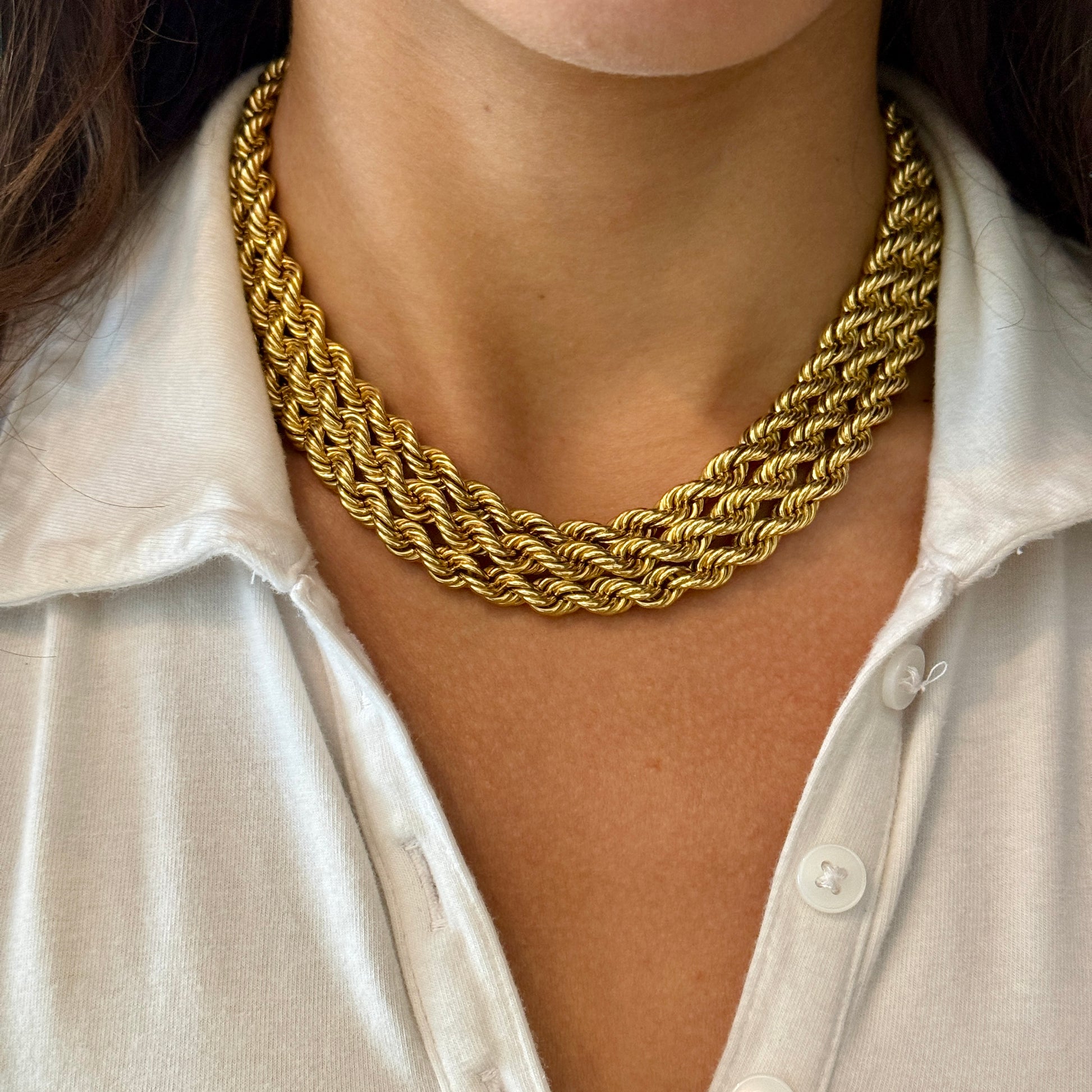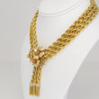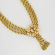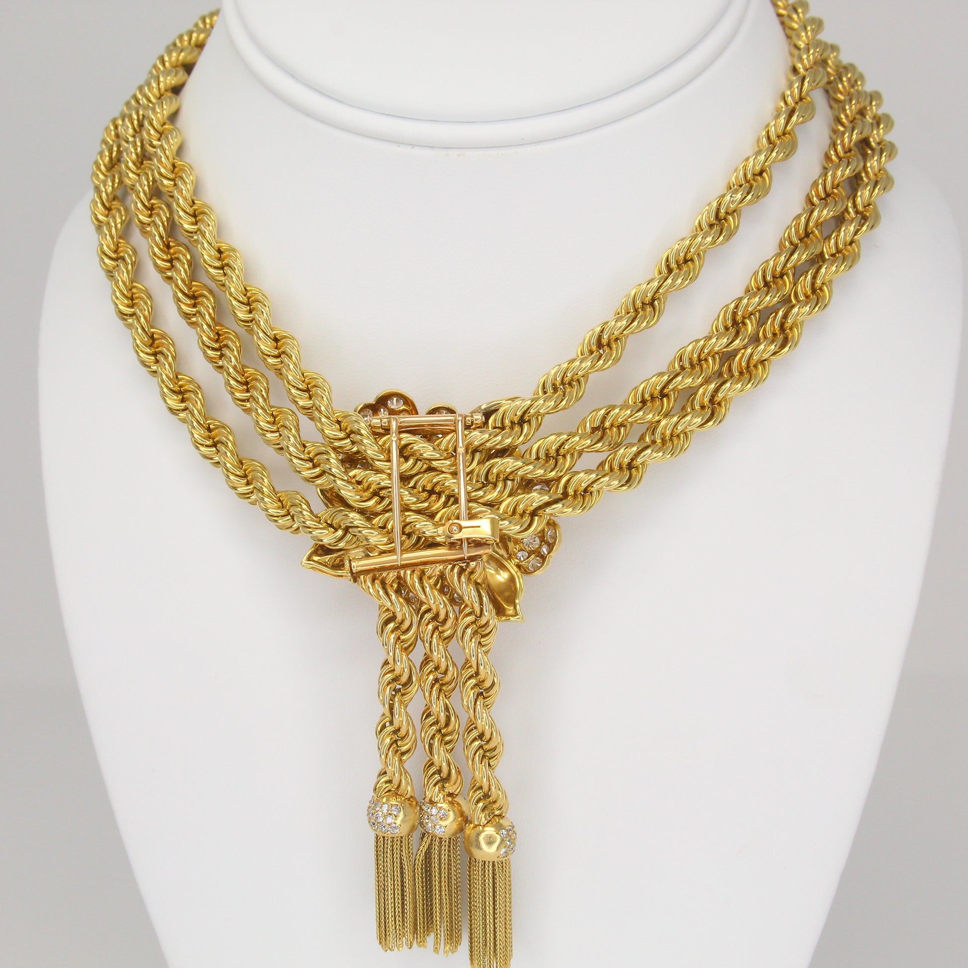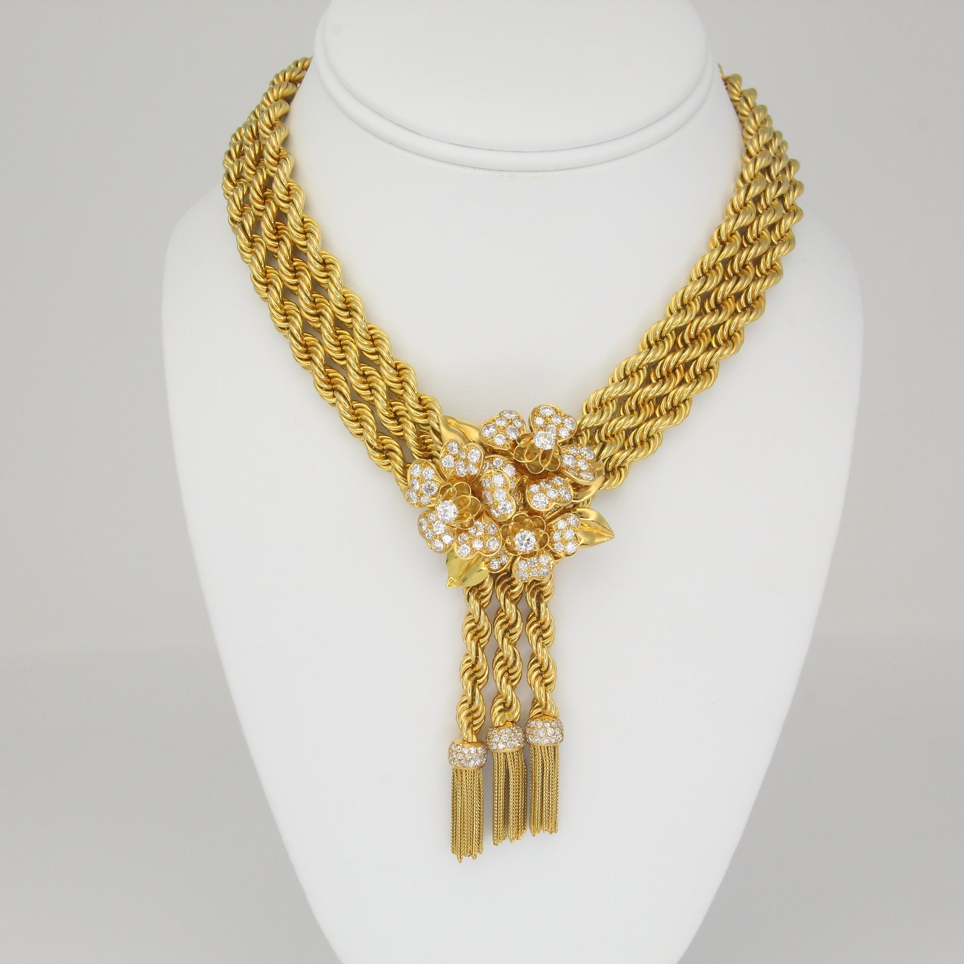 A remarkable creation from Van Cleef & Arpels The Collection, this necklace features three strands of twisted rope gold joined at the center by a floral diamond-set brooch with cascading tassels. The brooch is detachable and can be worn separately, while the necklace can be converted into three individual bracelets and one extender segment. Each component is numbered.