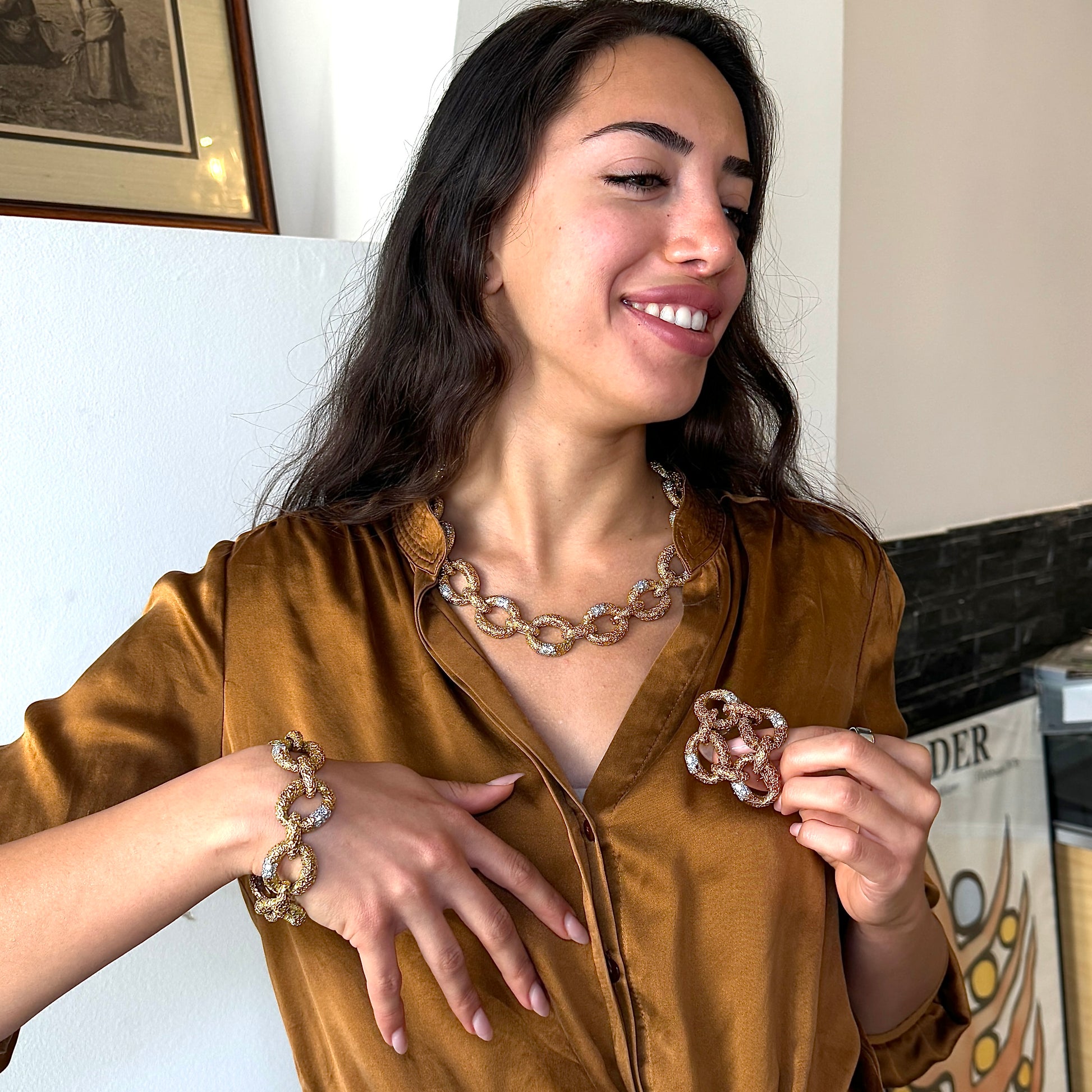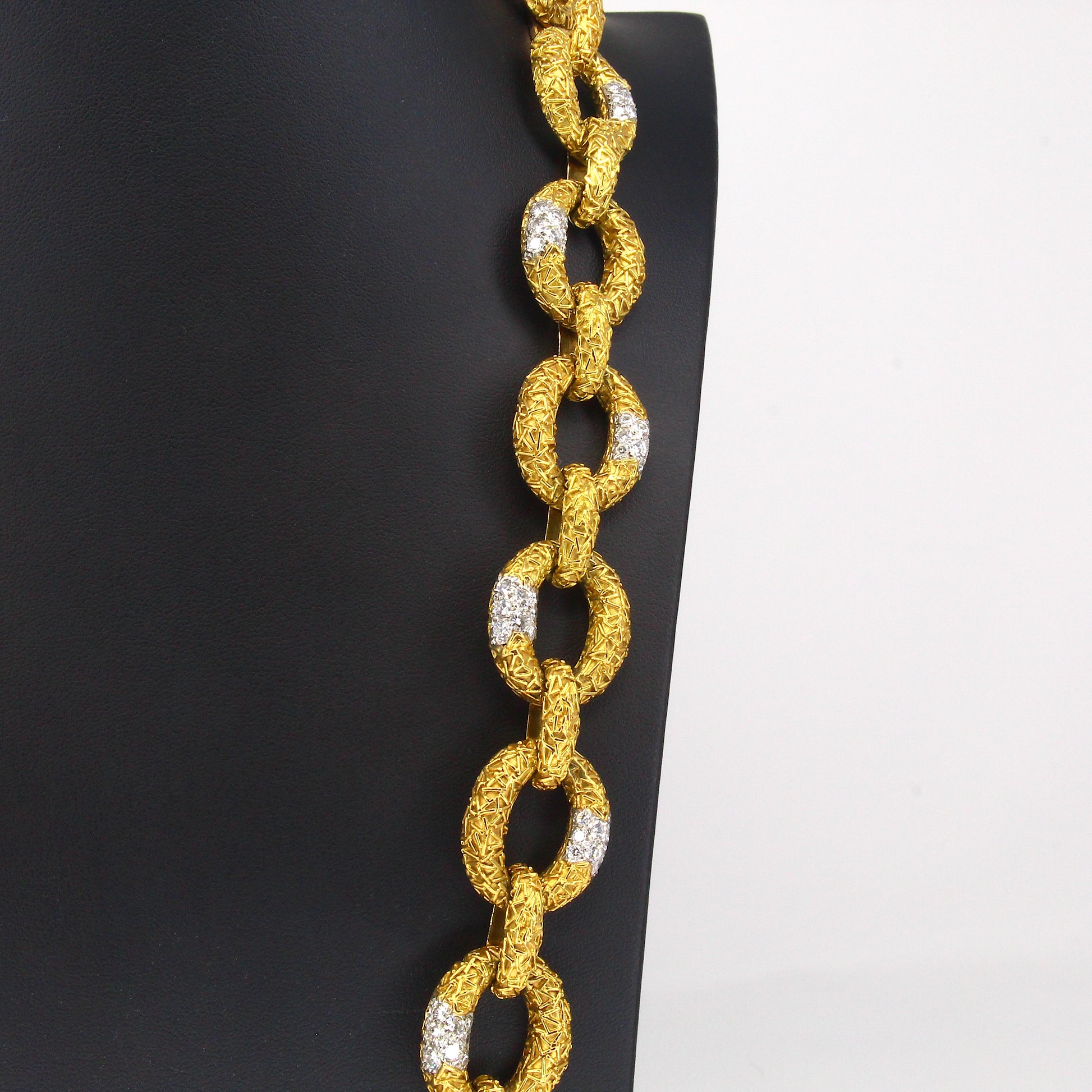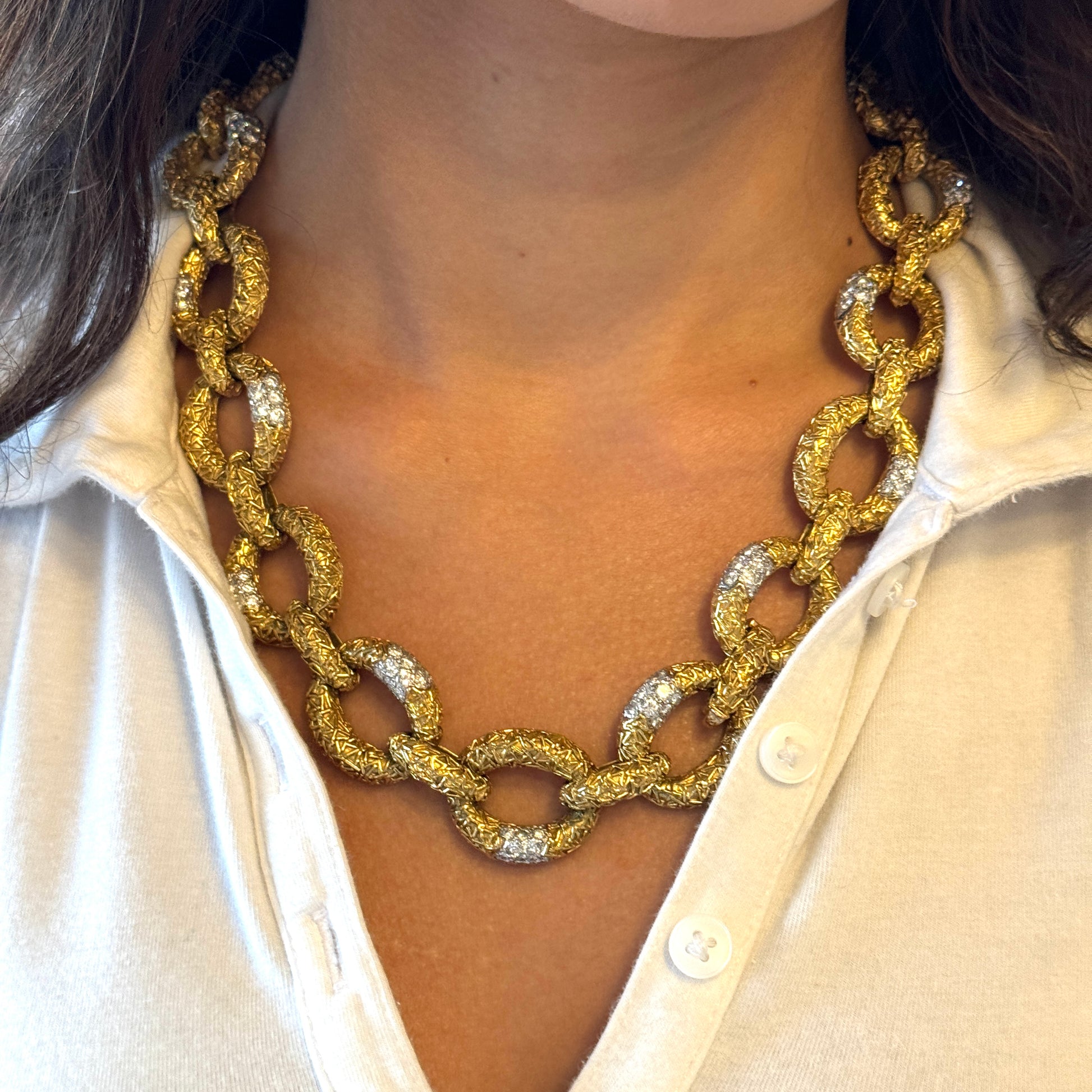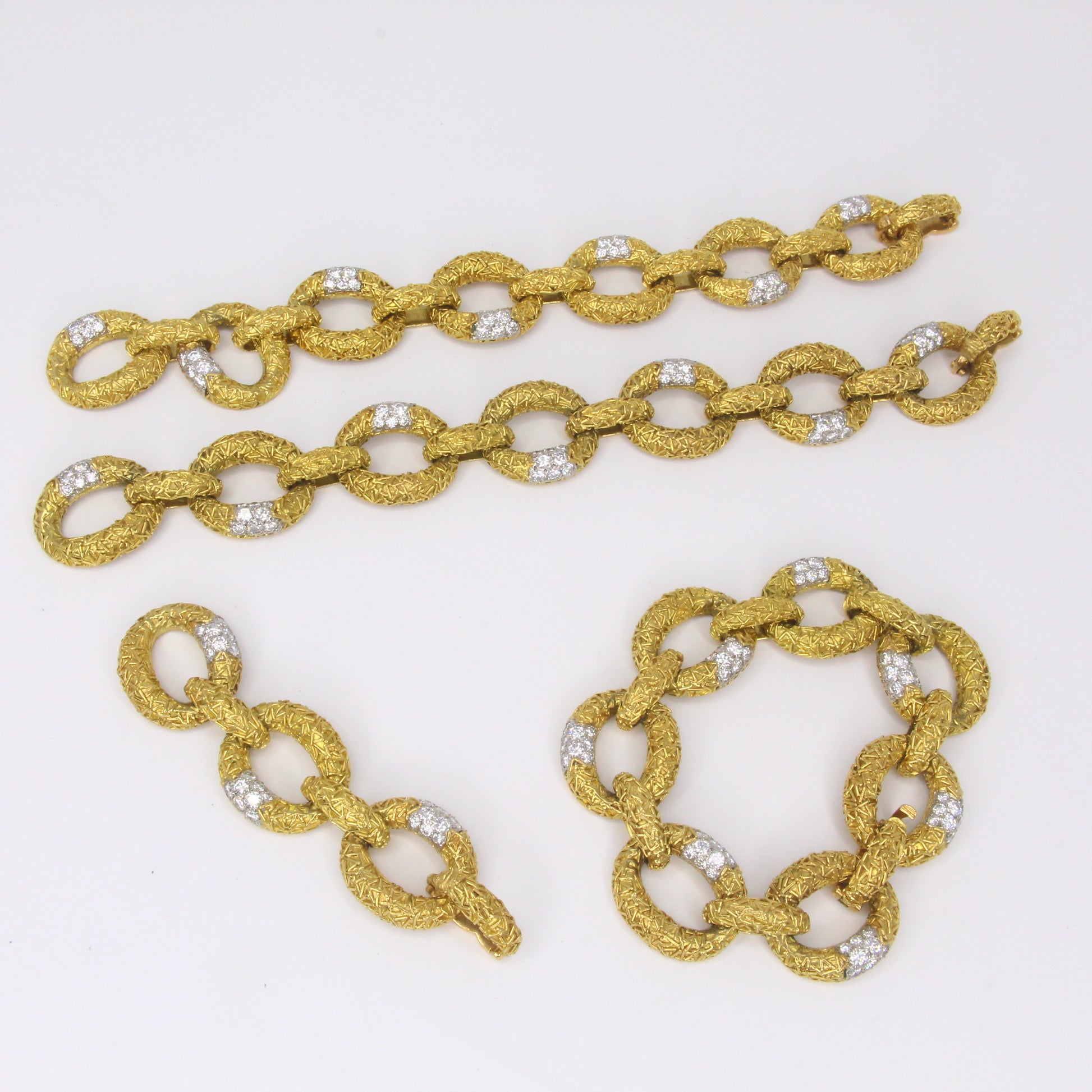 This original Van Cleef & Arpels Chevalerie set from France is a rare and highly collectible example of the house’s craftsmanship. Comprising a convertible necklace, three matching bracelets, a link extender, and a coordinating brooch, the set totals over 314 grams of 18K yellow gold and platinum and is set with approximately 16 carats of natural white diamonds. Each piece is fully hallmarked, numbered, and offers the flexibility to be worn in multiple configurations, making it both a statement of luxury and a versatile addition to any fine jewelry collection.