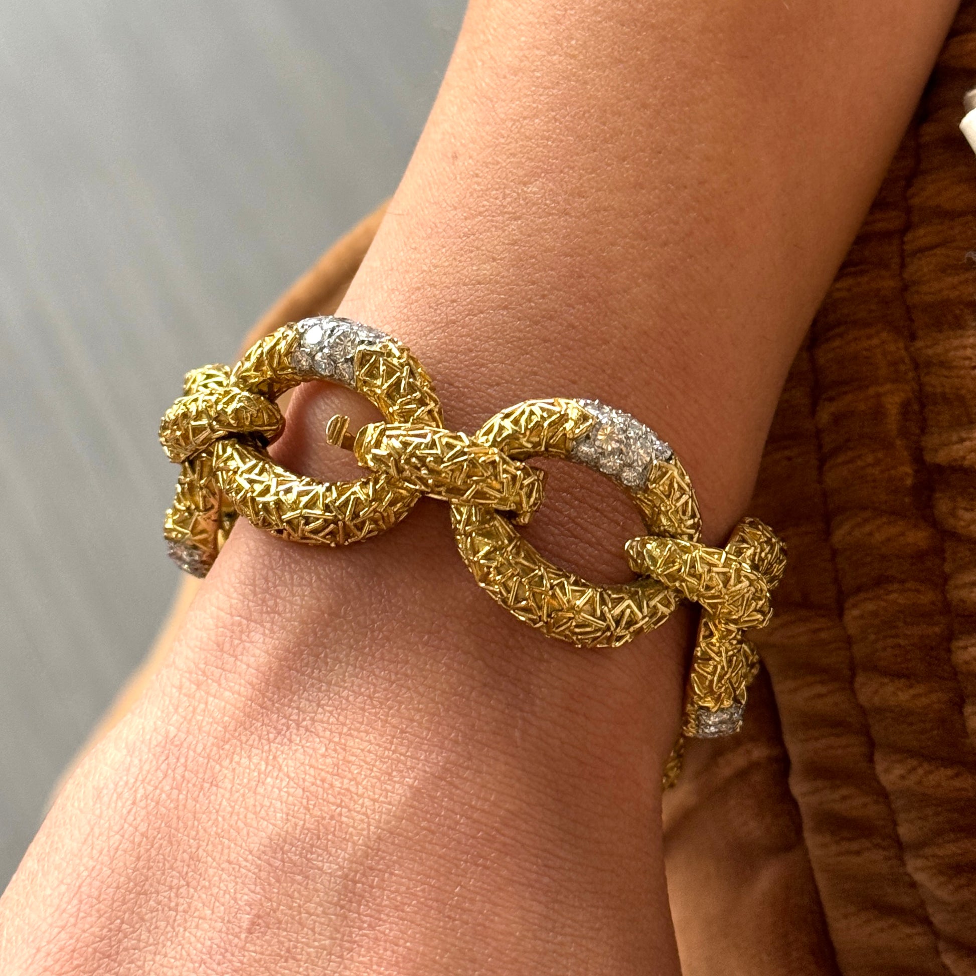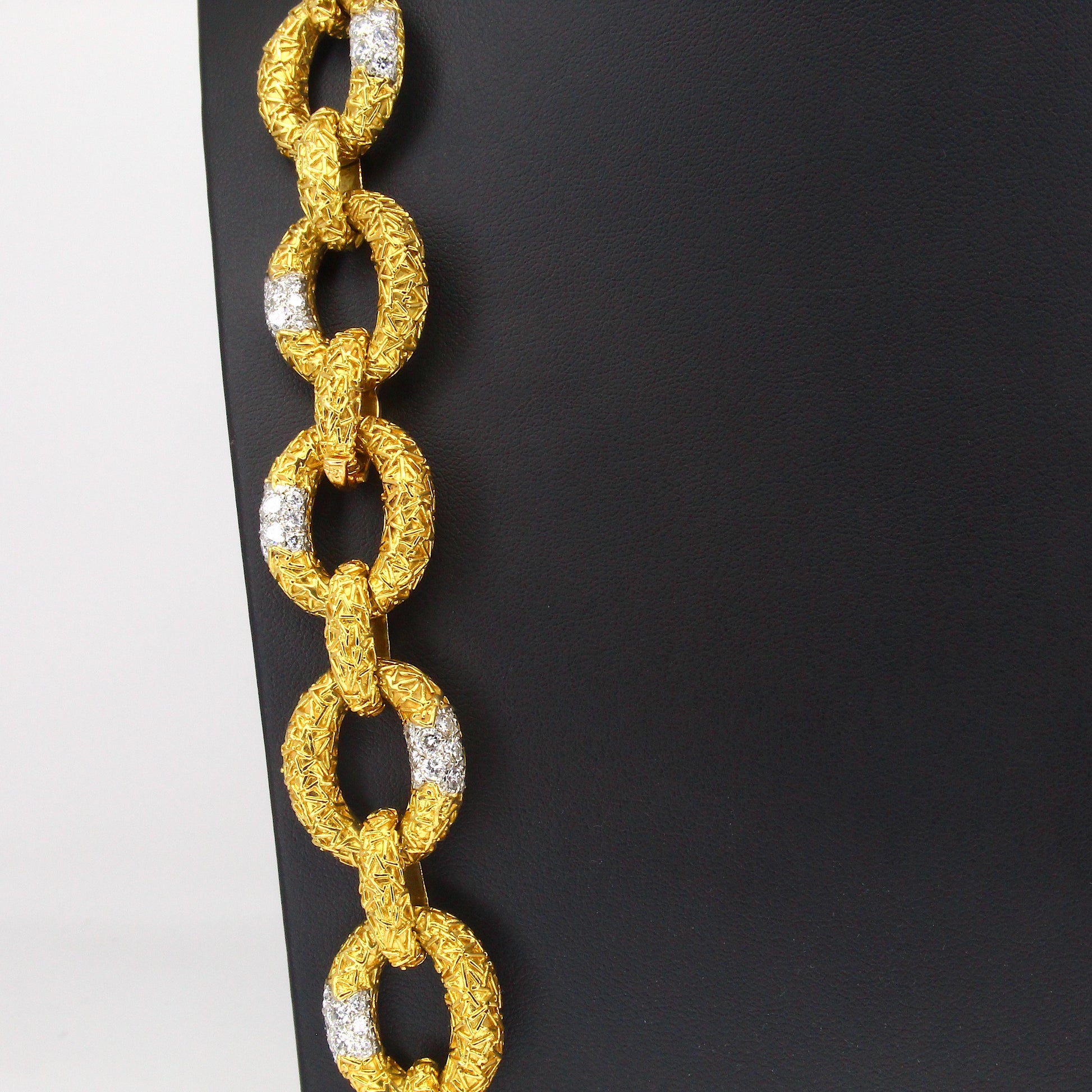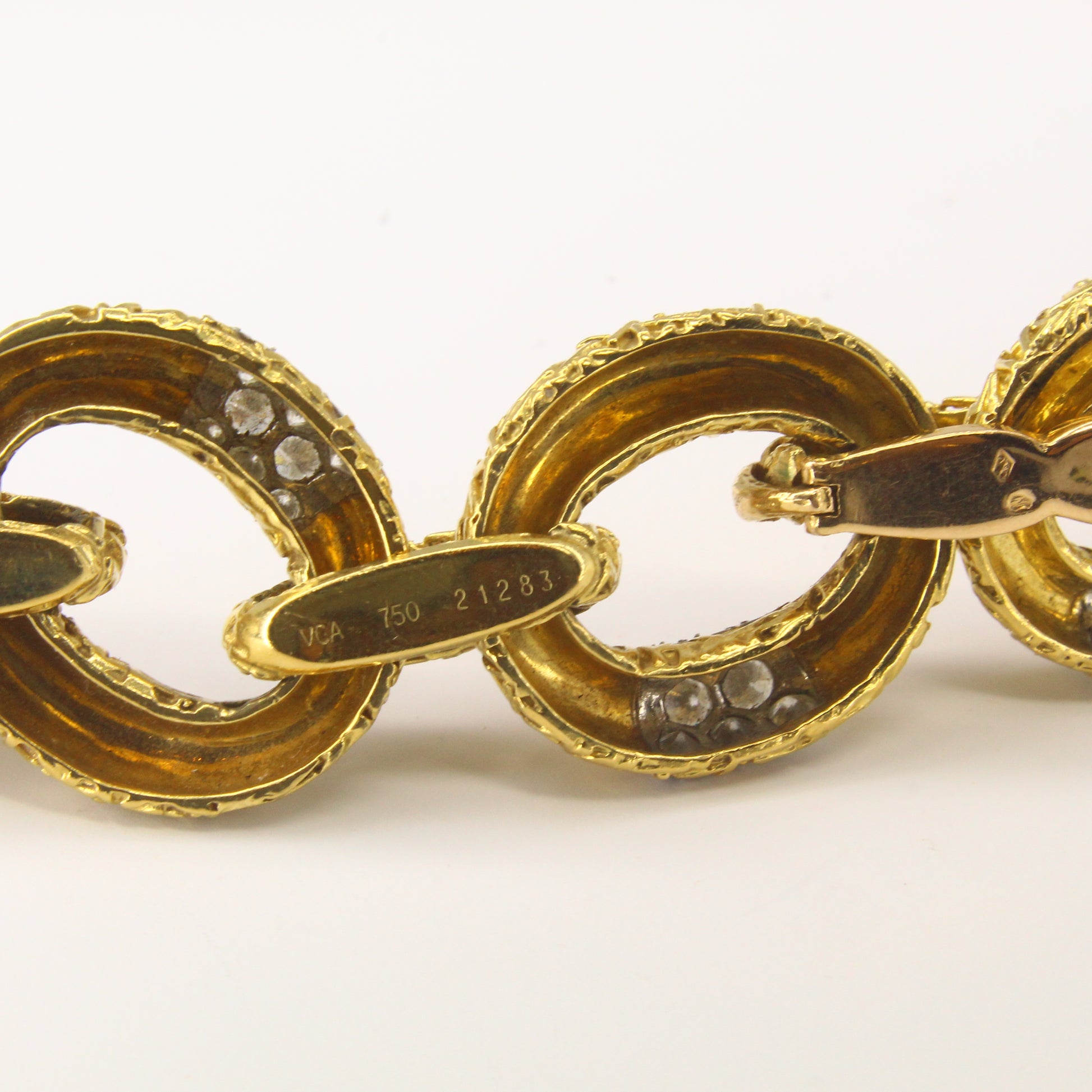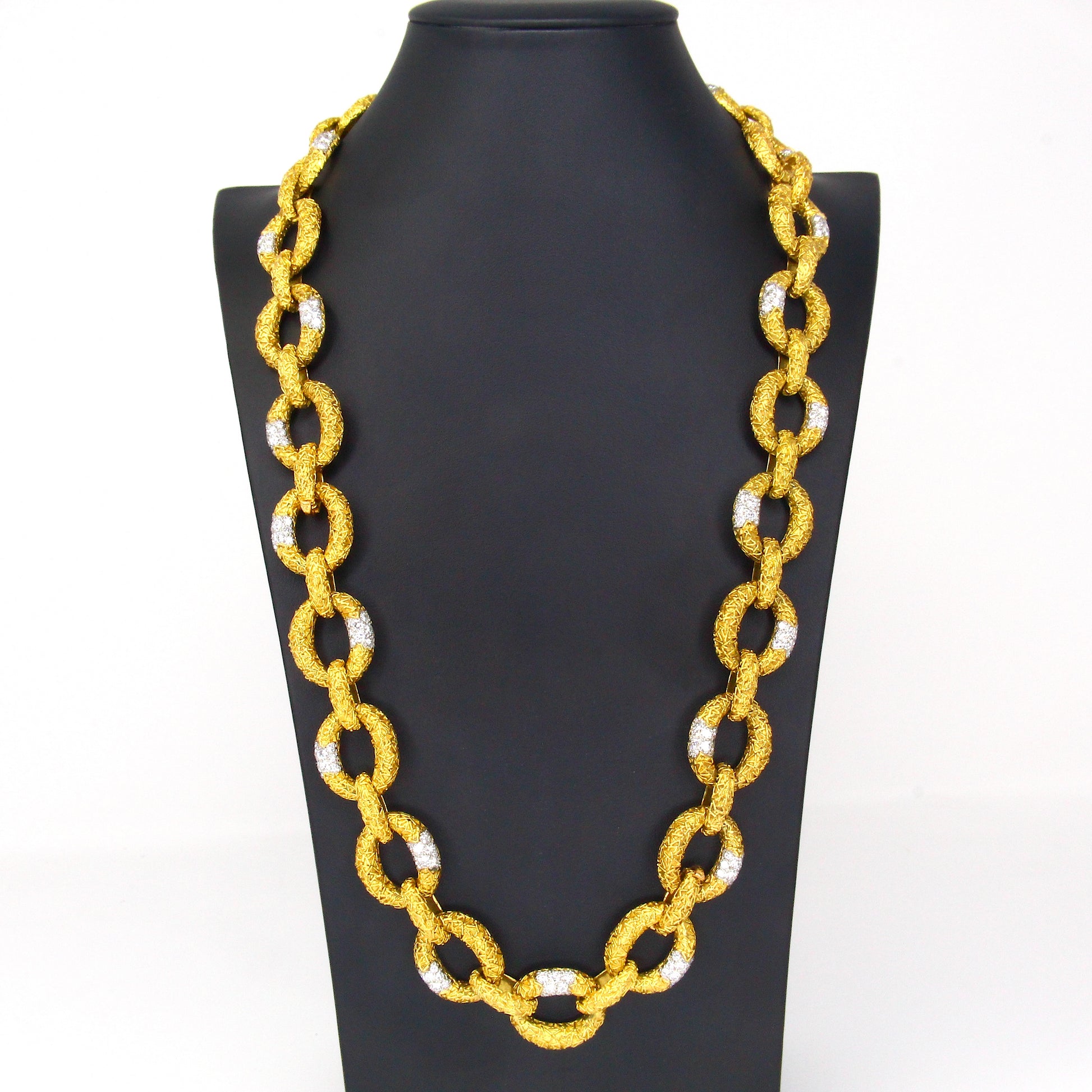 This original Van Cleef & Arpels Chevalerie set from France is a rare and highly collectible example of the house’s craftsmanship. Comprising a convertible necklace, three matching bracelets, a link extender, and a coordinating brooch, the set totals over 314 grams of 18K yellow gold and platinum and is set with approximately 16 carats of natural white diamonds. Each piece is fully hallmarked, numbered, and offers the flexibility to be worn in multiple configurations, making it both a statement of luxury and a versatile addition to any fine jewelry collection.