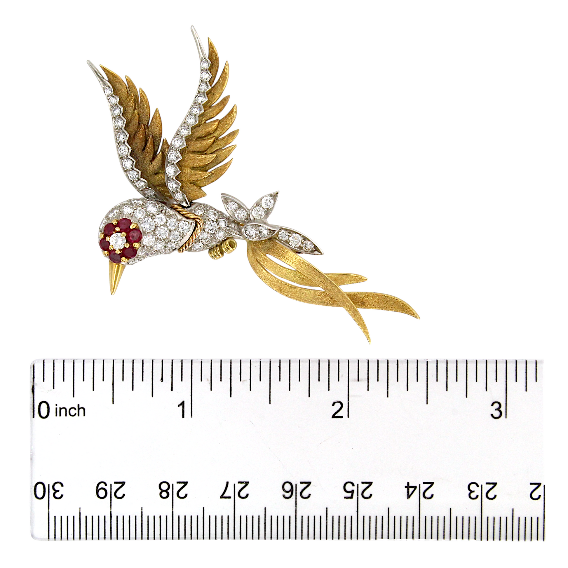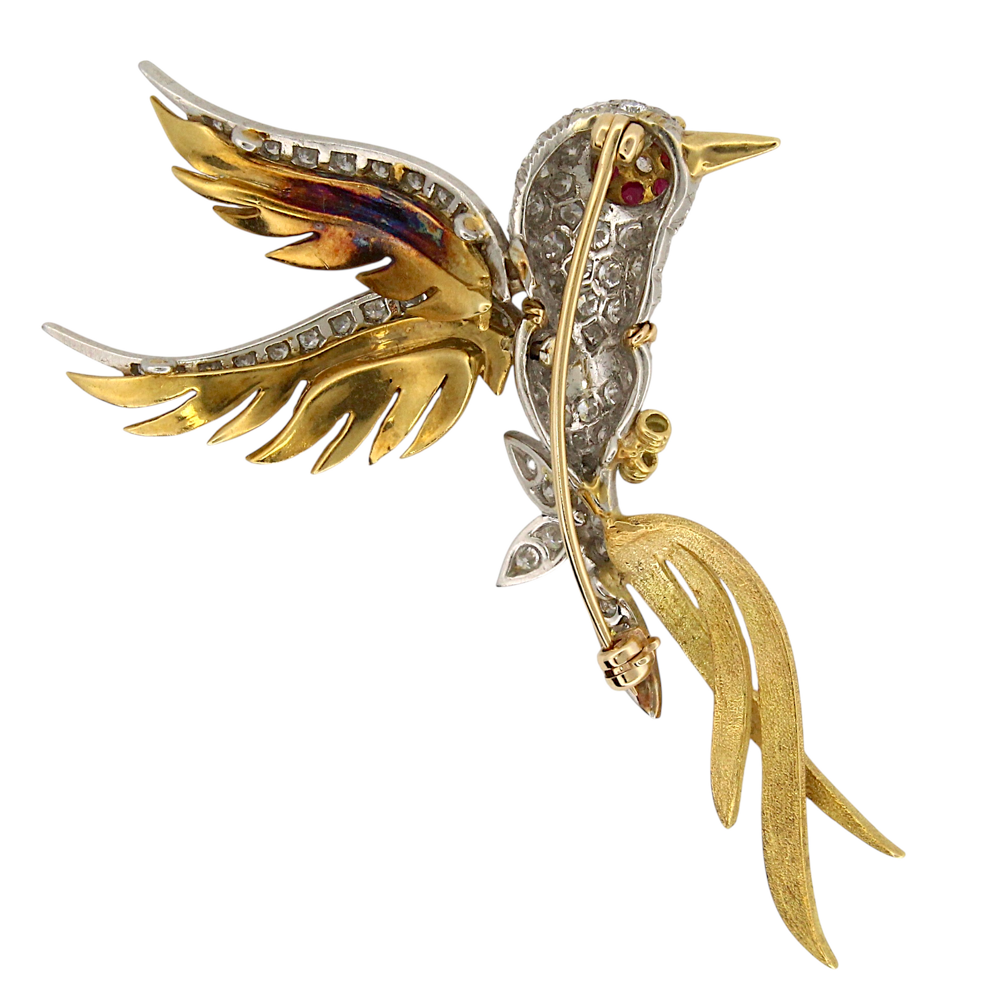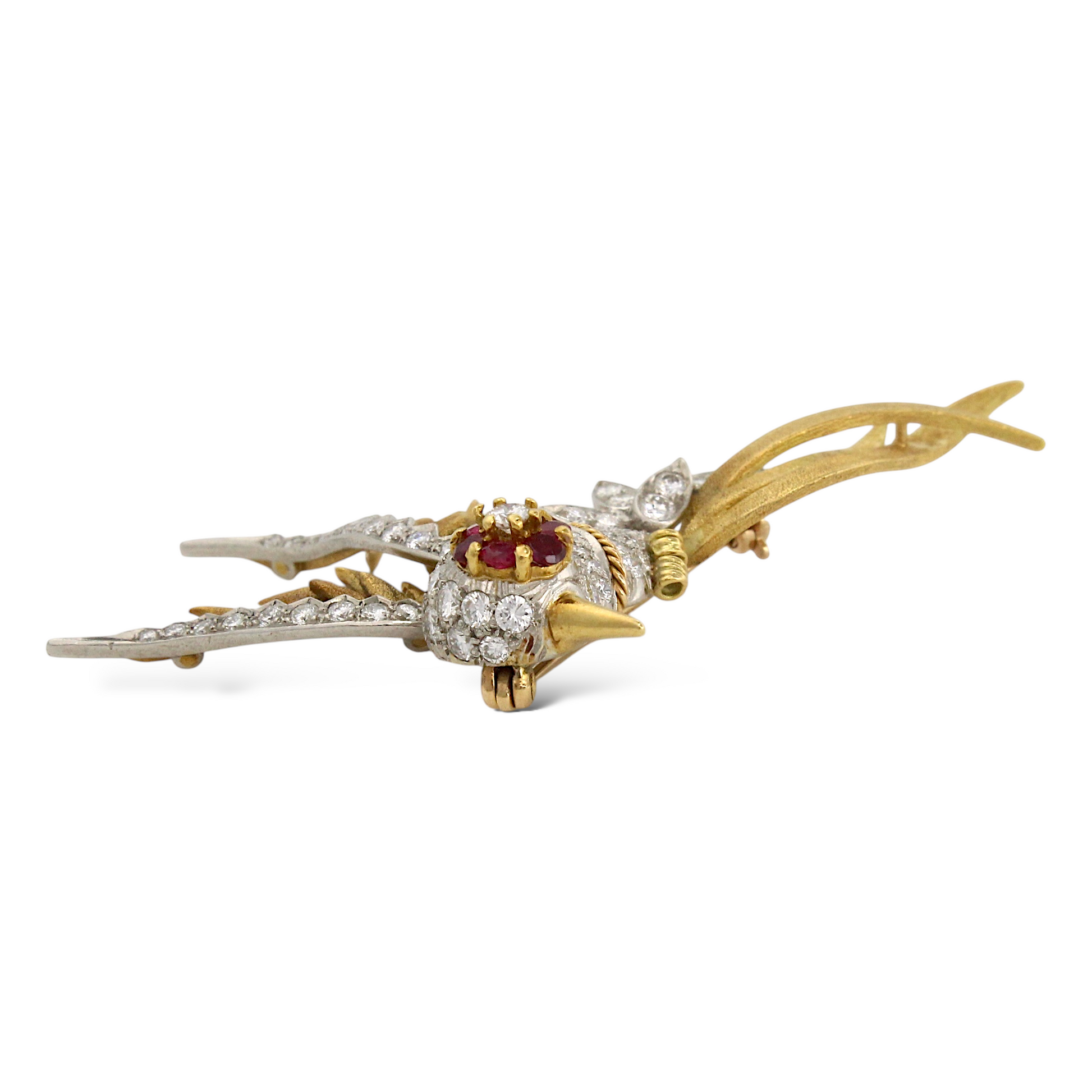 This beautifully crafted vintage bird brooch is designed in 18K yellow and platinum, featuring a lively combination of natural diamonds and vivid red rubies. The brooch showcases intricate texturing and elegant movement through its sculpted wings and elongated tail design.
