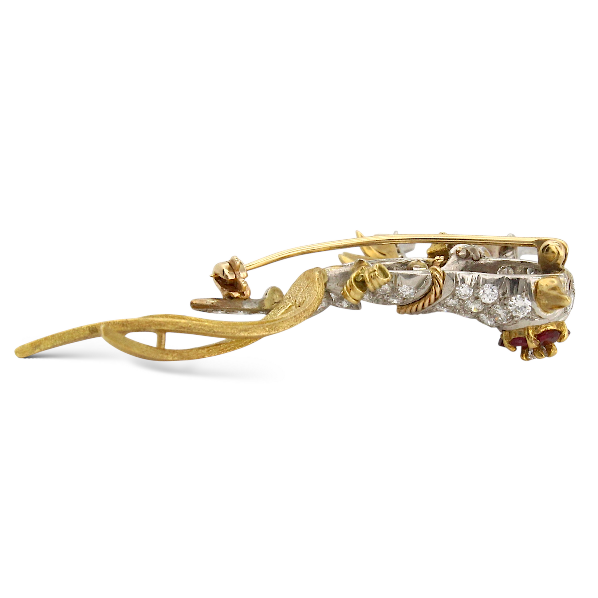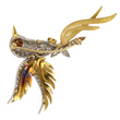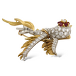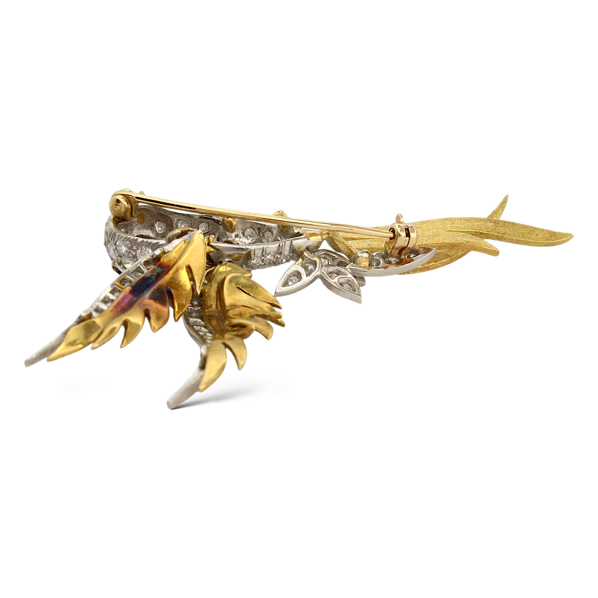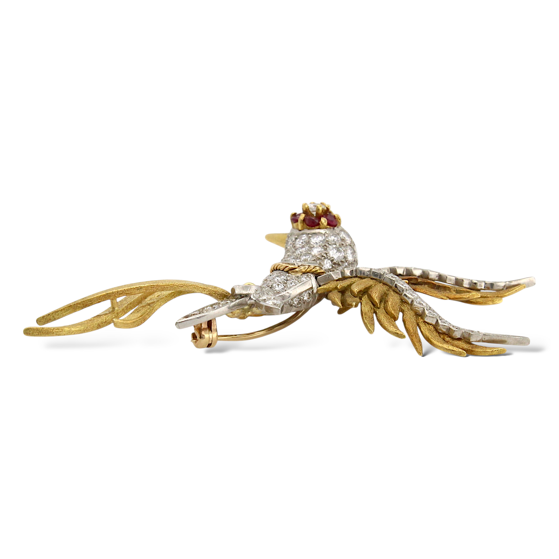 This beautifully crafted vintage bird brooch is designed in 18K yellow and platinum, featuring a lively combination of natural diamonds and vivid red rubies. The brooch showcases intricate texturing and elegant movement through its sculpted wings and elongated tail design.