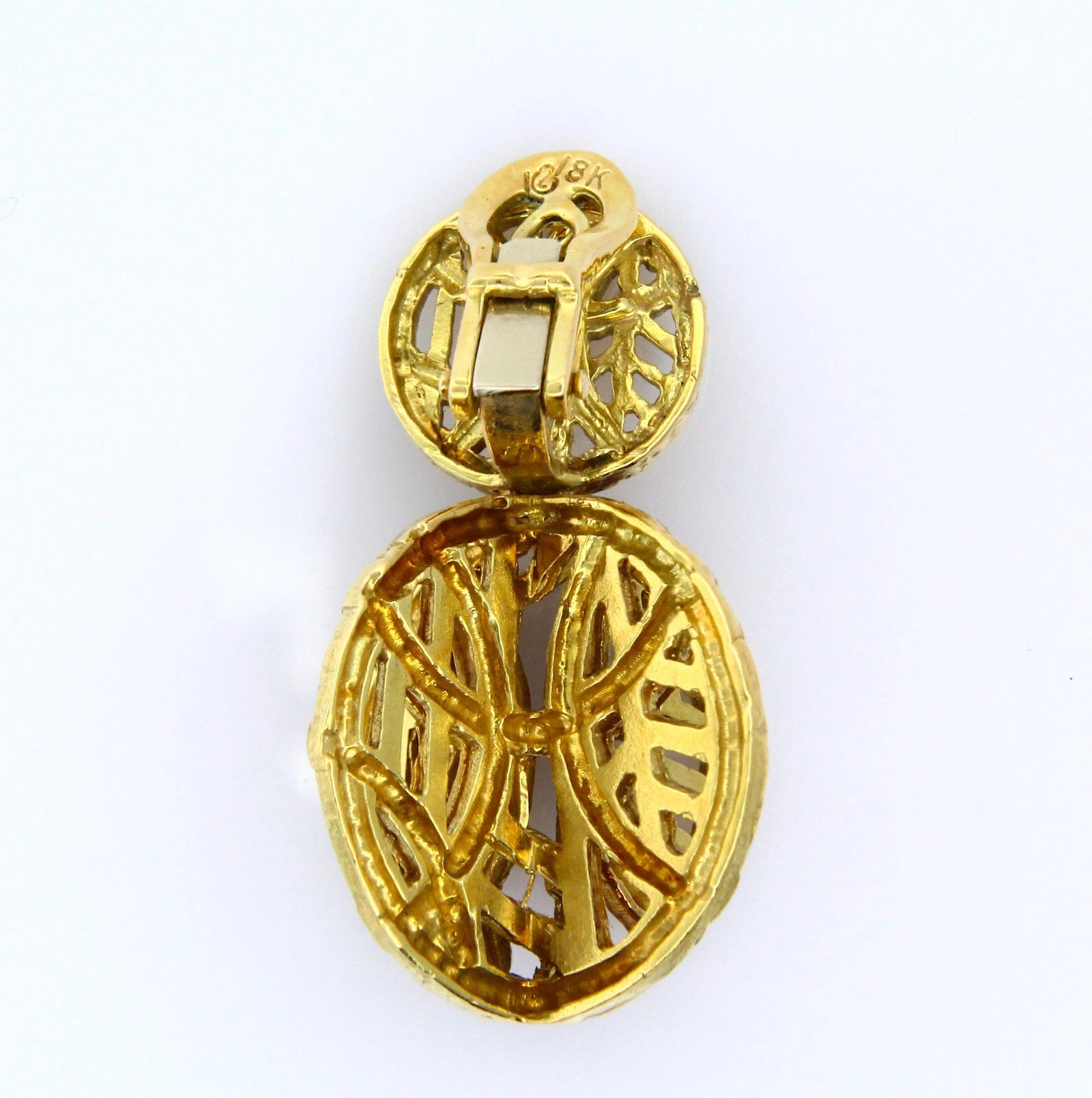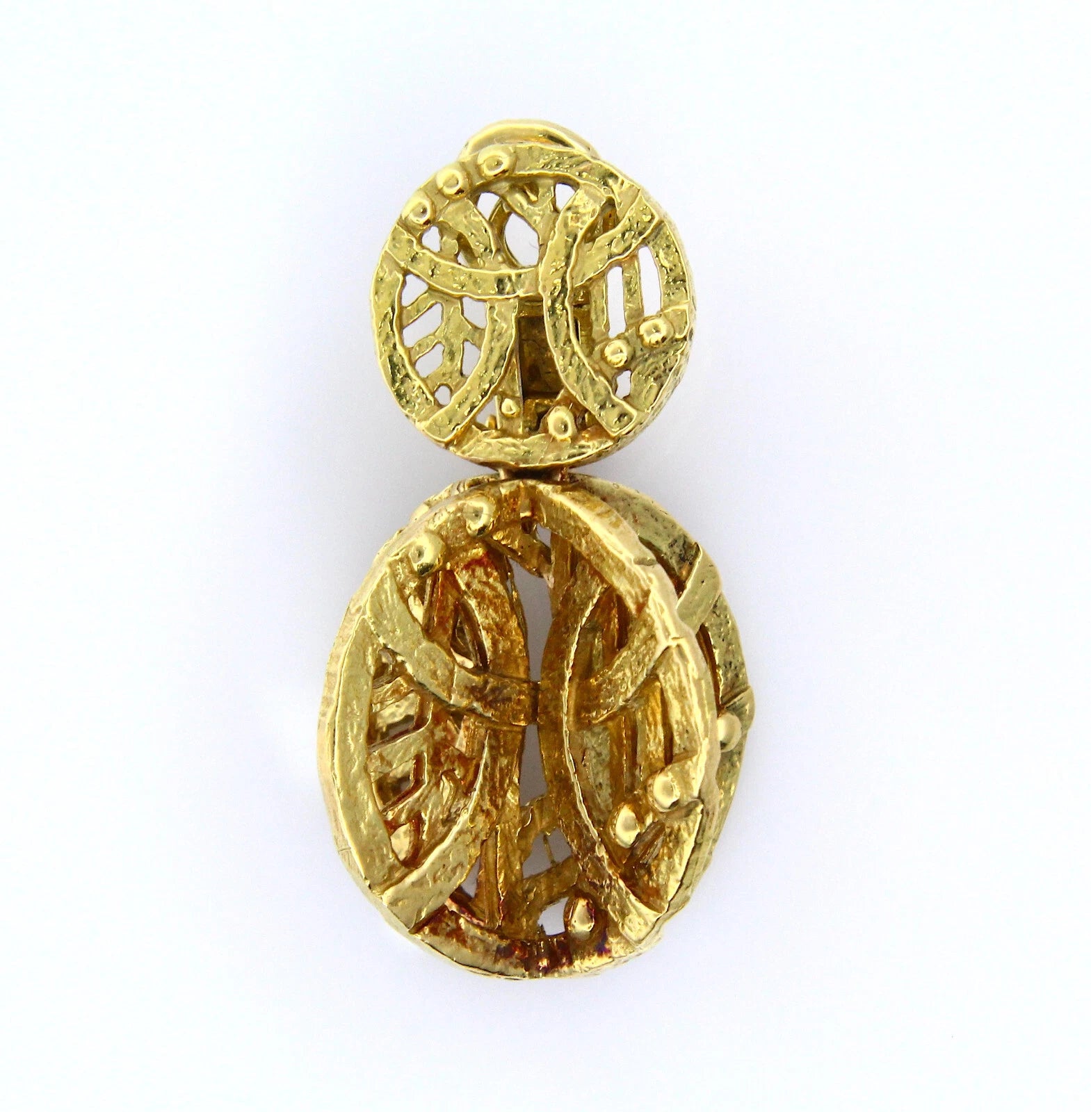 | Materials: 18K Yellow Gold Weight: 20.8 grams Measurements: Approximately 34.2 mm tall x 20.7mm wide |